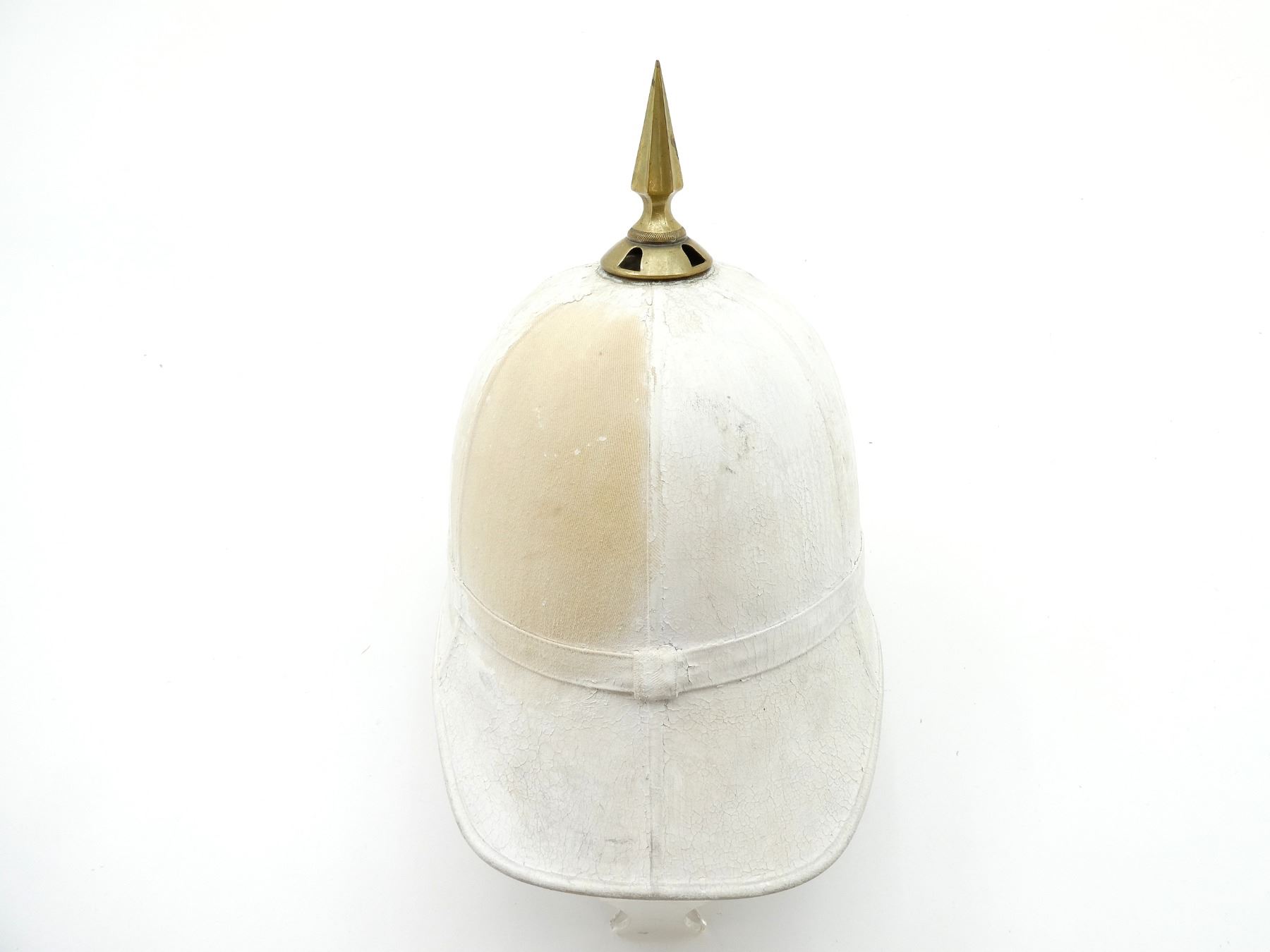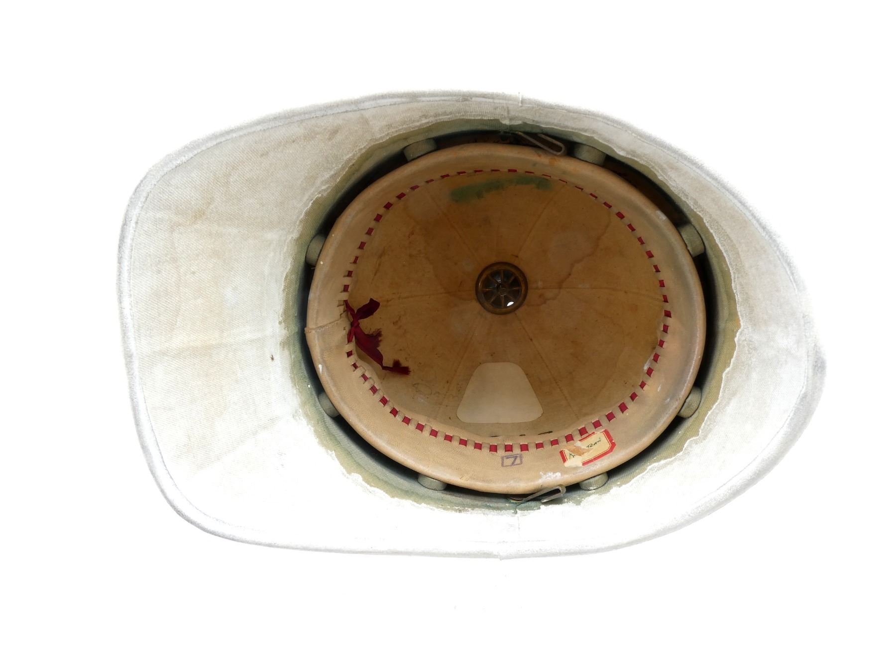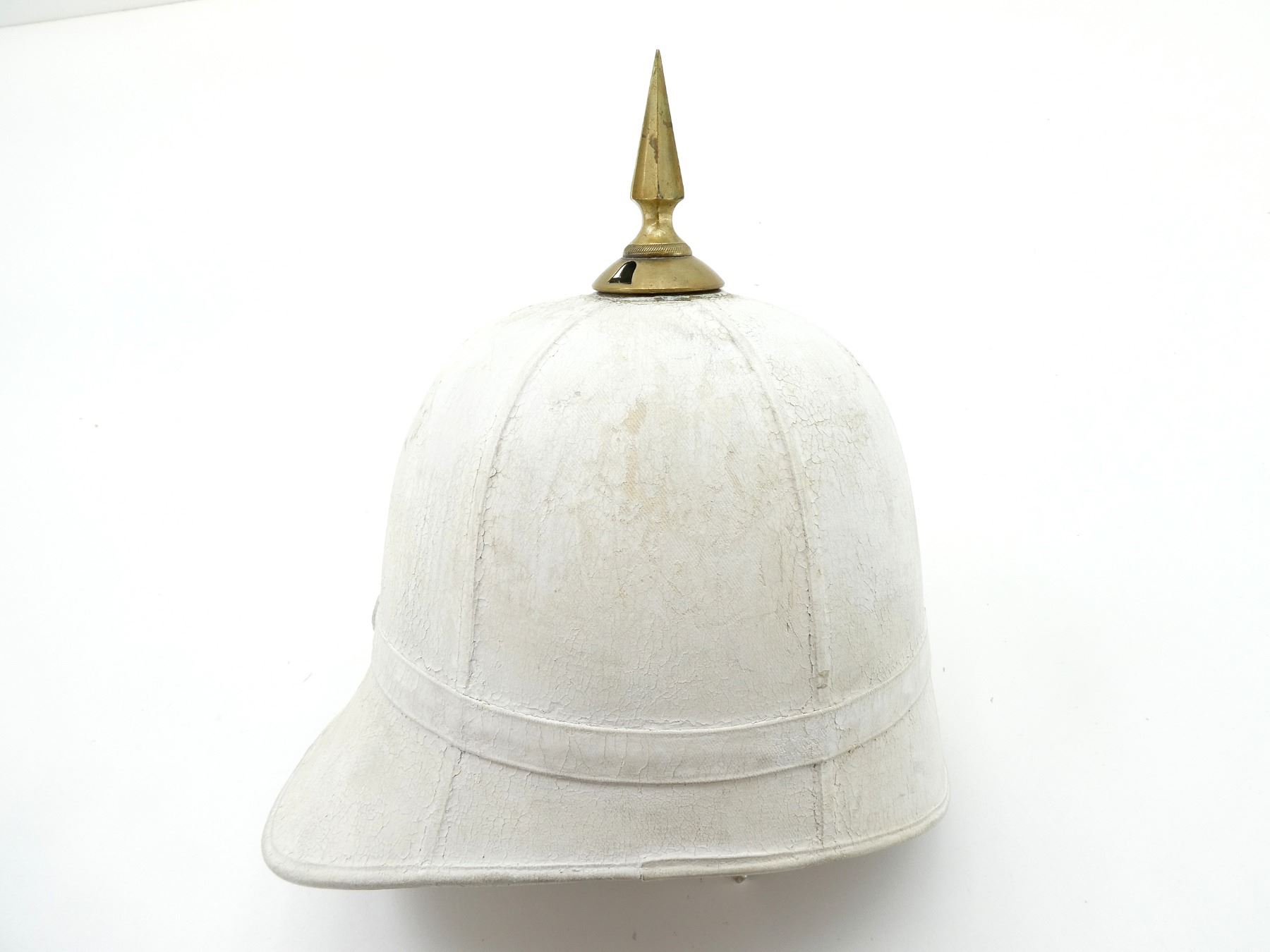 (1) WHITE PAINTED CANVAS / FIBER PITH HELMET WITH BRASS SPIKE ON TOP OF HELMET, LEATHER WITH RED RIBBON HEAD BAND, LEATHER IS SOFT, TAN CANVAS INSIDE HELMET, FAINTLY INK STAMPED: "WILL??? ?CULLY LIMITED, 120? UNIVERSITY STREET, MONTREAL, 7", "2345", SIZE 7, MISSING CHIN STRAP, SHOWS AGE / WEAR. SEE PHOTOS.