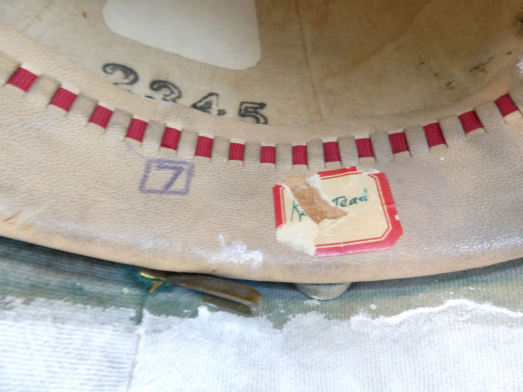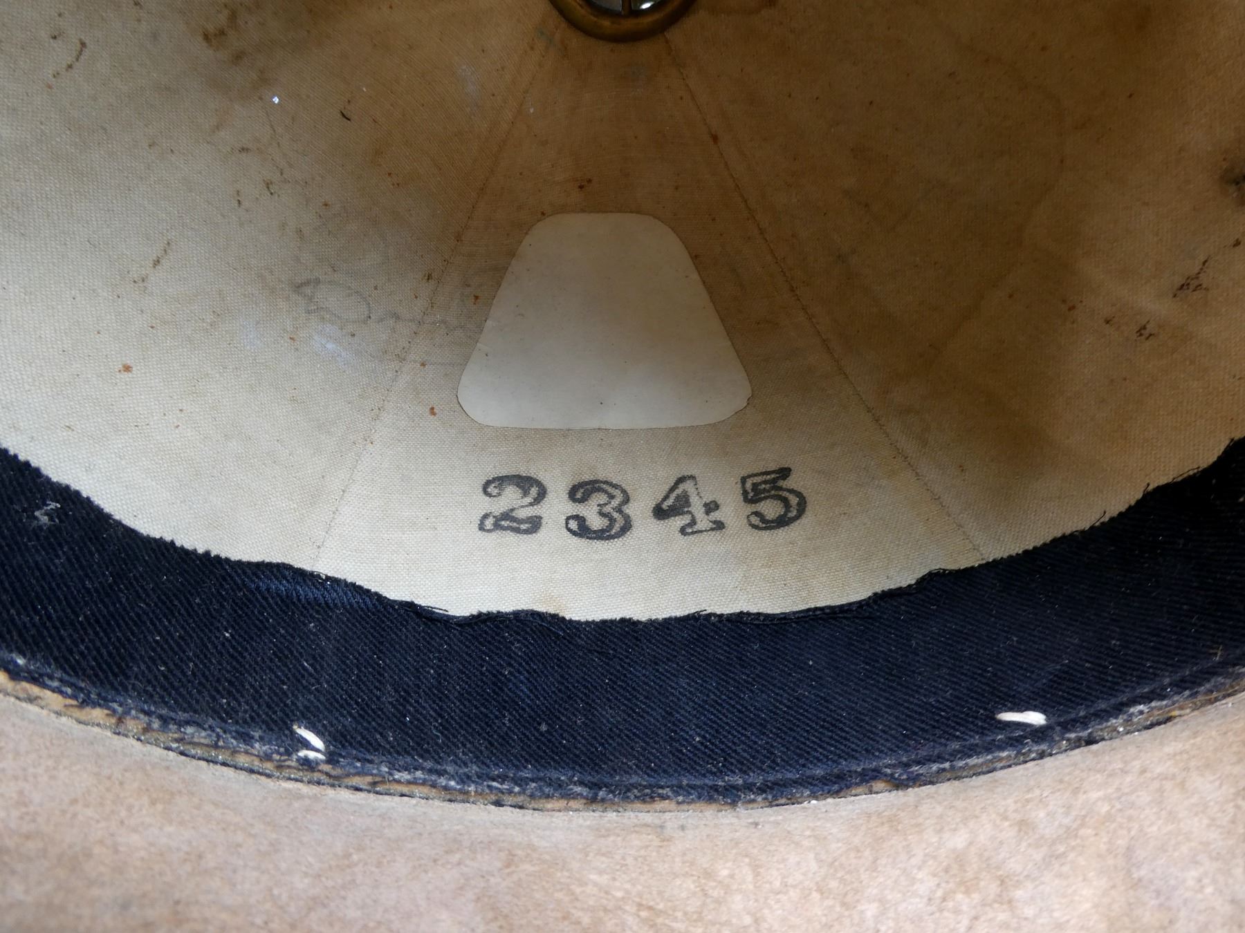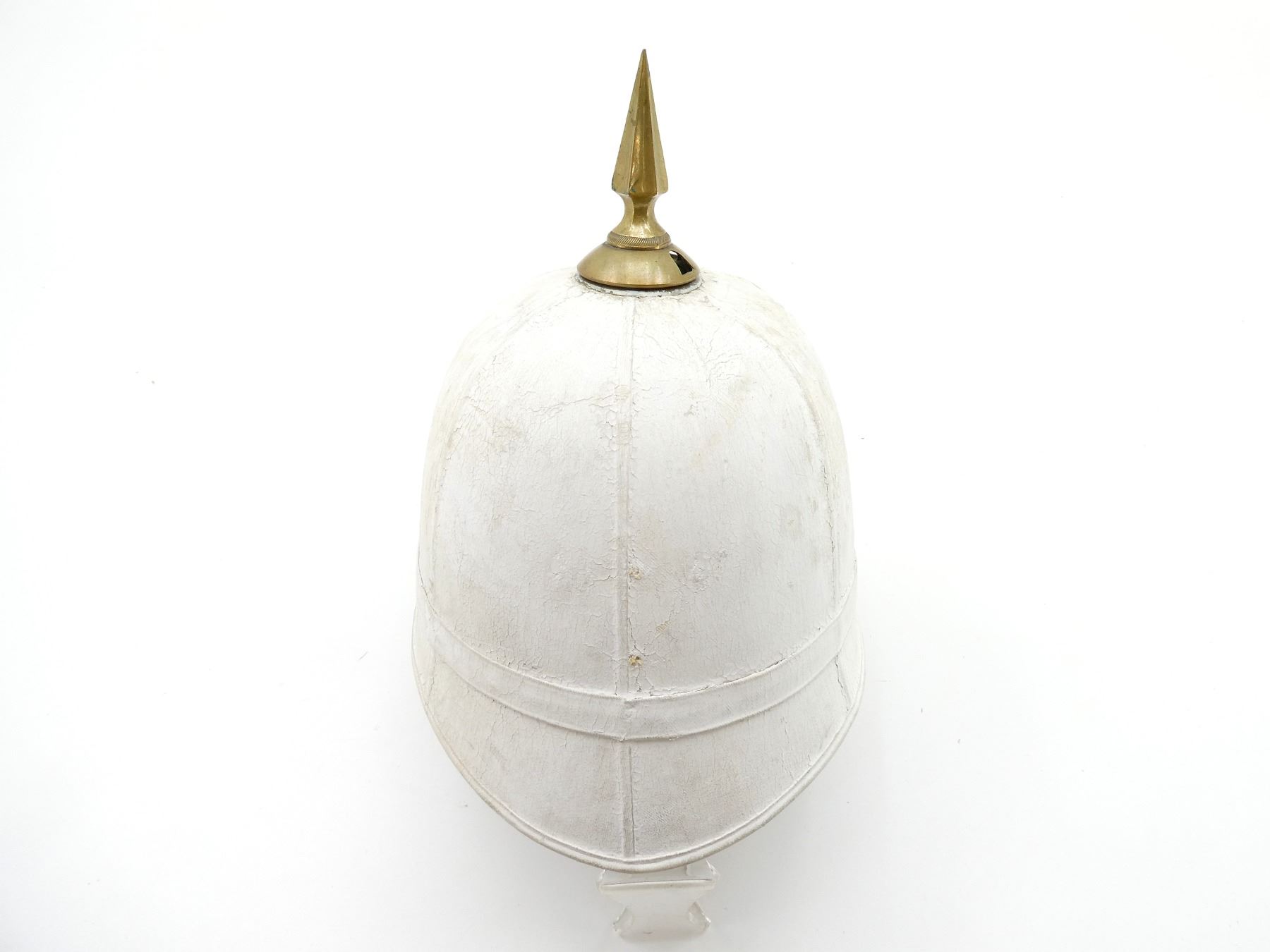 (1) WHITE PAINTED CANVAS / FIBER PITH HELMET WITH BRASS SPIKE ON TOP OF HELMET, LEATHER WITH RED RIBBON HEAD BAND, LEATHER IS SOFT, TAN CANVAS INSIDE HELMET, FAINTLY INK STAMPED: "WILL??? ?CULLY LIMITED, 120? UNIVERSITY STREET, MONTREAL, 7", "2345", SIZE 7, MISSING CHIN STRAP, SHOWS AGE / WEAR. SEE PHOTOS.