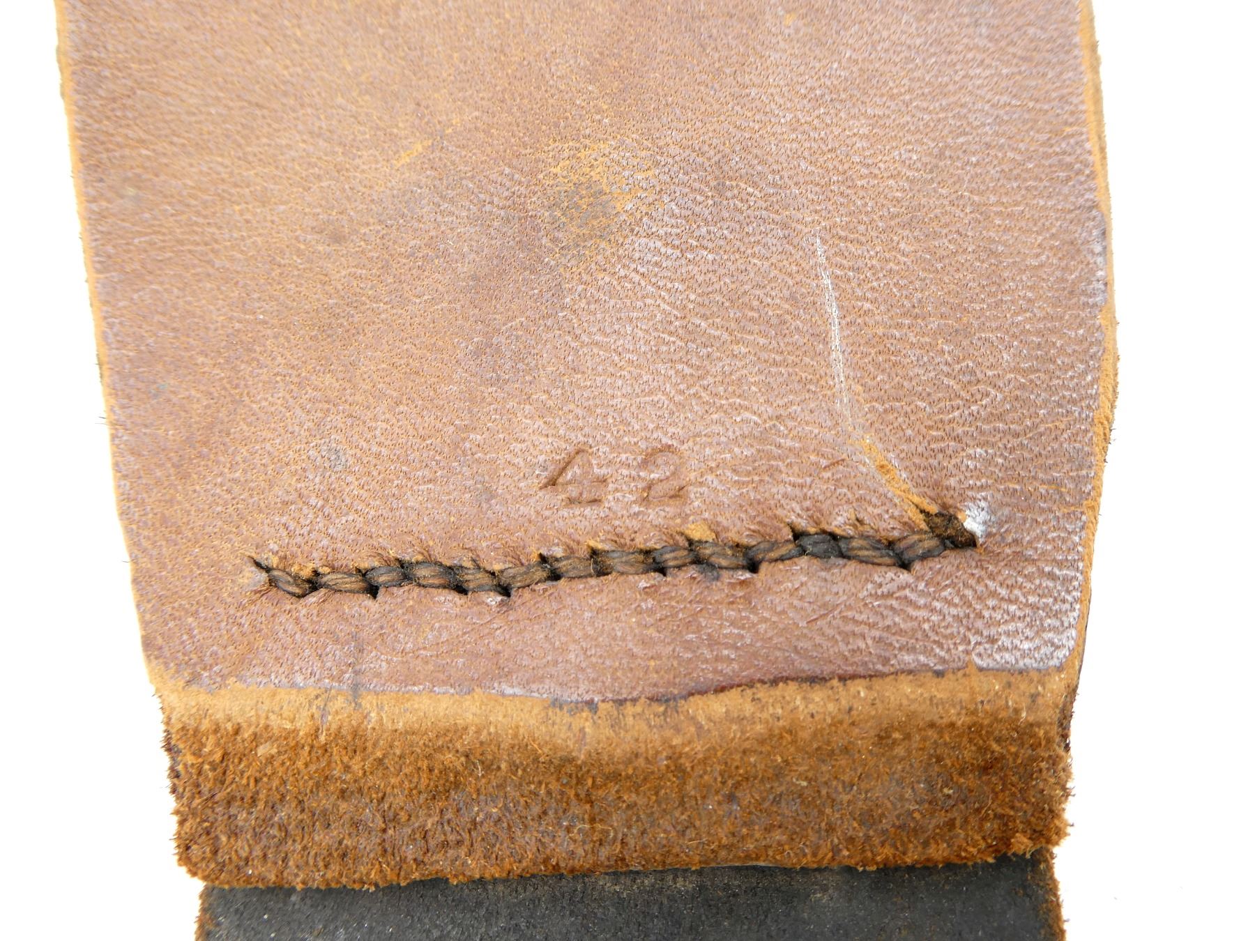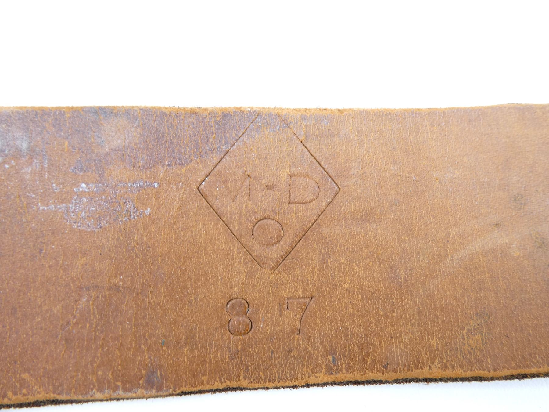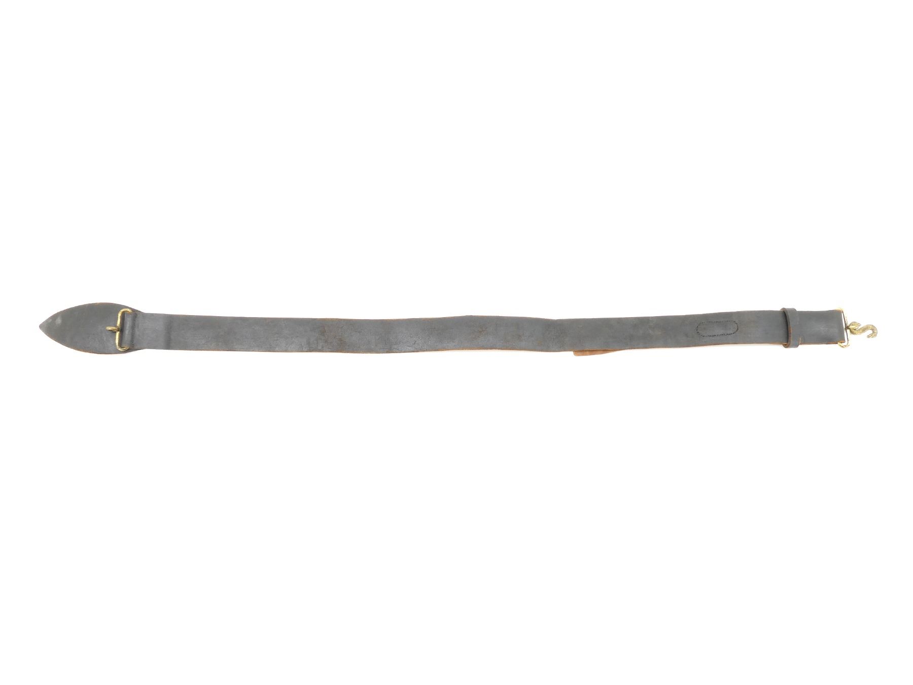 (1) BLACKENED LEATHER SNAKE BELT WITH BRASS FITTINGS, LEATHER IS SOFT, MARKED: "M-D, O" IN A DIAMOND SHAPE OVER "87", "42 (SIZING)", SNAKE BUCKLE MARKED: "CANADA", MISSING PIECE TO HOLD LEATHER STRAP IN PLACE, SHOWS AGE / WEAR / SLIGHT TEAR, OVERALL LENGTH APPROX. 44.5", ADJUSTABLE. SEE PHOTOS.