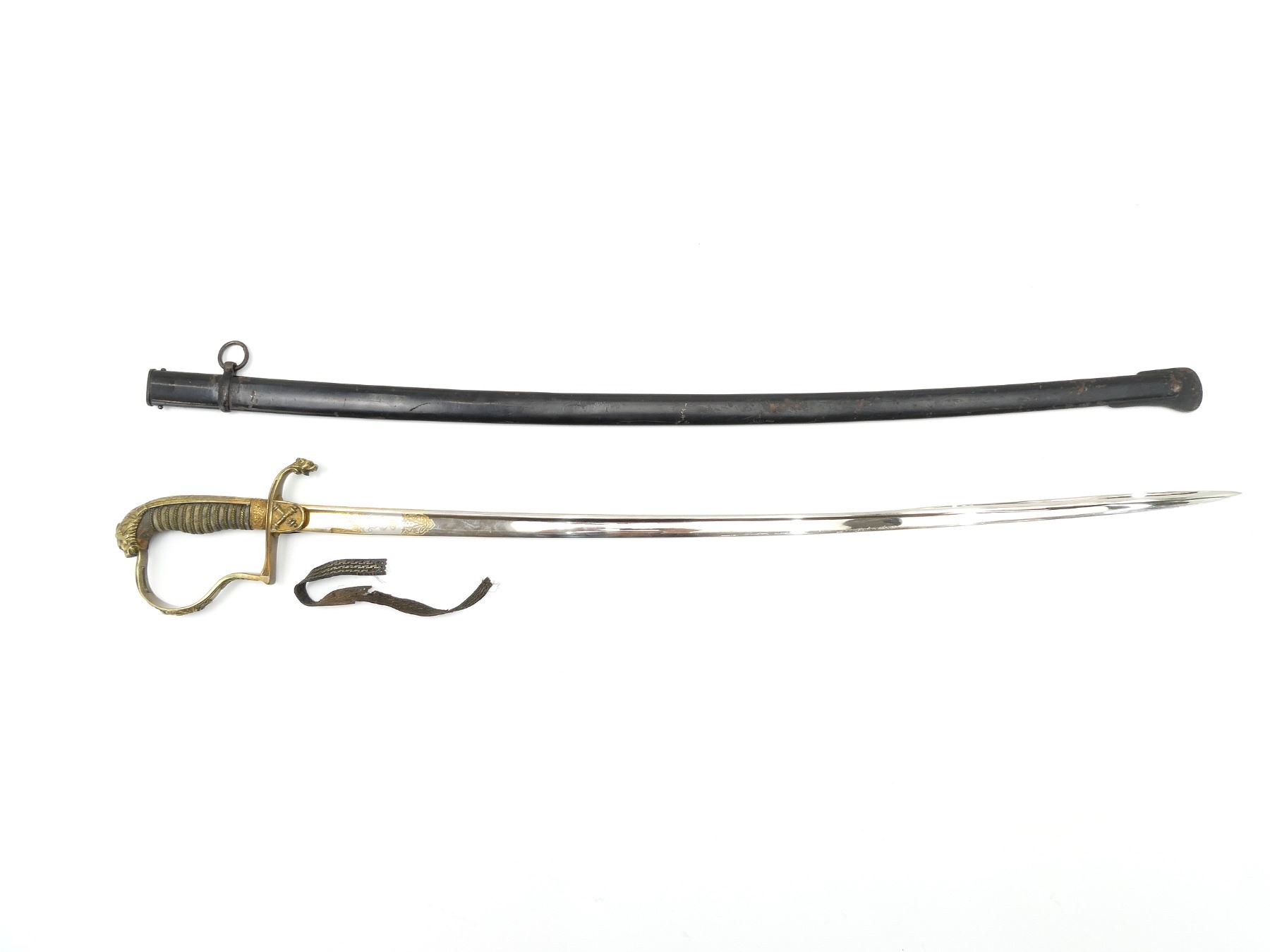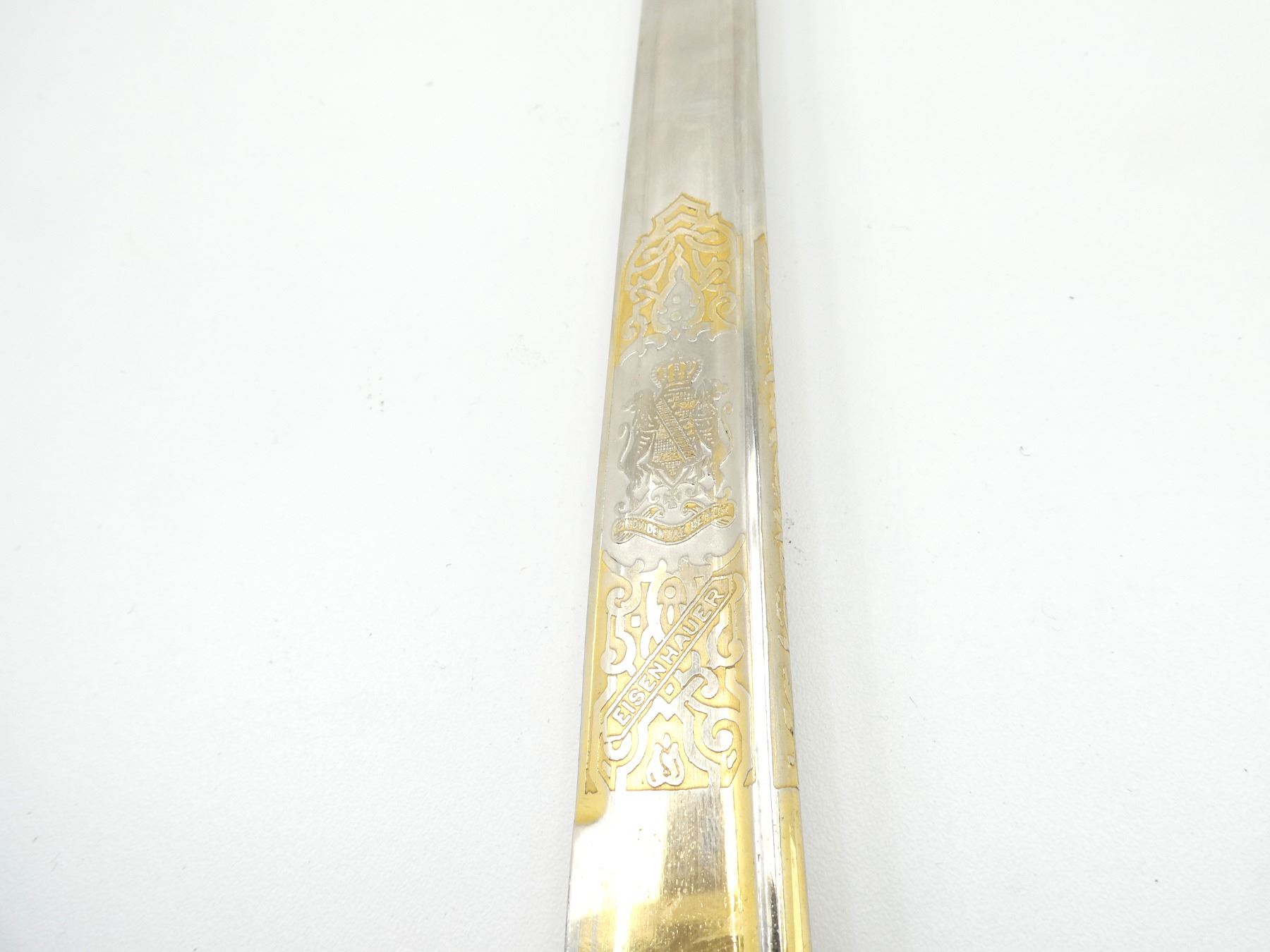 (1) SLIGHTLY CURVED BLADE, DOUBLED-EDGED NEAR TIP, BLADE ETCHED / GILDED ROYAL CYPHER CROWN OVER "FAR" (KING FRIEDRICH AUGUST III 1904-1918) WITH VARIOUS DECORATIVE ETCHINGS, OTHER-SIDE RICASSO MARKED WITH TWO SEATED SQUIRRELS BACK-TO-BACK OVER "C.E.", BLADE ETCHED / GILDED CROWN OVER ROYAL COAT OF ARMS WITH MOTTO "PROVIDENTAE MEMOR" OVER "EISENHAUER" WITH VARIOUS DECORATIVE ETCHINGS, BRASS CROSS-PIECE WITH SHEATH-GUARD WINGS / LANGUETS, DECORATED ON FRONT SIDE WITH CROSSED CANNONS, OTHER-SIDE WITH SHIELD LIKE SHAPE, QUILLON SHAPED AS A LION'S HEAD, BAND UNDER CROSS-PIECE WITH DECORATIVE FLORAL DESIGNS, HILT / GUARD WITH ROYAL COAT OF ARMS UNDER CROWN, BLACK BRASS WIRE WRAPPED GRIP, PIECE OF LEATHER PORTAPEE REMAINS, POMMEL SHAPED AS LION'S HEAD WITH RED EYES, BRASS DECORATIVE BACKING ON GRIP, BLACK PAINTED METAL SCABBARD, UNDER THROAT MARKED: "30. A. 427", ONE HANGER LOOP, BLADE APPROX. 32" & OVERALL LENGTH APPROX. 37.5". SEE PHOTOS.
