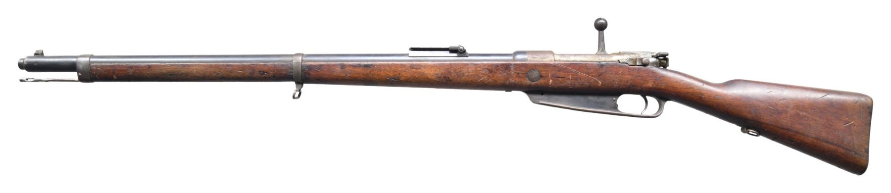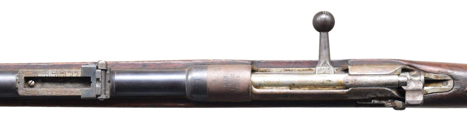Cal. 8x57. S# 3809d. Bbl. 29". Blade front sight. Ladder rear sight graduated to 2050m. Matching numbers on receiver, bbl. jacket, bottom of stock, floorplate & bolt body. Other parts mismatched including small bolt parts. Firing pin clipped, extractor & bolt head both missing. No unit markings present. Receiver top has 1889 date with Danzig & crown markings. Left side of receiver has early "G. MOD 88" markings. Buttplate has "7" Rastatt depot rework marking. Receiver & the bolt are "in-the-white". Other parts blued. Walnut stock set with faint Imperial markings. Bottom mounted sling swivels with added rear swivel. Cleaning rod present. CONDITION: stock shows a small crack on right side of butt, scattered dings, staining, handling marks & scratches. Receiver, bolt & buttplate are mostly a gray patina with overall oxidation & dried grease. Other metal parts retain a high degree of German arsenal blue with scattered fading to gray & oxidation throughout. Striker assembly not functioning properly when safety is engaged & will require attention to fix. Bore shows scattered oxidation & dried grease but has evident rifling. (01-27024/MJC). ANTIQUE. $300-500.