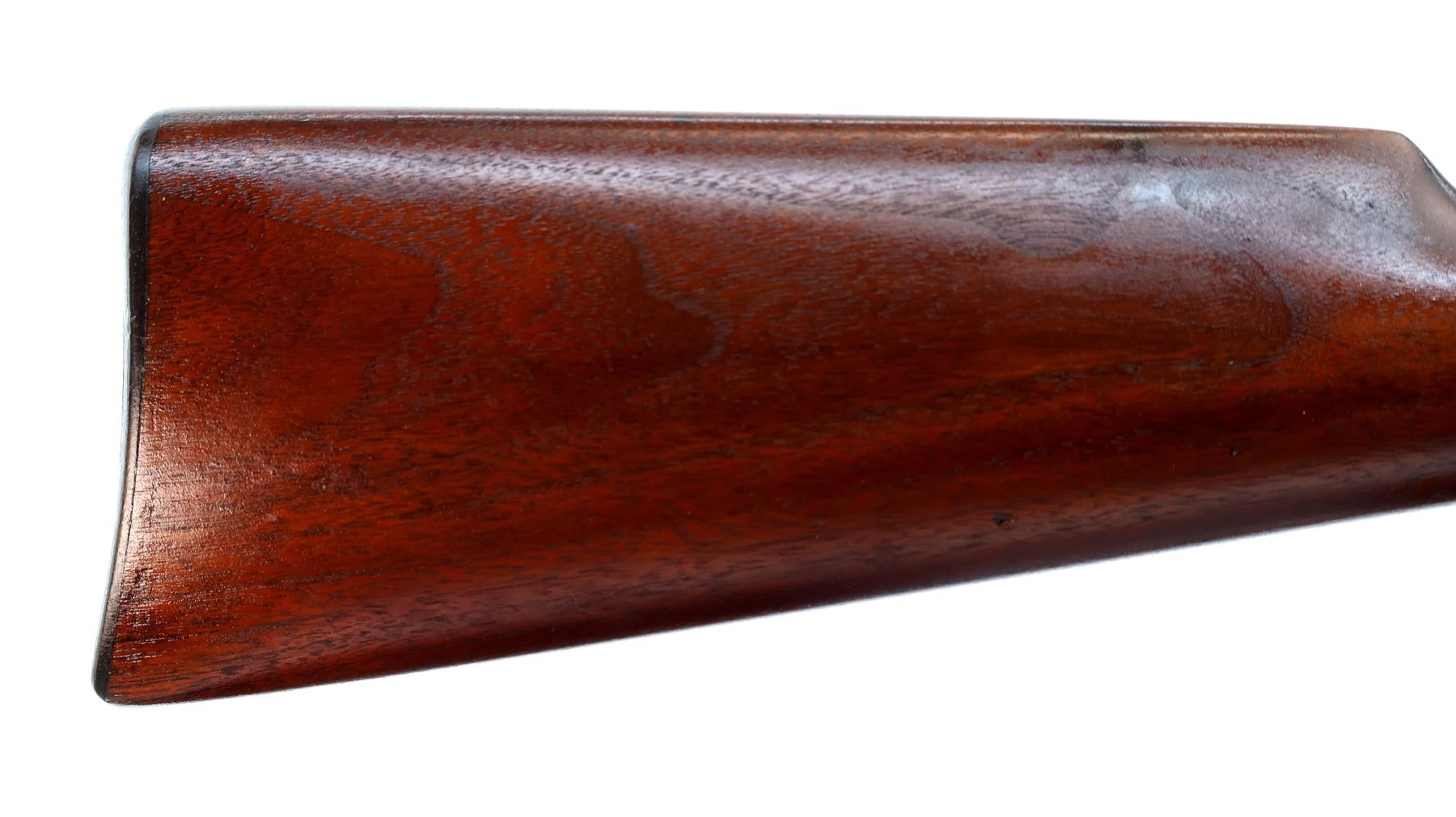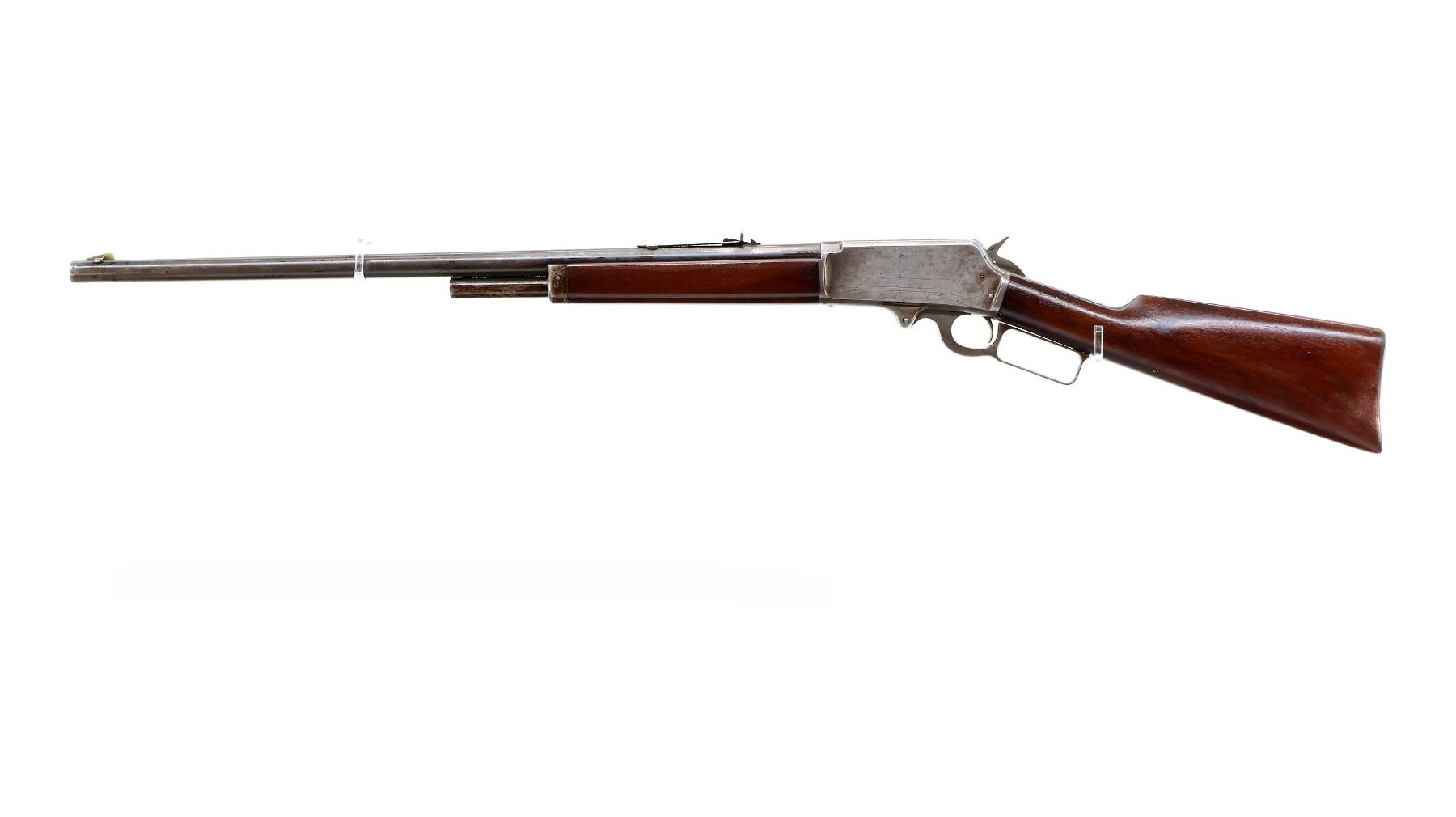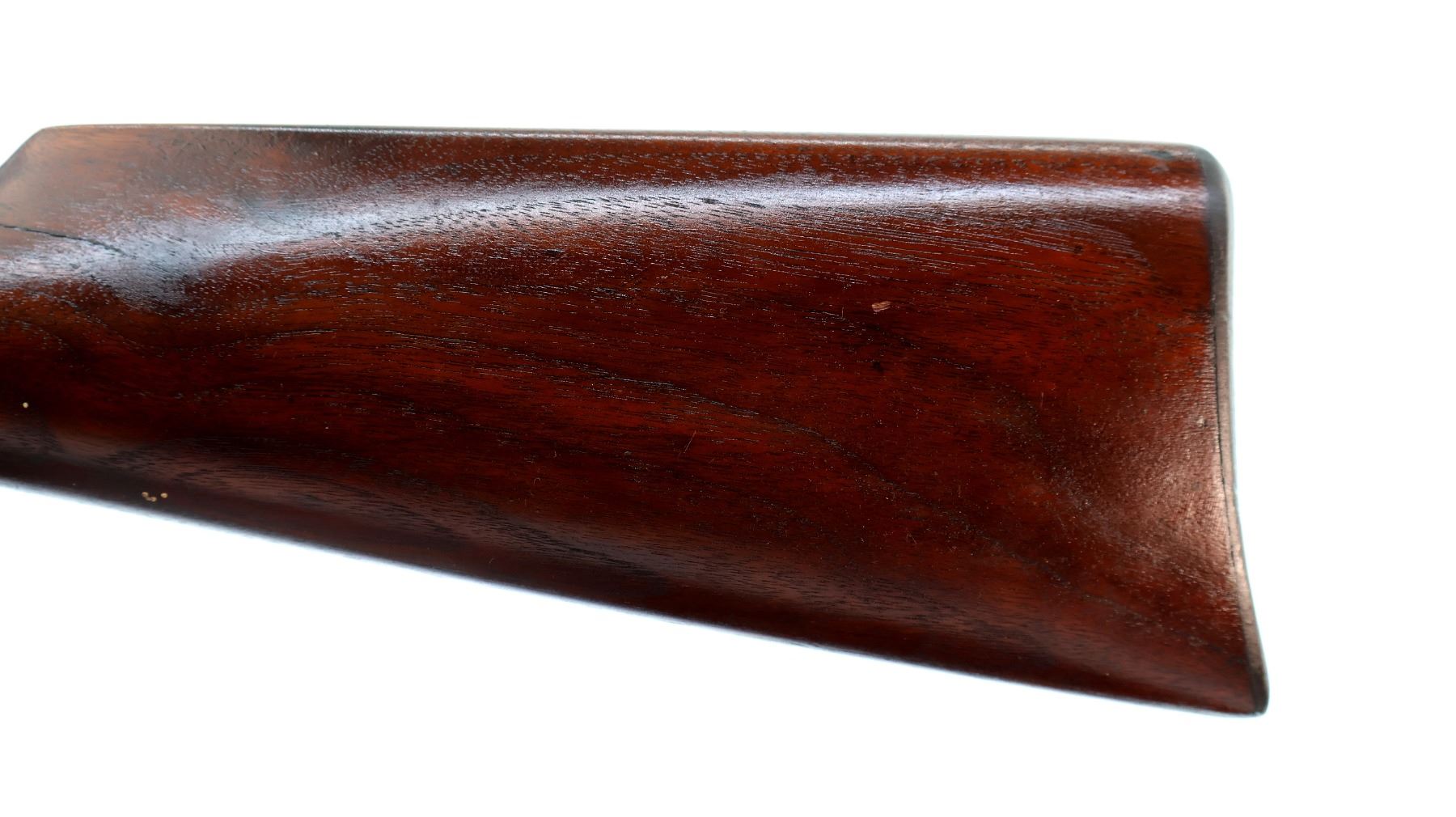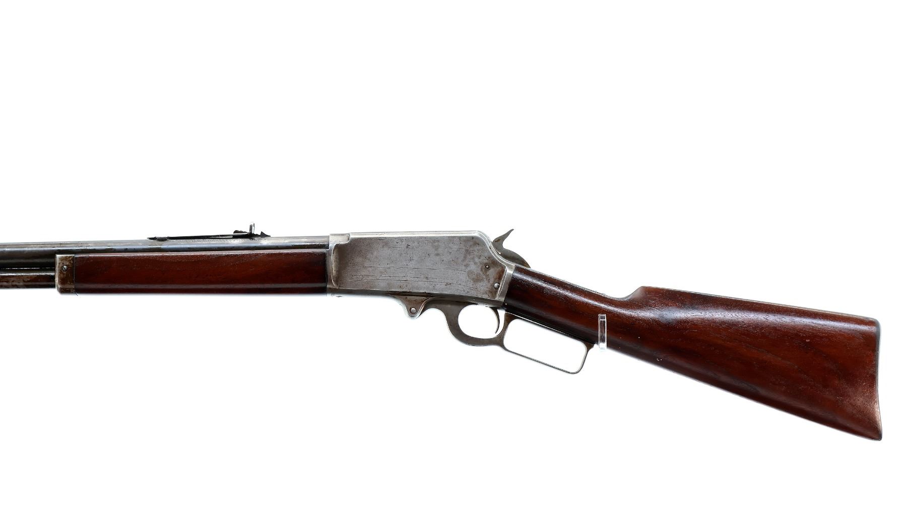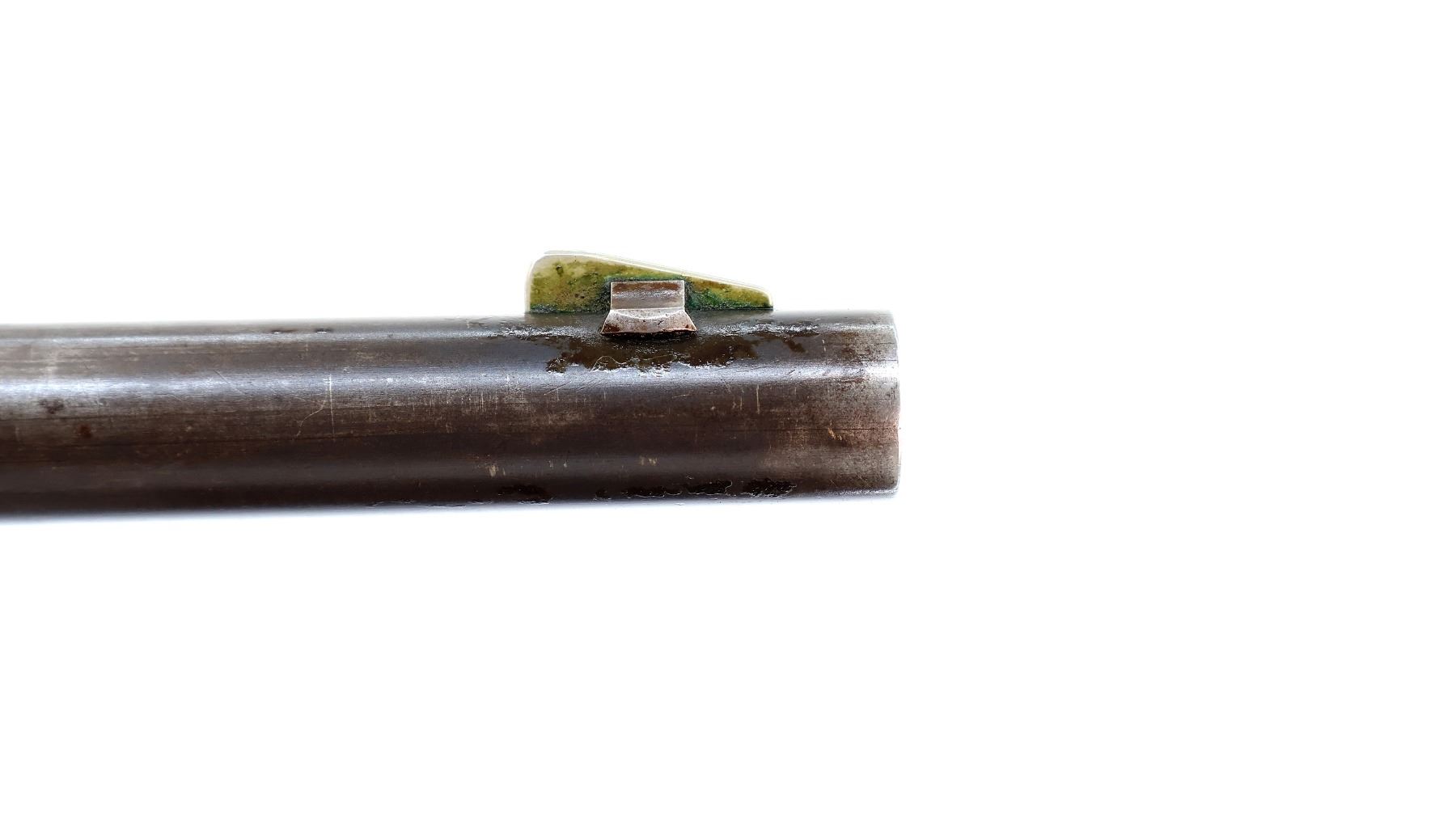 Main Description: Blade front sight, adjustable u notched semi buckhorn rear sight, blued tapered round barrel, receiver has some Nickel finish remaining, checkered spur hammer. Two piece wood stocks, straight grip cracked behind upper and lower tangs, checkered brown polymer butt plate, half length magtube.