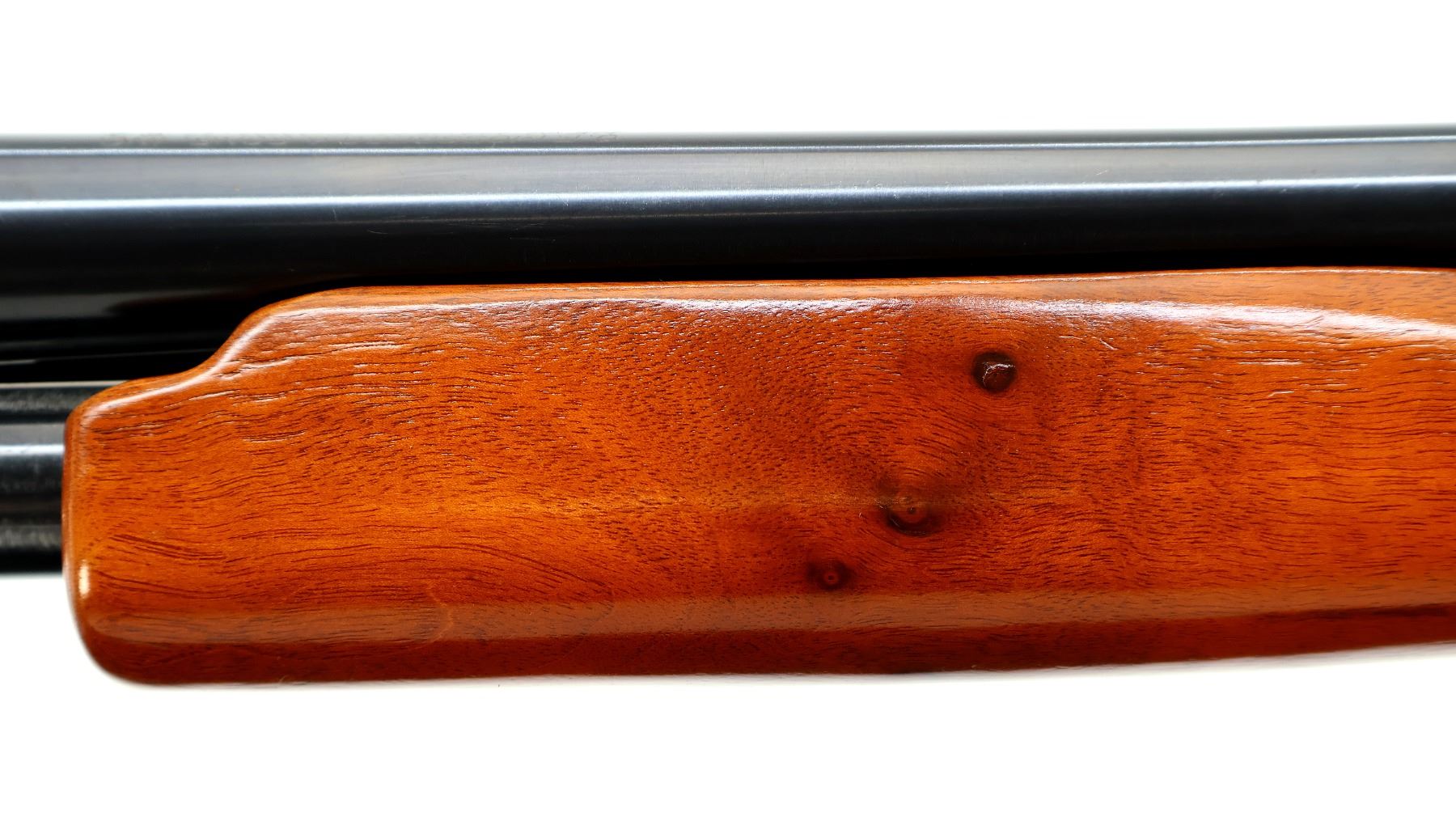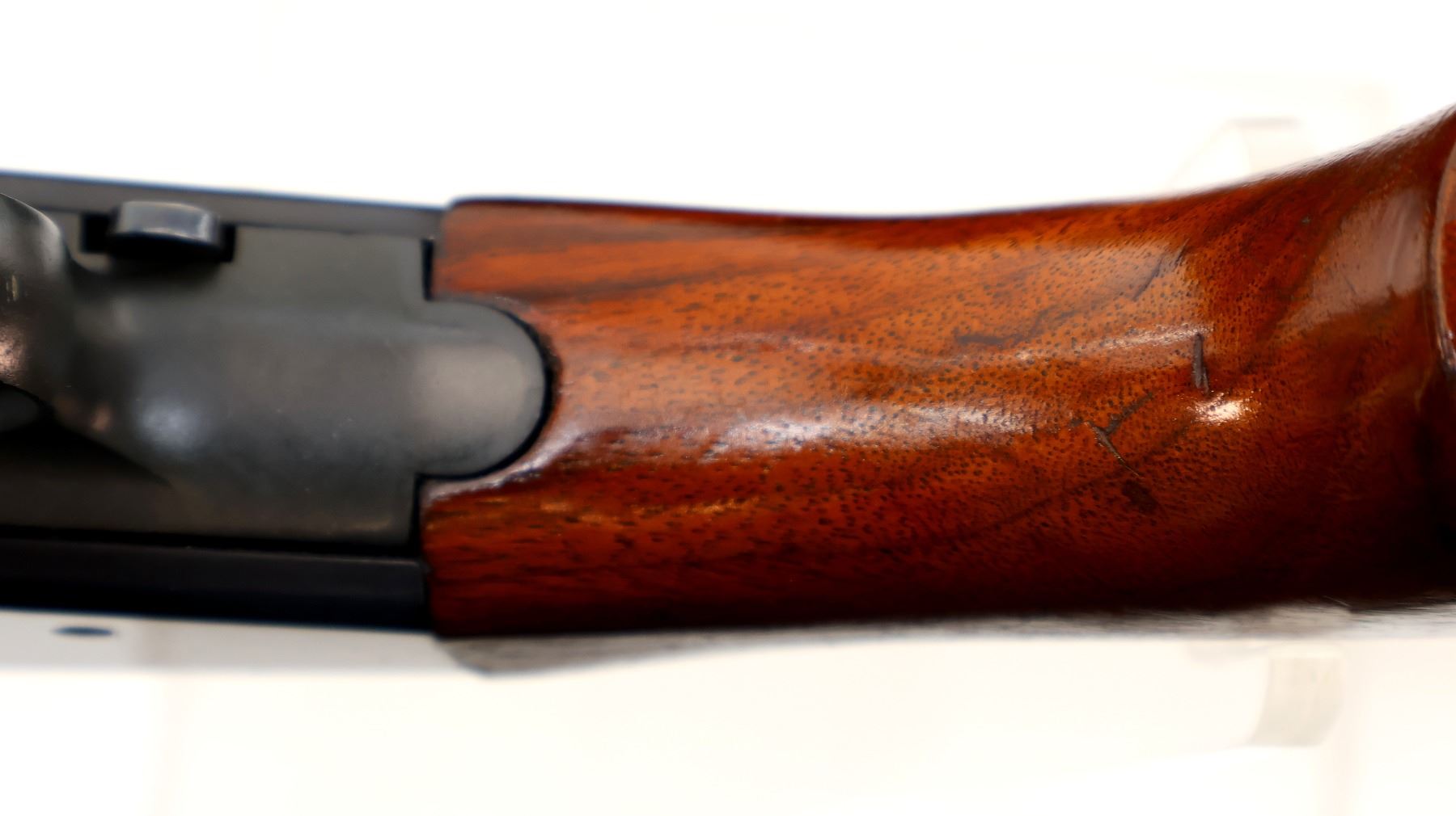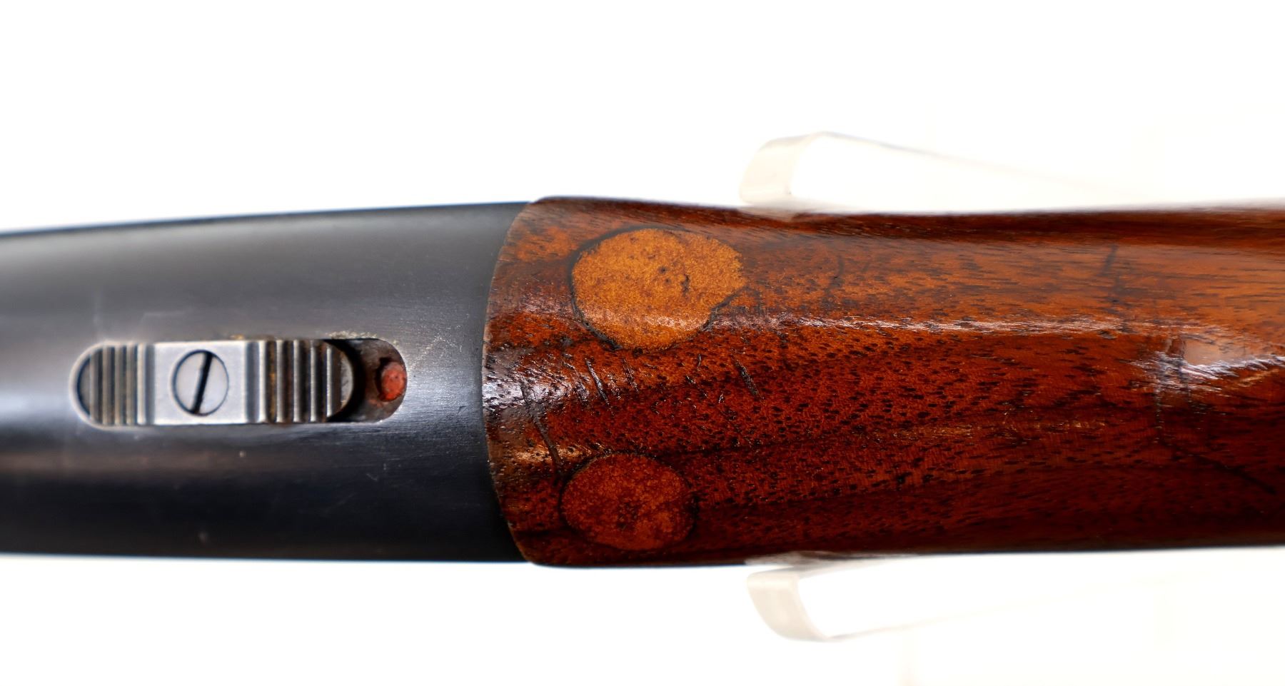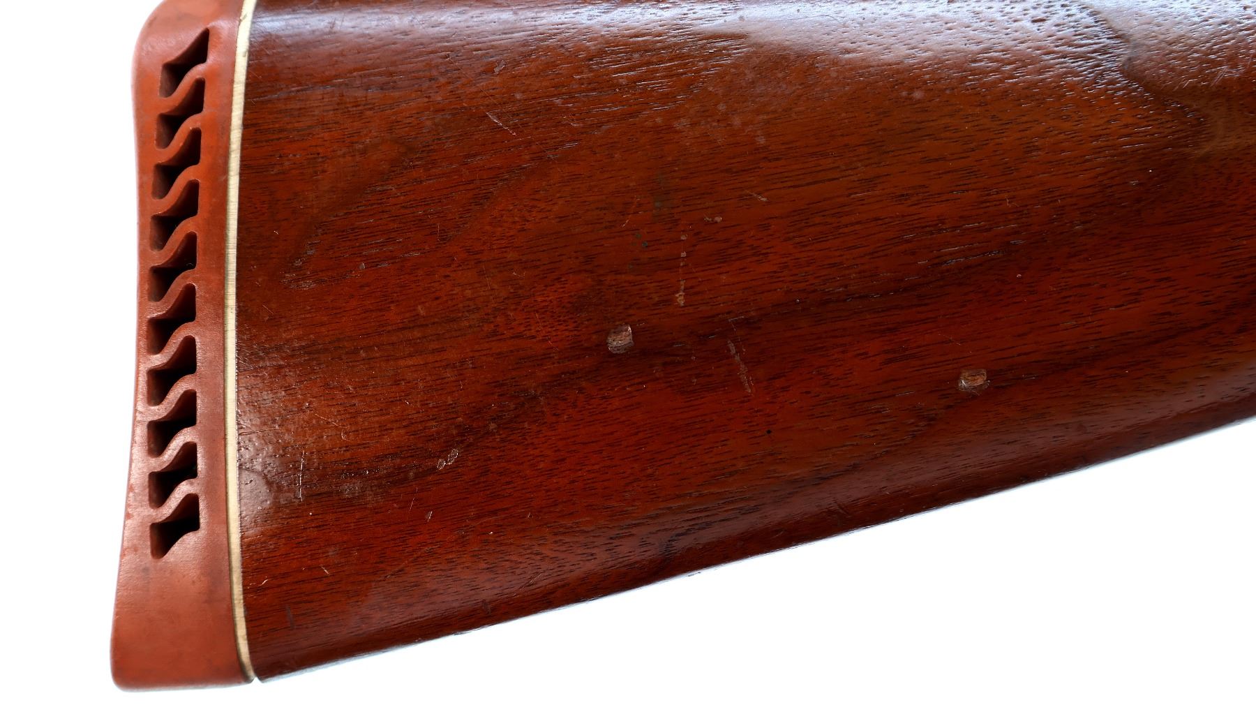 Main Description: Brass bead, blued round barrel, black alloy receiver, tang safety. Two piece wood stocks, pistol grip cracked and repaired, red vented rubber recoil pad