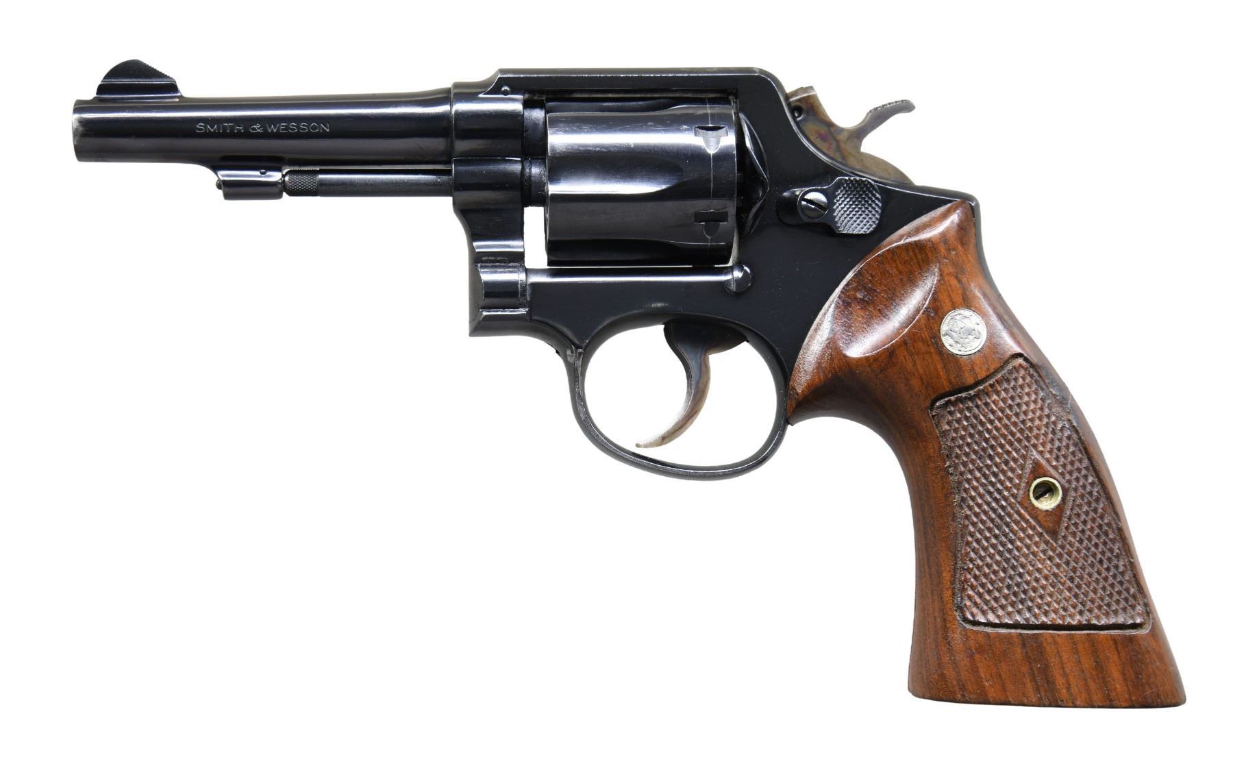 Cal. 38 Spcl. S# C467585. Bbl. 4" pinned. Ramped serrated blade front sight. Fixed rear sight. 6-shot cyl. Early no-dash Model 10 made in 1960. Rear sideplate screw is missing. Blued finish with case colored hammer & trigger. Checkered walnut diamond center target grips with silver S&W medallions. CONDITION: grips show a couple gouges, a couple chips & scattered handling marks. Trigger & hammer retain most of their case colors with some light oxidation & operational wear. Balance of metal retains 90% factory quality blue with some oxidation on trigger guard, some dings around one of the frame screws, scattered operational & edge wear. Action functions properly when hand cycled. Very good plus bright bore. (25-4093/MJC). CURIO. $400-600.