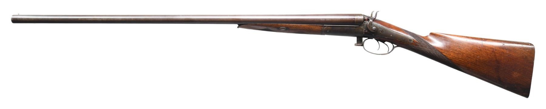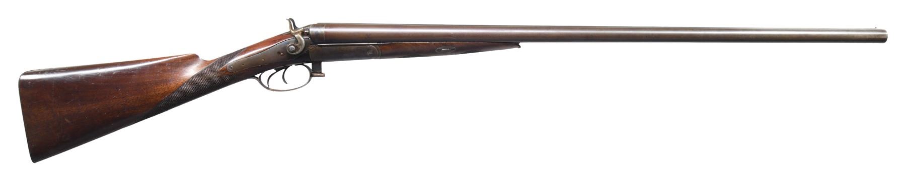 Cal. 12 Ga. S# 0819. Mfg. pre 1874 as "Dollar Grade". Decarbonized steel 30 1/8" barrels with bright front bead; approx. 889 mfg. with decarbonized barrels. Bore chokes measure cyl. Back action hammer locks with round body lifter receiver, dbl. triggers & extractors. Checkered walnut stock set. Wedge fastener forearm with steel tip, matching number on iron & matching number stamped in barrel channel. Straight grip stock with point pattern checkering. LOP: 13.5" to steel buttplate. CONDITION: barrels have faint traces of blue in exposed areas with good blue in protected areas; balance brown patina with scattered light marks. Faint case colors on receiver mixing with brown patina & peppery oxidation. Fair wood finish with numerous marks, sm. cracks & spots of mildew. Bores show light pitting throughout. Barrels being slightly loose to frame. (01-27018/MD). ANTIQUE. $300-500.