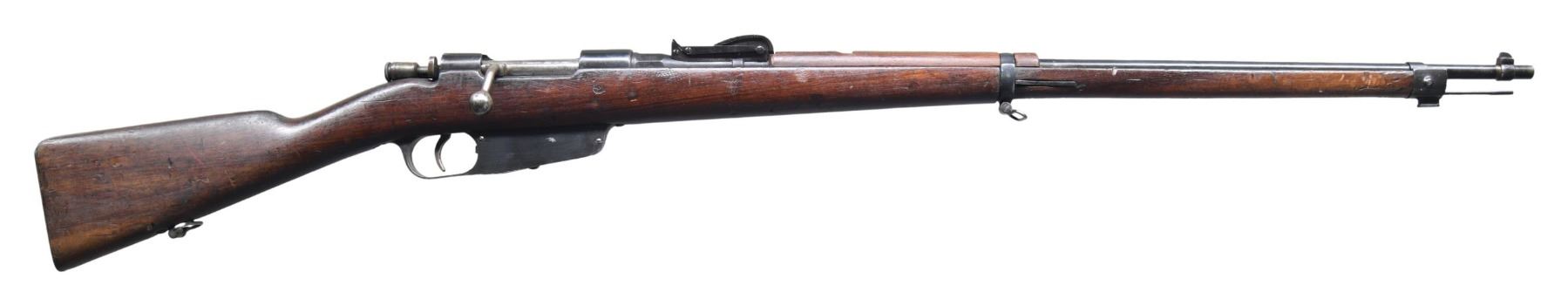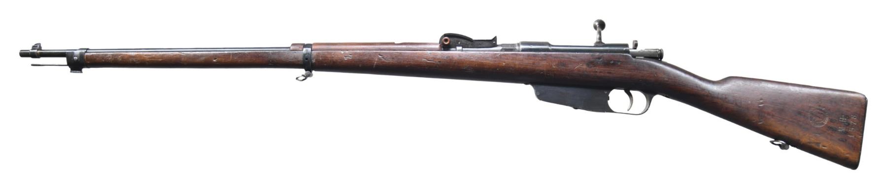 Cal. 6.5 Carcano. S# MH1578. Bbl. 31". Blade front sight. Elevator rear sight graduated to 2000m. Stock is arsenal renumbered to match bbl. Bent bolt is a replacement & its handle turned to rear. Bbl. has Terni markings & 1896 date. Blued finish. Hardwood stock set with strong Terni cartouche & bottom mounted sling swivels. Rear band is loose. Cleaning rod present. CONDITION: stock shows a thin crack beneath band keeper, scattered dings, dents & handling marks. Metal retains 50% arsenal rework blue with scattered thinning, handling marks, edge wear, fading & light oxidation. Action functions properly when hand cycled. Worn bore with scattered pitting & oxidation. (01-27373/MJC). ANTIQUE. $200-400.