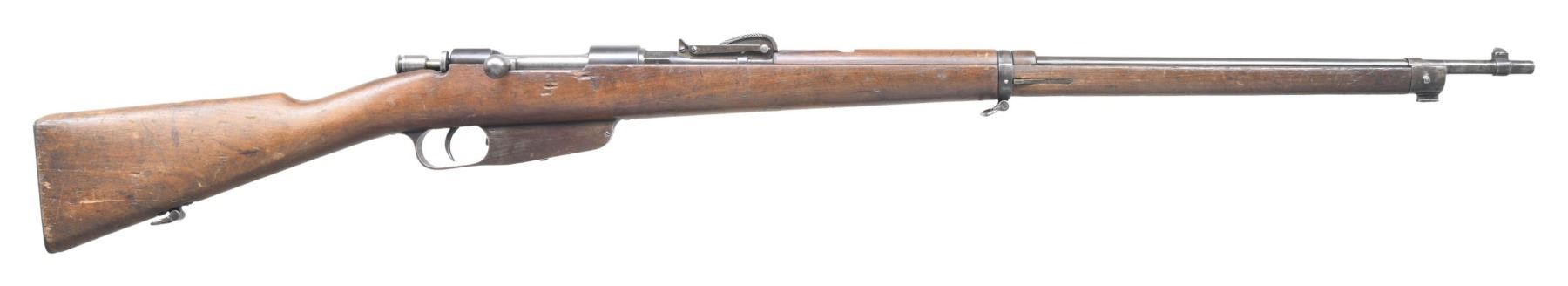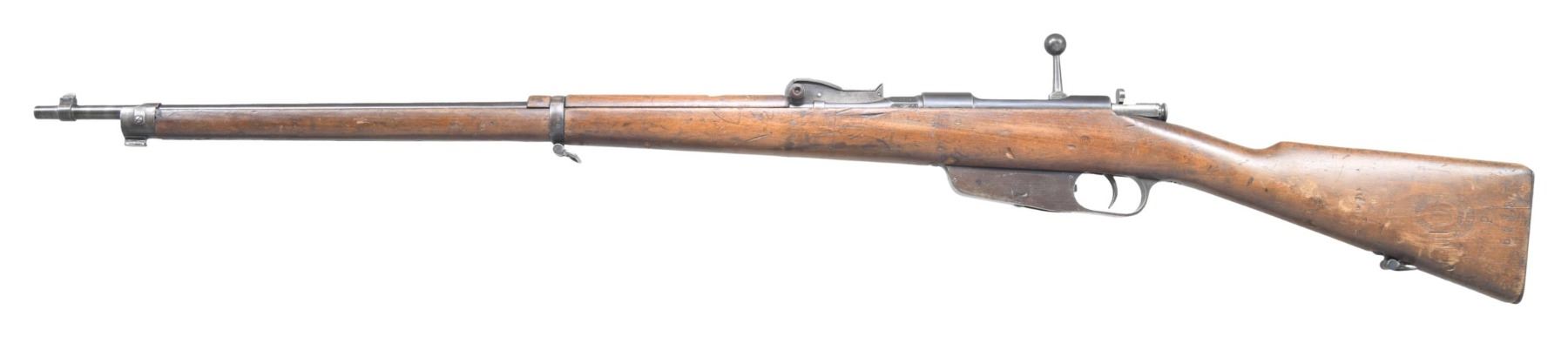 Cal. 6.5x52 (6.5 Carcano). S# P6218. Bbl. 30 1/2". Blade front sight. Tangent rear sight graduated to 2000m. Matching numbers on bbl. & stock. Bbl. has Torino arsenal & crossed rifle accuracy markings with 1893 date. Arsenal rework blued finish. Beech stock set with bottom mounted sling swivels. Left side of butt has 1936 dated arsenal refurbishment cartouche. No cleaning rod present. CONDITION: stock set shows a few drying cracks on butt, a few gouges, scattered dings, flaking, chipping & handling marks. Metal retains 40% arsenal rework blue with overall fading to gray, scattered edge wear & some light oxidation. Action functions properly when hand cycled. Bore shows scattered frosting & pitting but strong rifling. (01-27592/MJC). ANTIQUE. $200-300.
