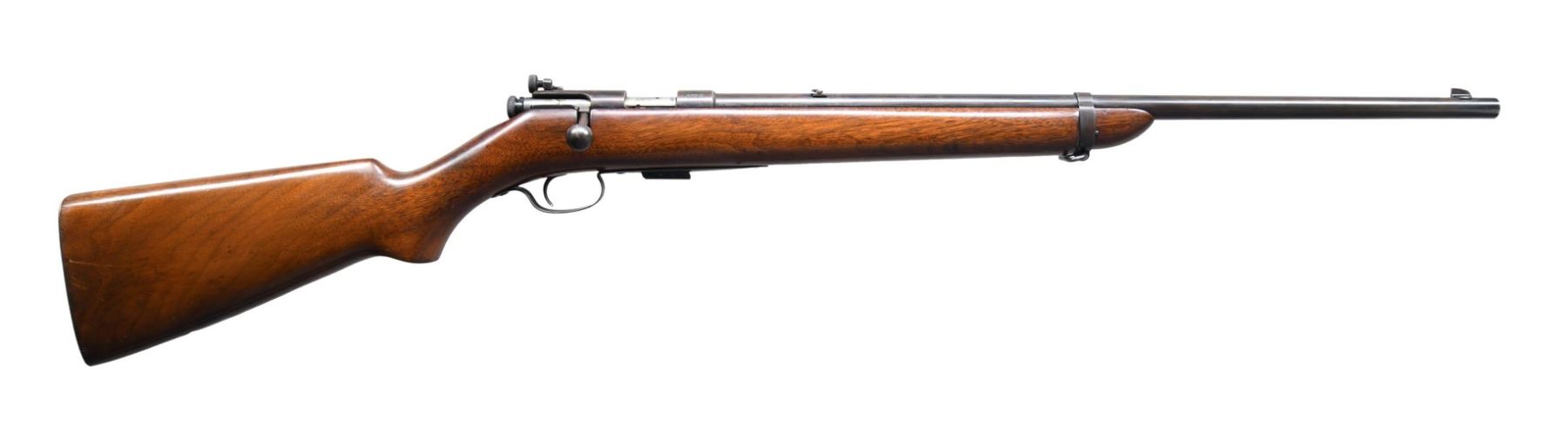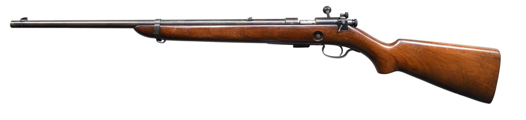 Cal. 22 LR. S# 6718. Bbl. 22 1/8". Model 57 bolt action rifle mfg. by Winchester in 1927. The left side of the bbl. is marked with the model designation, followed by the Winchester trademark logo, and cal. designation, with Winchester's mfg. and patent information marked on the right. Right side of the receiver is marked with the S#. Left side of the bbl. band is marked "PAT./ JAN.25.21". Metal components exhibit a blue finish overall, save for on the bolt body, which is polished in-the-white. 1-piece plain wood pistol grip buttstock, with flat checkered steel buttplate. Standard blade front sight, with flip-up V-notch rear sight, and unmarked aperture rear sight mounted on the left side of the receiver. Sling loop on underside of butt is absent. MAGS: 1 blued 5-rd. CONDITION: metal components retain fair to good amounts of their original factory blue finish, exhibiting wear and thinning that shows through to brown patina overall. Bbl. exhibits areas of mild pitting at and around the muzzle. Bolt exhibits some spots of age related discoloration. Very bright bore, exhibiting some spots of light to mild pitting, while retaining strong rifling throughout. Wood stock shows scattered marks and minor impressions from handling and storage, but otherwise remains sturdy and serviceable. (25-1794/MLW). CURIO. $300-400.