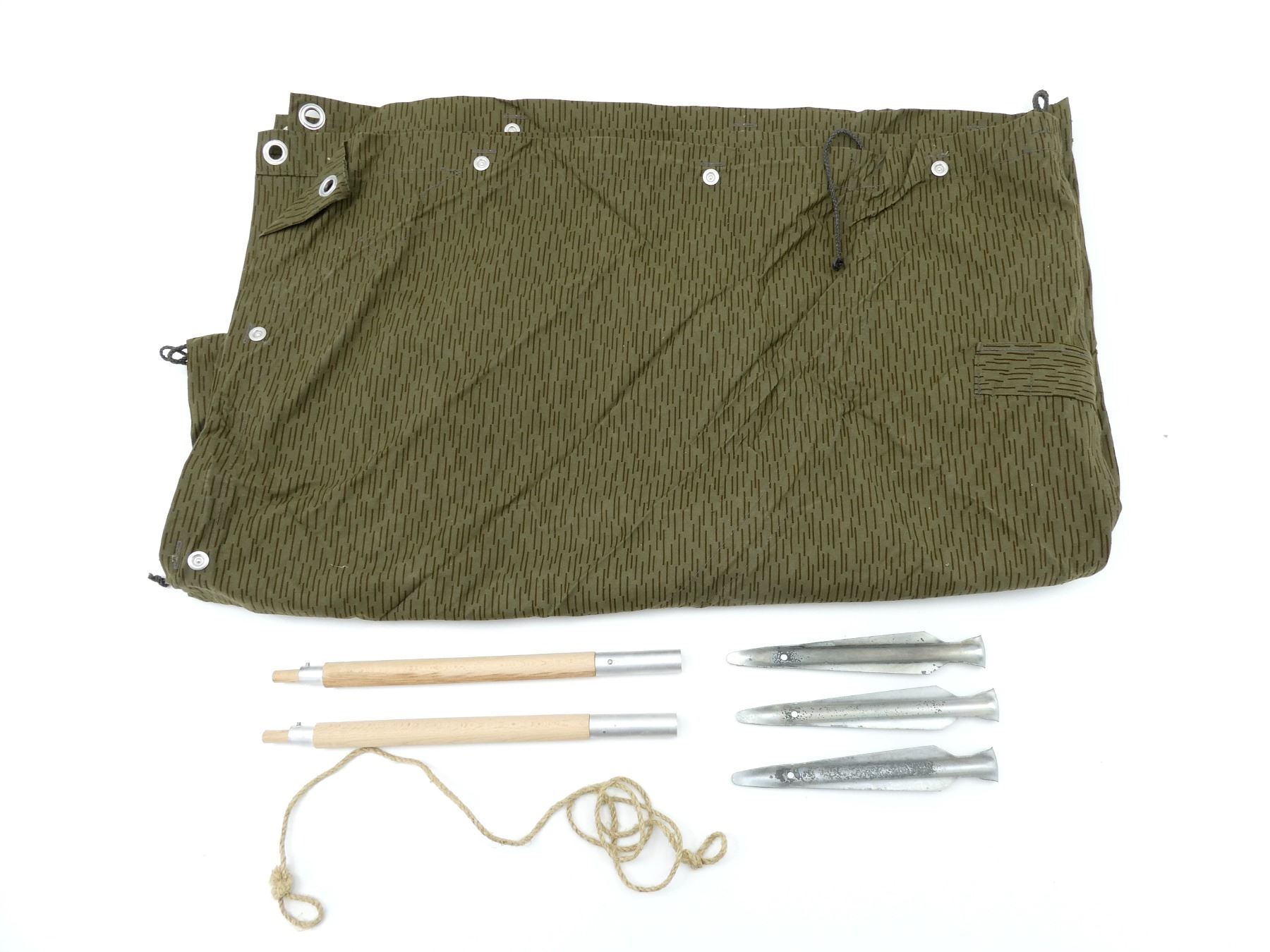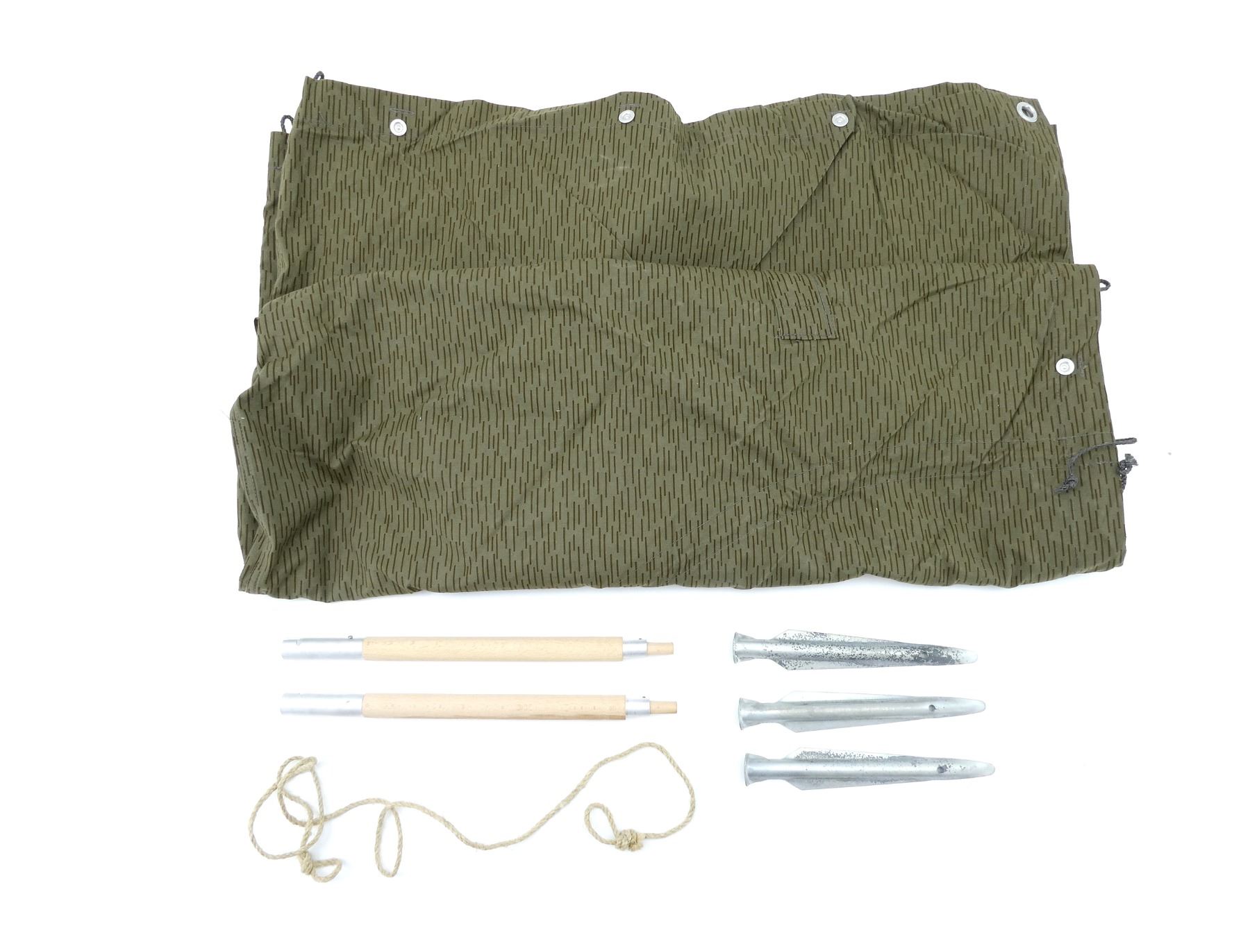 (1) CONSIGNOR STATES: "NEW UN-ISSUED", SQUARE CAMO ZELTBAHN (SHELTER-HALF / PONCHO), CAN BE WORN AS A PONCHO, TOP CORNER TURNS INTO A HOOD USING DRAWSTRINGS, BUTTONS TOGETHER TO FORM PONCHO, ARM SLITS HAVE BUTTONS TO SECURE, INNER SIDE ON HOOD MARKED: "NVA, I/U", "224" WITH VARIOUS OTHER INK STAMP MARKINGS, APPROX. 74" X 76.5", COMES WITH (2) WOODEN TENT POLES WITH ROPE, NO VISIBLE MARKINGS, OALS APPROX. 15.5" & (3) METAL TENT PEGS, NO VISIBLE MARKINGS, OALS APPROX. 9.75". SEE PHOTOS.