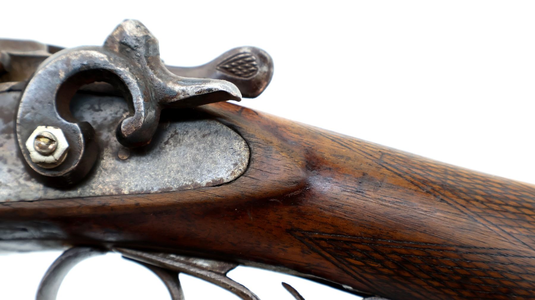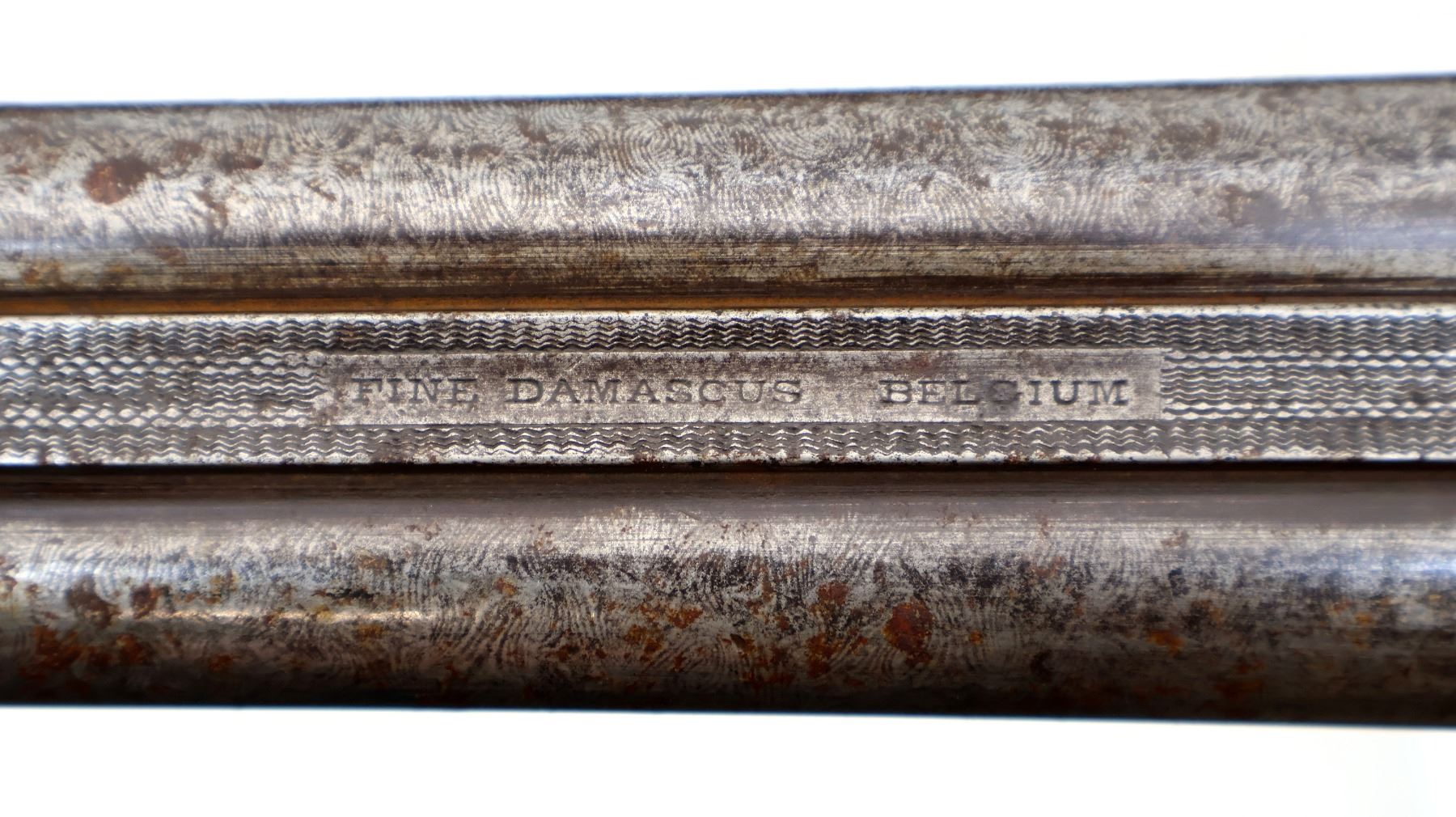 Main Description: No bead, shortened Damascus barrels with grooved rib that are loose on face, side locks with spur hammers that do not function, possibly missing parts requires repair. Extractor, double triggers. Two piece wood stocks, checkered forearm and pistol grip, small chips and cracks behind locks and receiver, checkered black polymer butt plate, grip cap.