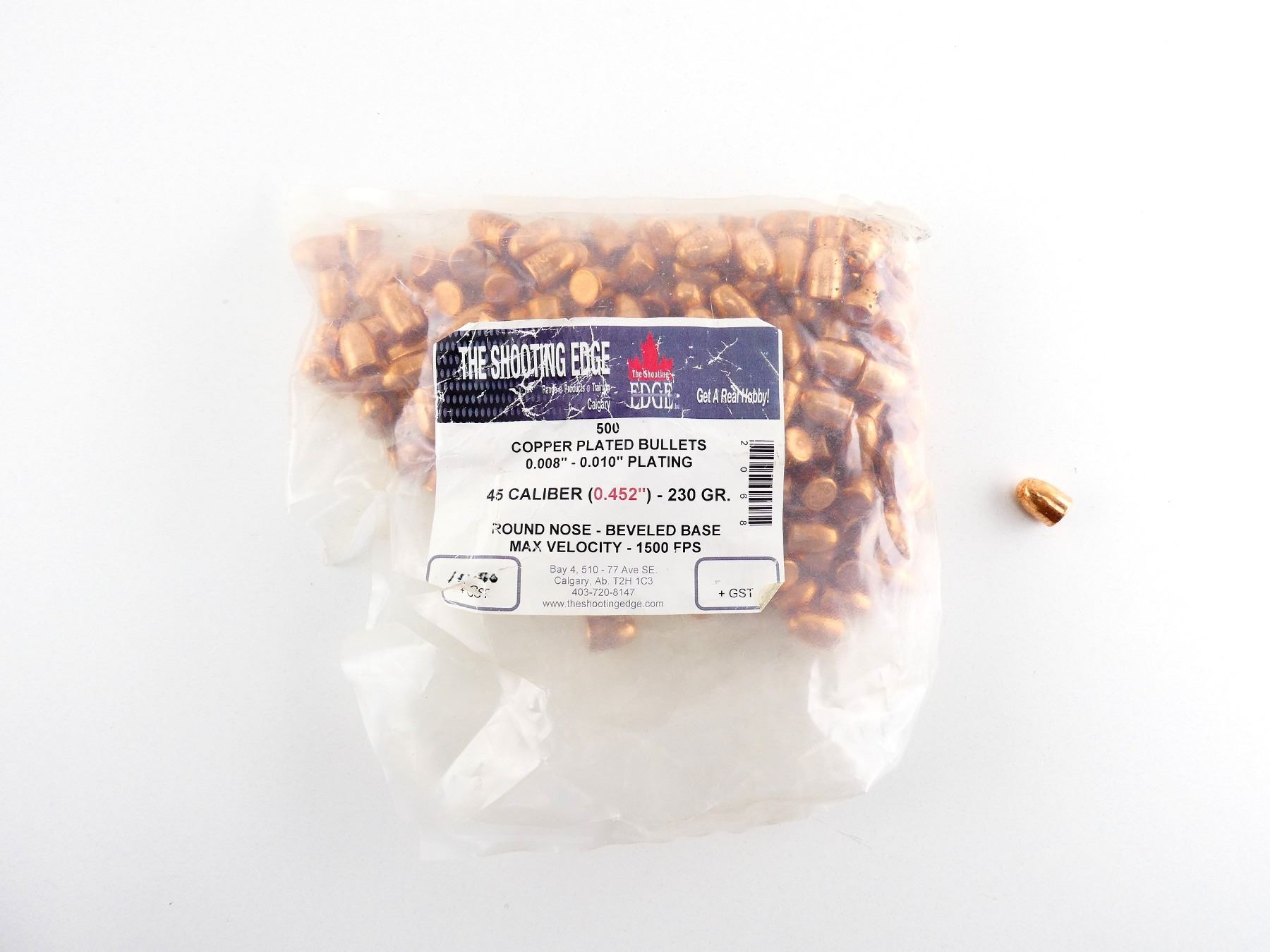 LOT INCLUDES APPROX. 6.3 LBS BULLETS, APPROX. DIA .452", 230 GRNS (STATED ON BAG NOT CONFIRMED) COPPER PLATED RN BEVELED BASE.