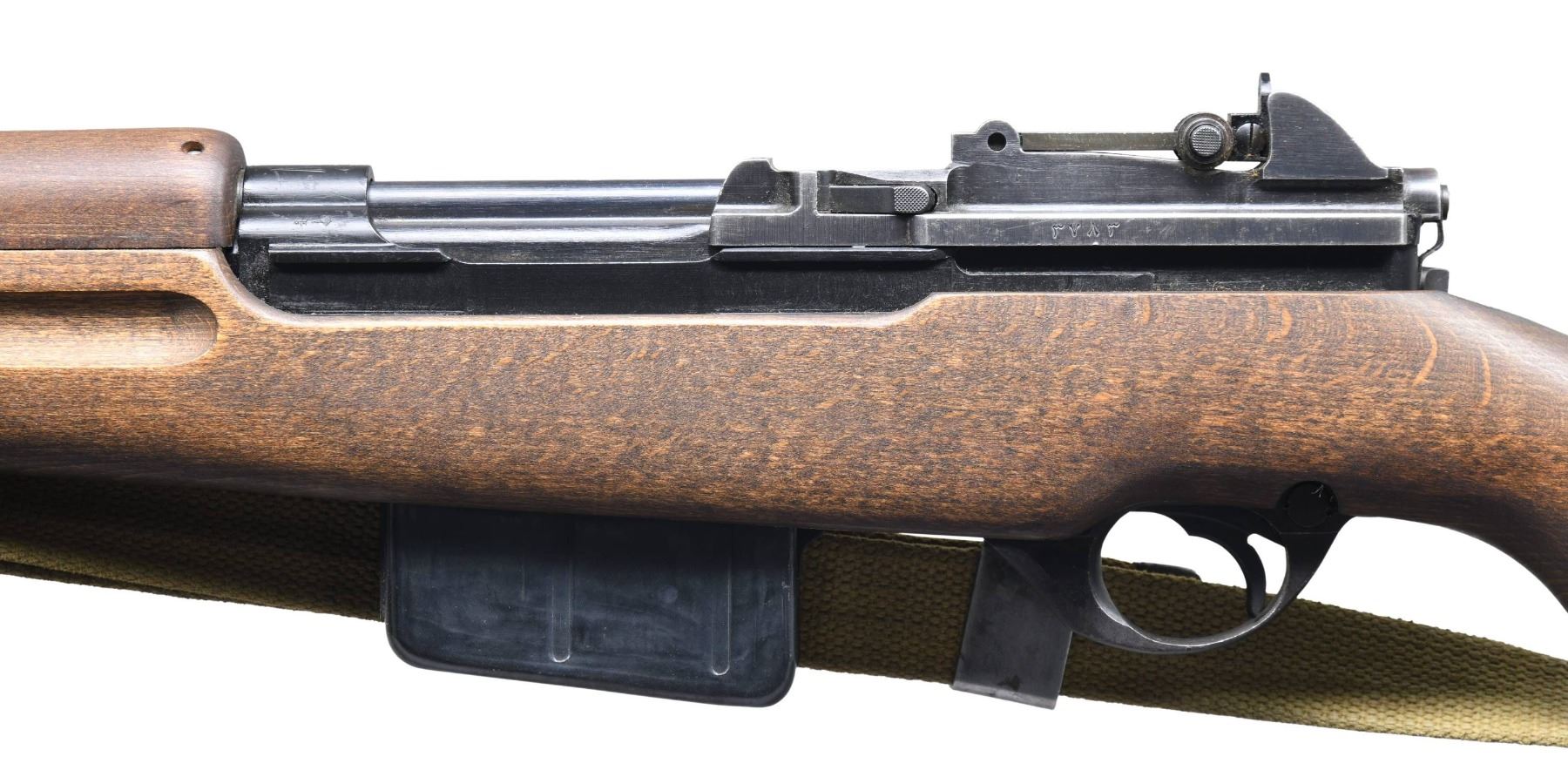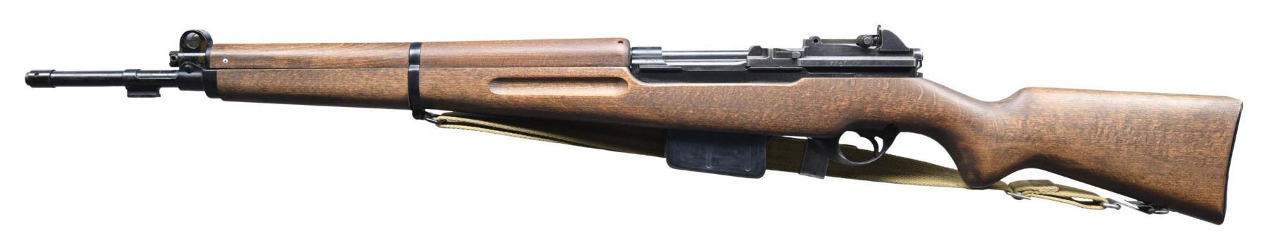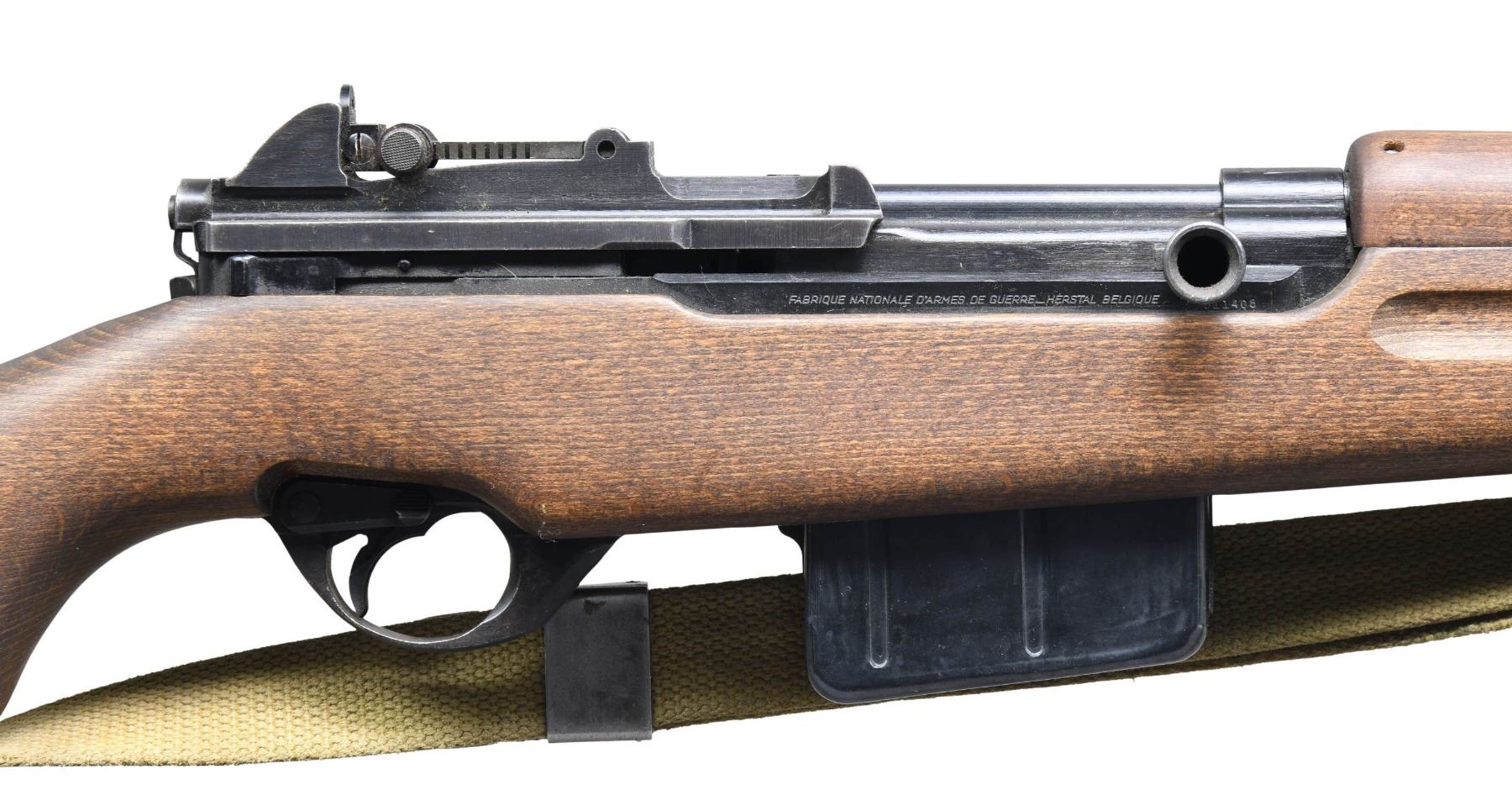 Cal. 8mm Mauser. S# 011408. Bbl. 23". Import marked on right side of bbl. "CAI ST ALB VT". Tangent aperture rear sight w/ Arabic graduations. Blade front sight w/ protective ears. Receiver ring marked on top w/ Egyptian eagle crest. Belgian proofs. Marked on right side "FABRIQUE NATIONALE D'ARMES DE GUERRE-HERSTAL BELGIQUE". Bayonet lug is present. Magazine body appears to be new manufacture replacement. Modern replacement hardwood stock set. Black plastic buttplate. Early issue green web US sling. CONDITION: bolt does not fully retract, even w/ mag. removed from rifle, gunsmith attention needed. Stock set has very little wear & tiny handling marks. Metal retains 75% original finish w/ thinning & light wear. Good shiny bore w/ lightly worn lands. (25-2188/RW). CURIO. $500-900.