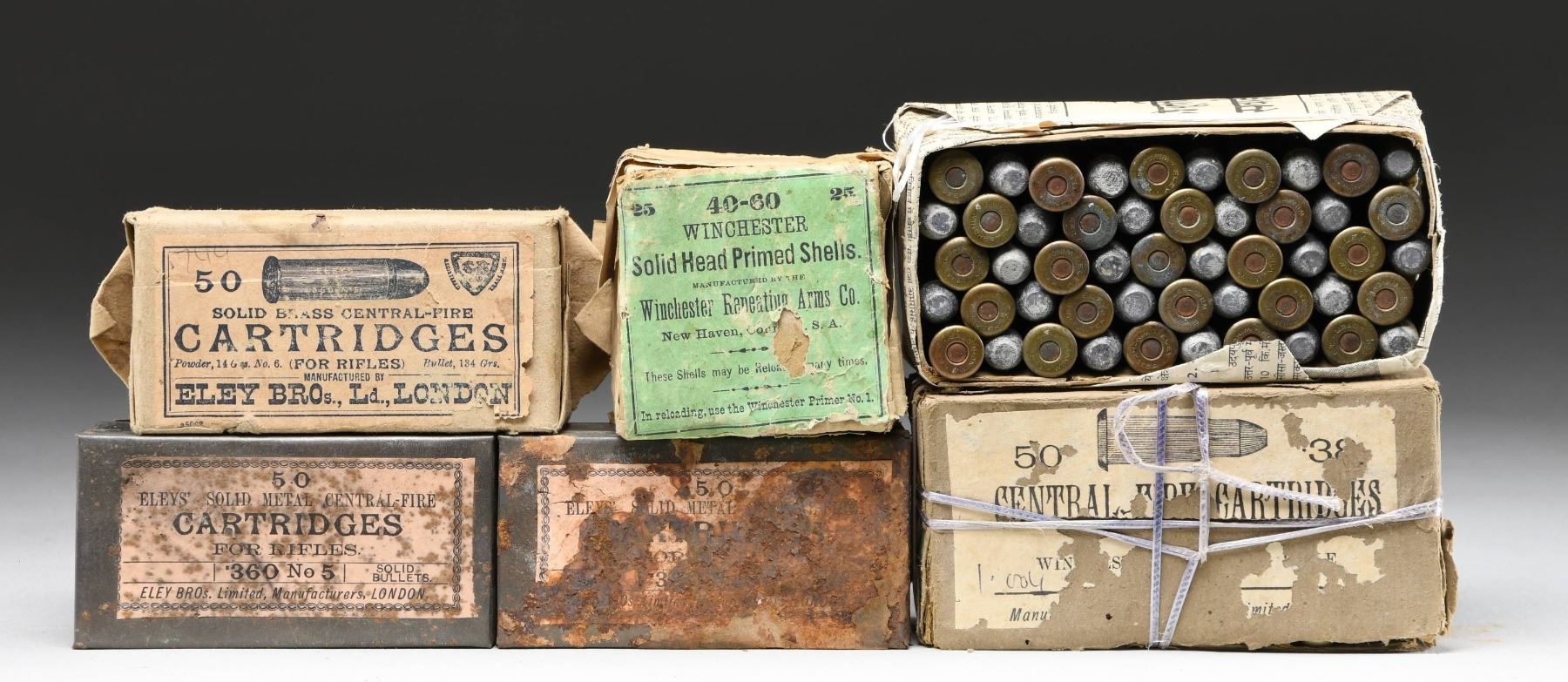 ELEY 360 ROOK: One exceptional paper sealed 50 rd. metal tin box of No. 6 with 14 gr. of powder and 134 gr. bullet. / Good metal tin of 50 with good label indicating No. 5. Ammo has only slightly discolored casings with slight powder appearance to bullets. / Fair metal tin appearing to be like No. 5 having oxidation on exterior that damaged the label. Ammo condition is one level below the previous lot. / ELEY 38-40: 2 Poor boxes of 50 each with only a portion of a label on one box. Ammo is fair to good with slightly discolored casings and slight powdery bullet appearance. WINCHESTER: 1 Box of 40-60 casings (25 rds.) having green label stating "SOLID HEAD PRIMED SHELLS". Cases are aged with slight discoloration. Box is fragile. PROVENANCE: from the renowned collection of quality sporting arms from Lewis Drake together with inventory of Lewis Drake Associates. (02-23571-14/NW). $450-600.