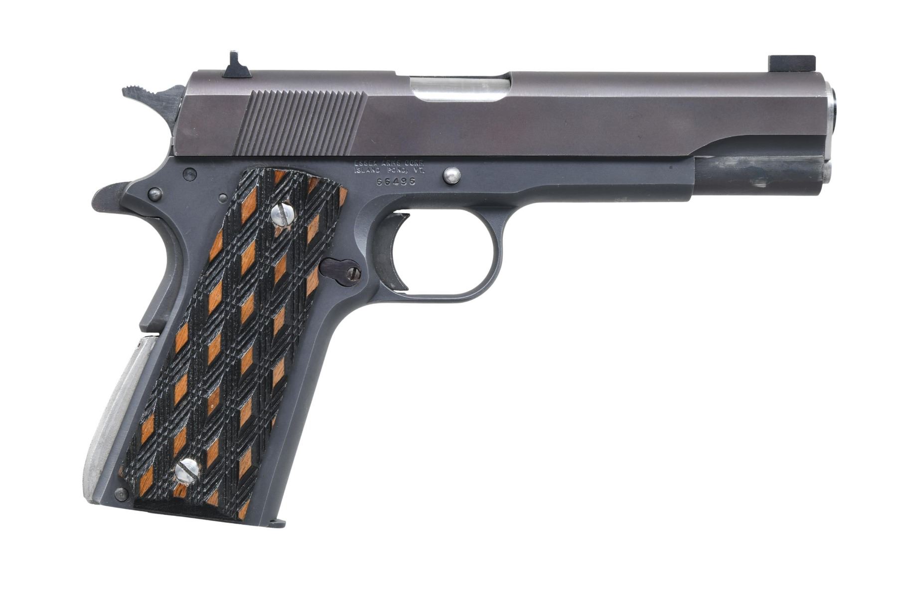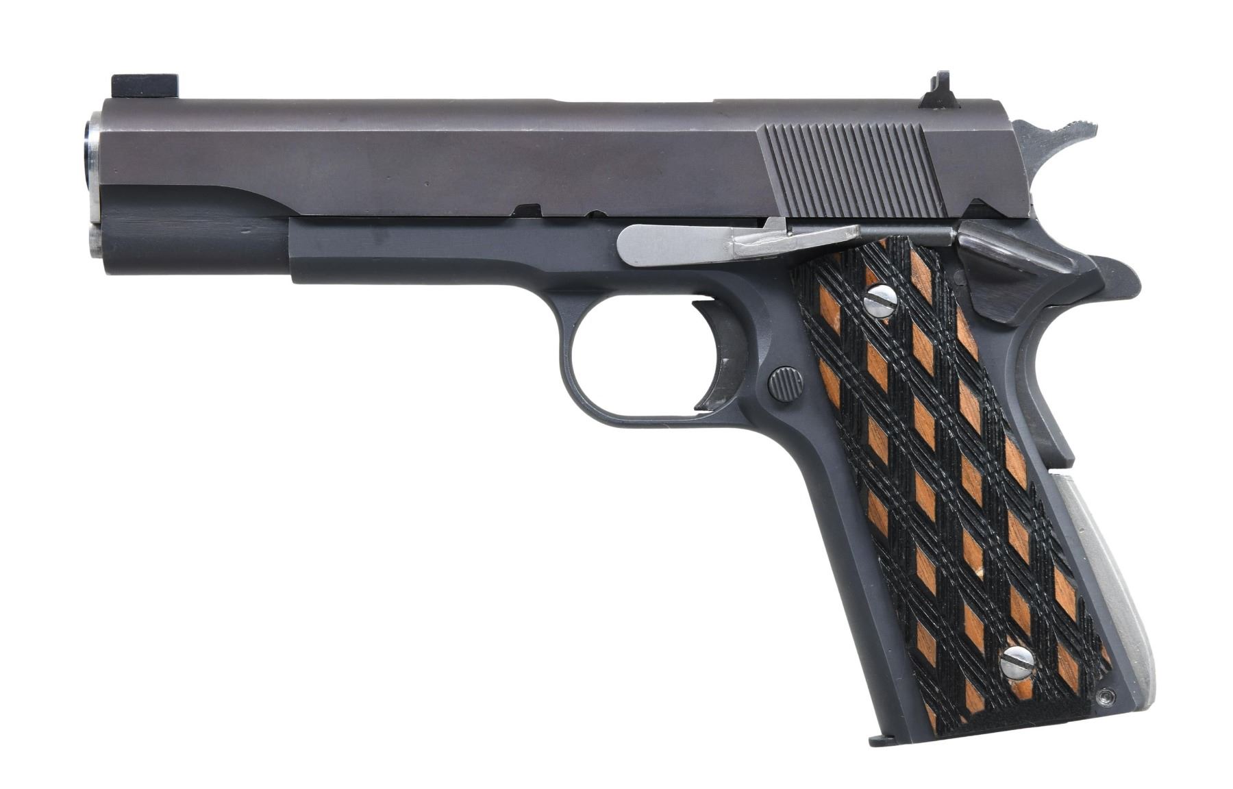 Cal. 45 ACP. S# 66496. Bbl. throated 70 Series Colt MK IV 5"; polished feed ramp in frame. Fitted with stainless barrel bushing, spring plug and full length guide rod. Stainless extended slide stop, grooved arched mainspring housing and slotted grip screws. Mfg. 1970's to 1990's in Island Pond, VT. Short grooved trigger without overtravel stop. Unmarked military style slide has high profile sight of Patridge front and square notched rear. Colt style serrated hammer and thumb safety. Checkered hardwood grips having checkered backgrounds and light colored raised diamonds. MAGS: 1 blued 7 rd. marked "COLT / .45 AUTO" on base; body polished to in the white at latch area. CONDITION: barrel fitting leaves slide sitting very slightly forward from normal. Slight finish loss on right front of slide caused by dust cover of frame. Occasional very faint thinning at high edges. Near excellent bore and grips. (25-3374/NW). MODERN. $350-500.