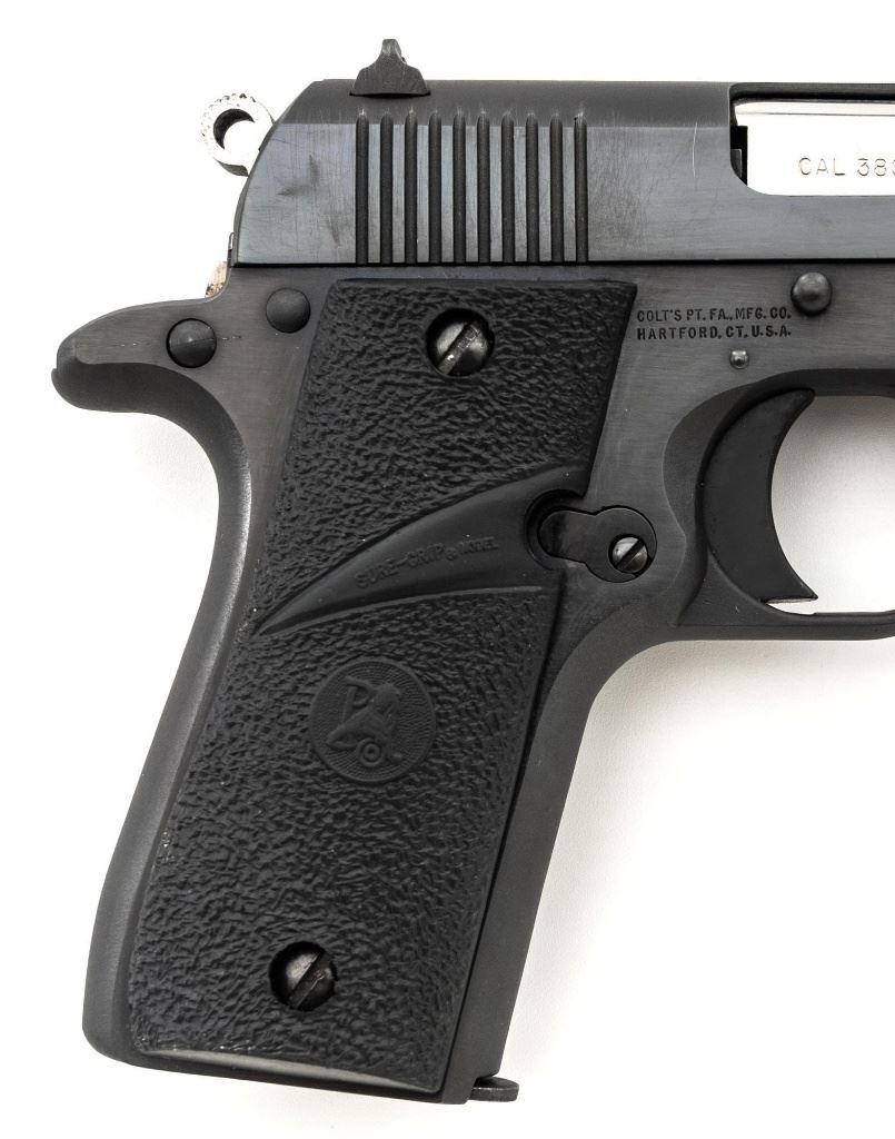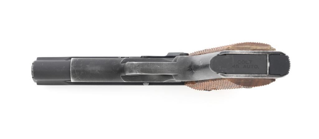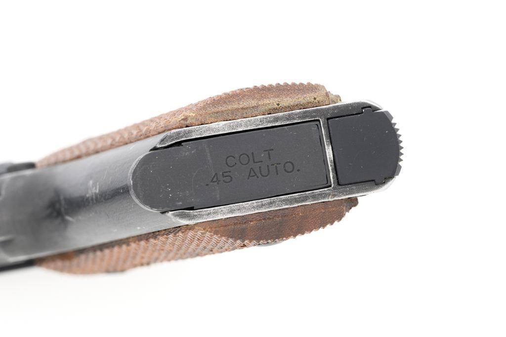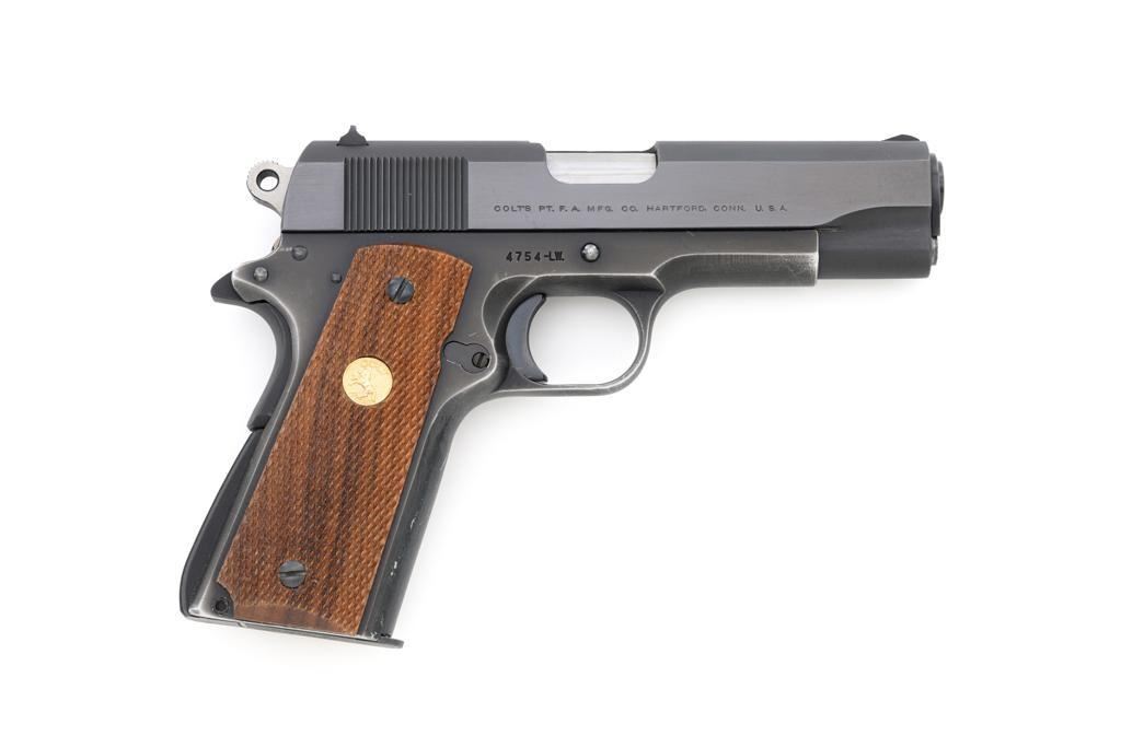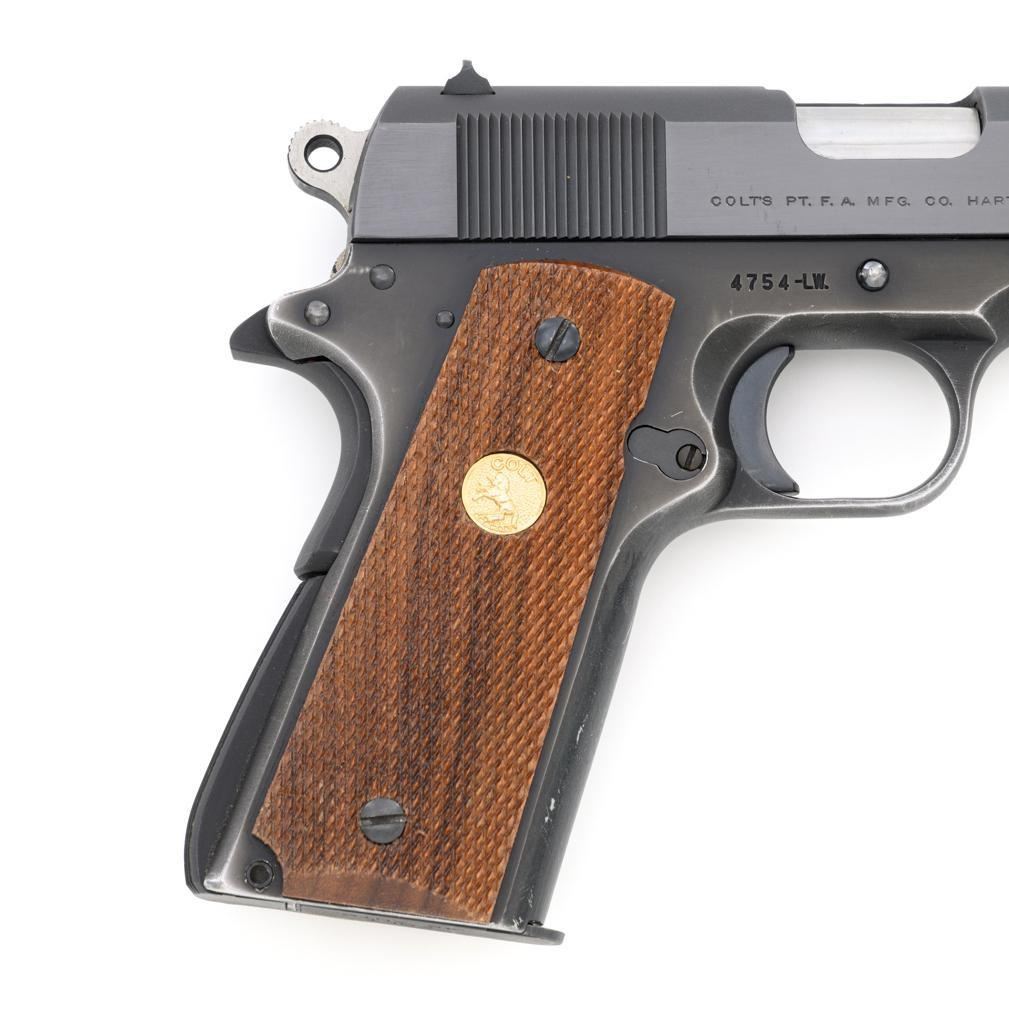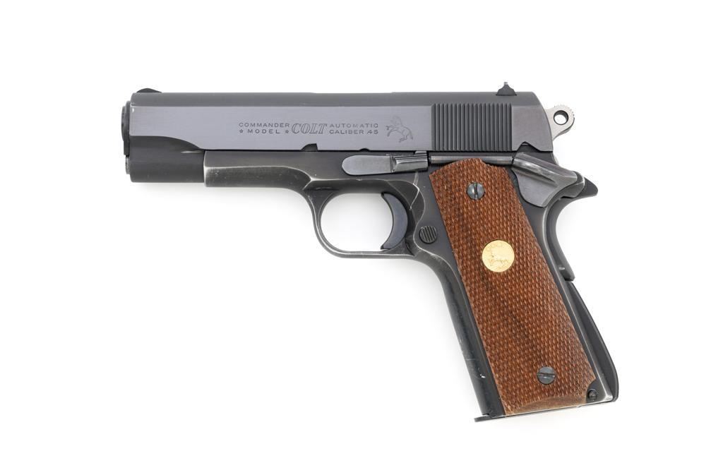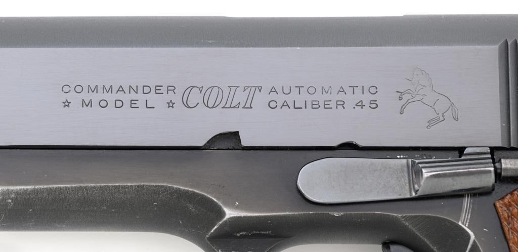 Early Colt Commander Model (Pre-70 Series) Semi-Automatic Pistol, #4754-LW, .45 ACP cal., 4.25" barrel, blue finish, checkered walnut grips with Colt medallions, blade front and fixed rear sights. Includes one correct Colt 7-round magazine marked "COLT .45 AUTO" on the baseplate. Mfg'd 1950, first year of production. Pistol is in fine overall condition, retaining approx. 90% factory blue finish, with highpoint edgewear, scratches and thinning of finish on the front grip strap. There is a small scratch on the left side of the frame, near the slide stop, with correct one-line Hartford barrel address on right side of slide, lightweight alloy frame, and crisp Rampant Colt emblem on left side of slide. Walnut grips are very good. Action is crisp, bore is very good with clearly defined rifling. Est.: $1,200-$1,500. (C&R)