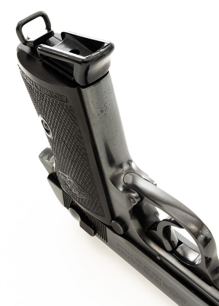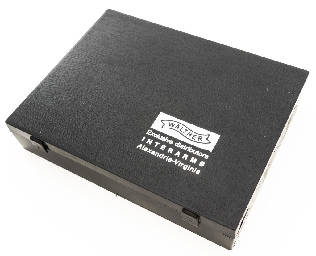 Early French Manurhin Walther Model PP Semi-Automatic Double Action Pistol, #19970, .32 ACP cal., 3.9" barrel, blue finish, checkered composition two-piece Manurhin grips, lanyard loop, low profile blade front and drift adjustable square-notch rear sight. Includes one 8-round Manurhin blue steel magazine with finger extension and factory hardcase. Factory markings are clear, with French proofs on the right side of the frame, slide, and barrel. Pistol is in near excellent overall condition, retaining approx. 97%-98% blue, with a few spots of mild corrosion at the left side of the muzzle. Frame shows some areas of light edge wear. Grips are in excellent condition with sharp checkering detail. Action is crisp. Bore is mirror bright with excellent rifling, showing little use. Est.: $600-$800. (C&R/PPT)