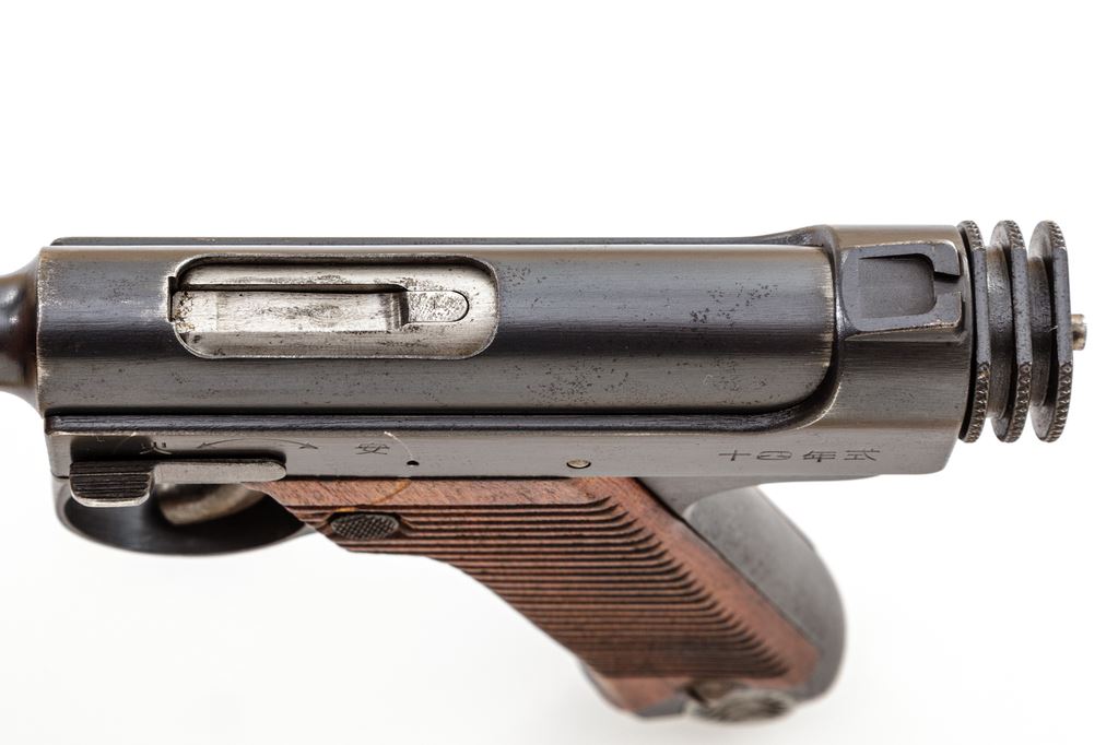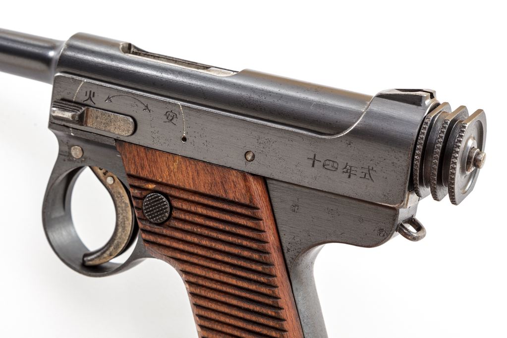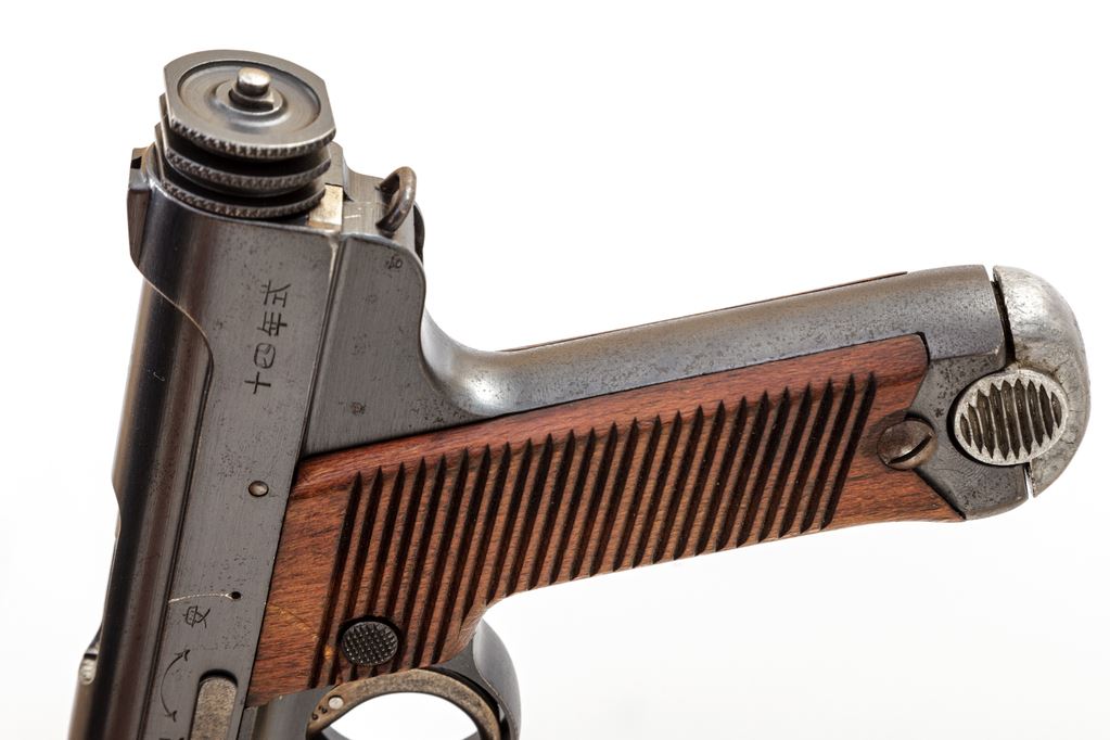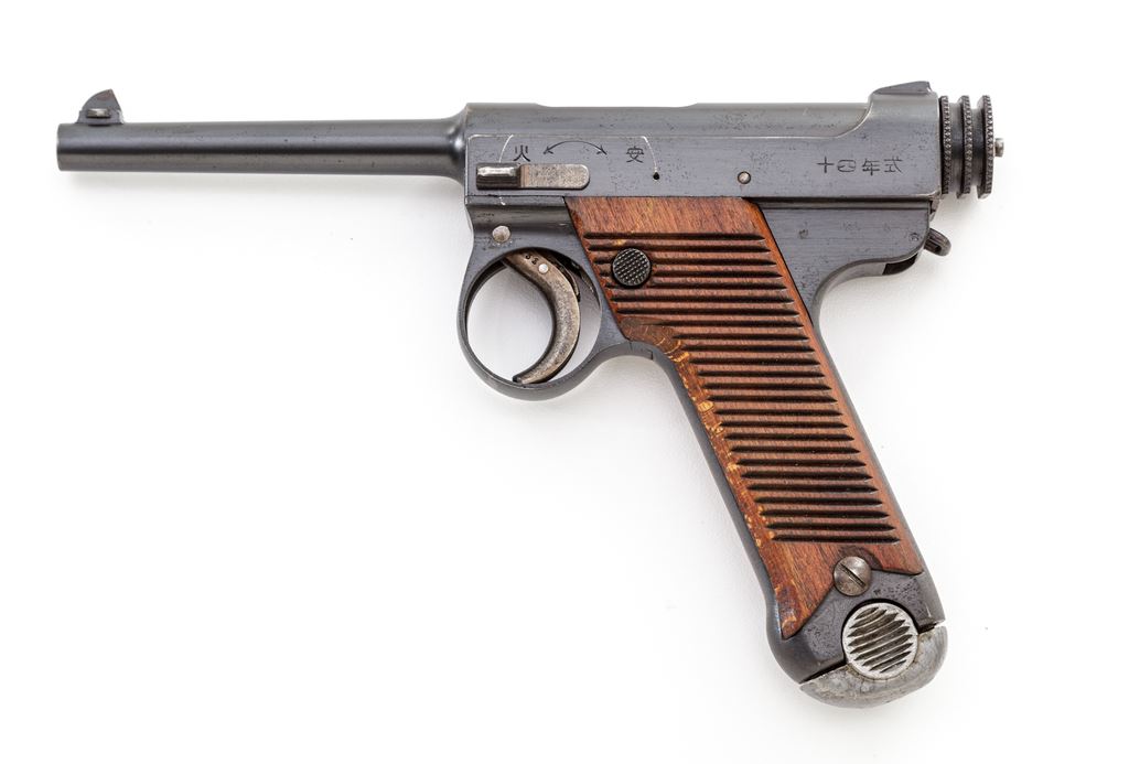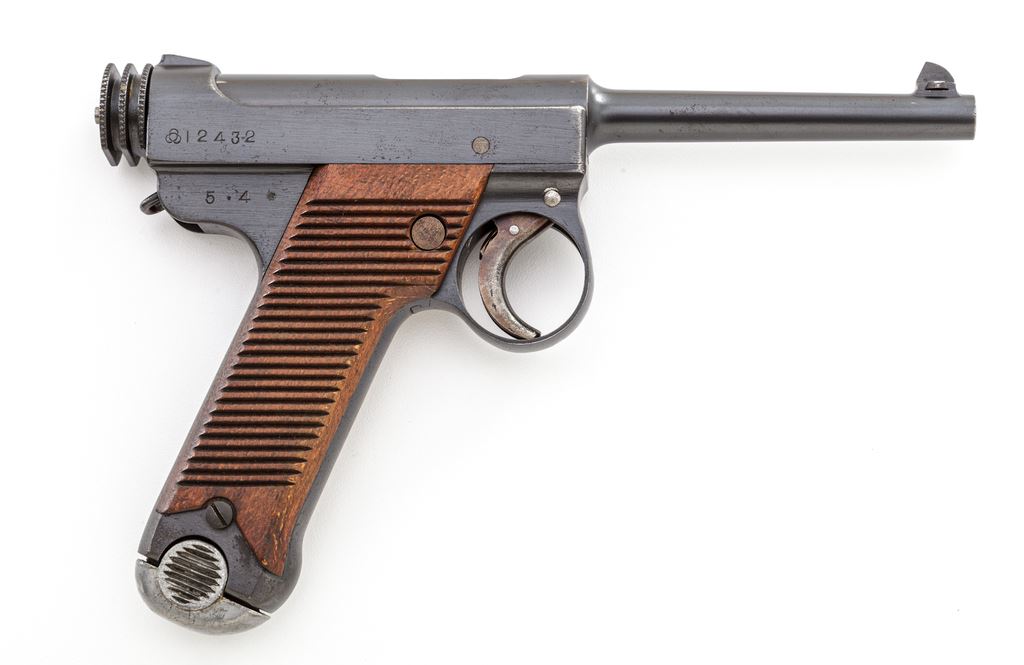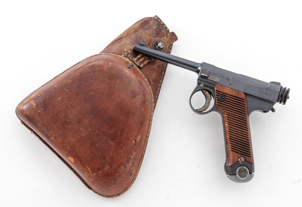 Early Japanese Nambu Type 14 Semi-Automatic Pistol, by Toyko Arsenal, #12432, 8mm Nambu cal., 4.5'' barrel, blue finish, small trigger guard, grooved Asian hardwood grips, with mismatched magazine, in brown leather clamshell holster with pull-thru and cleaning rod. Dated April 1930 (5.4). Condition is excellent retaining approx. 97% fine rust blue, with circular scratch in safety area. Grips are excellent with just light soiling. Action is good, bore is bright. Holster with minor scuffs and oil darkening. Est.: $600-$800. (C&R/PPT)(John Ackerman collection)