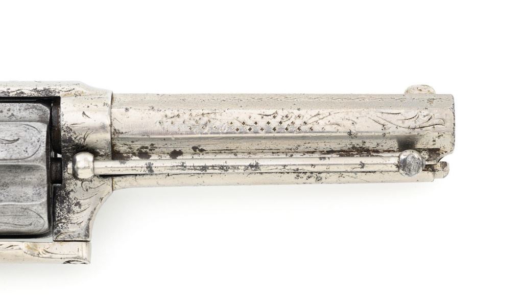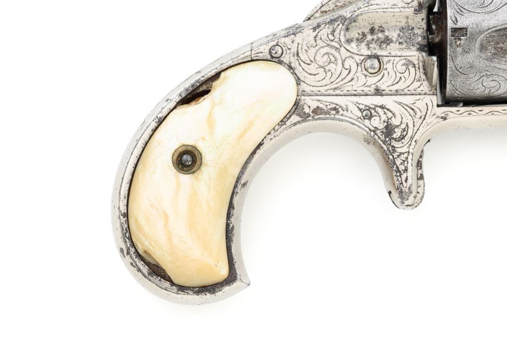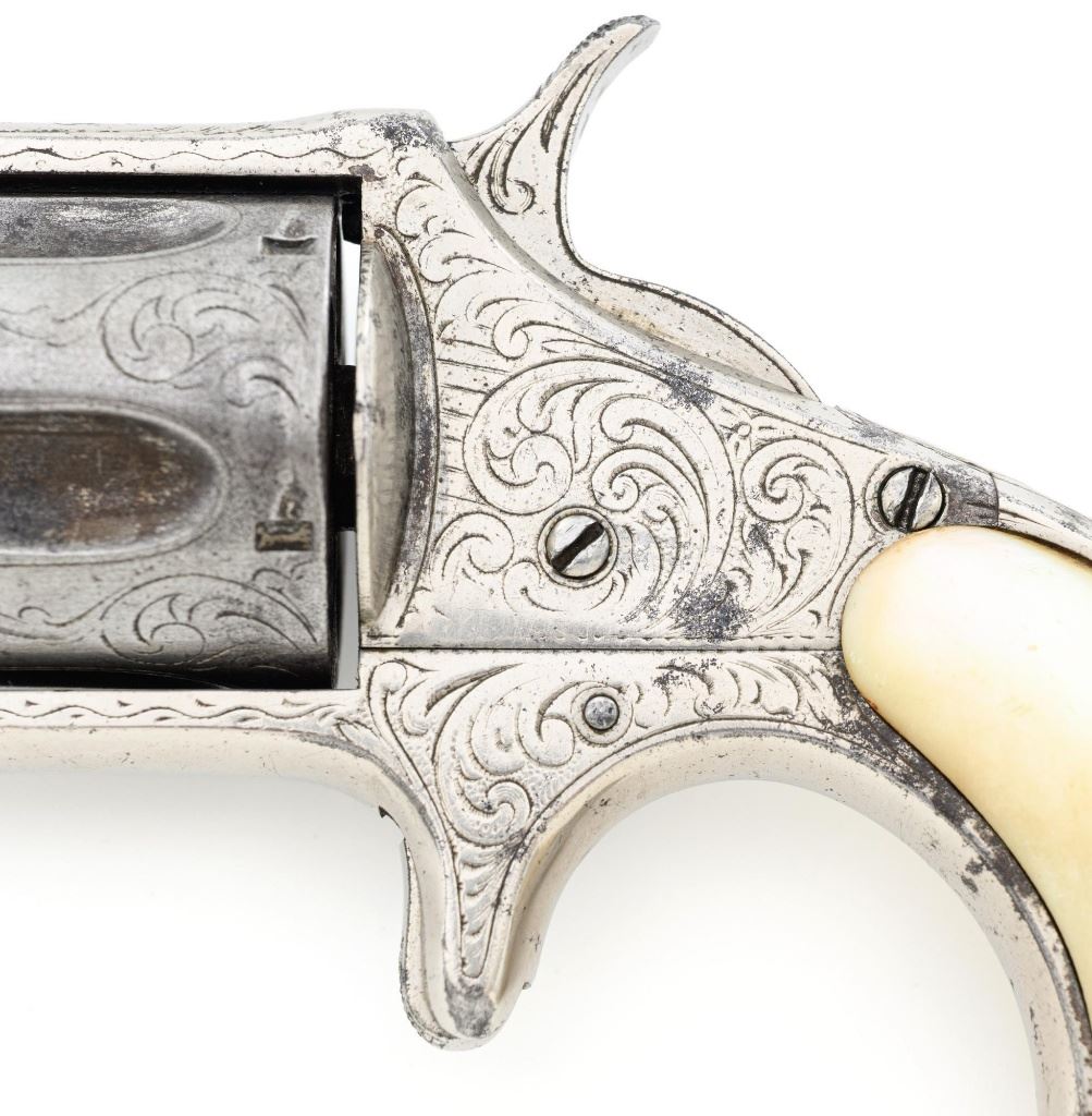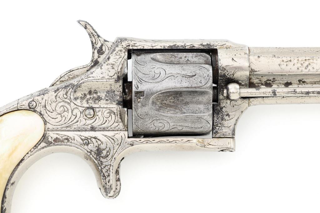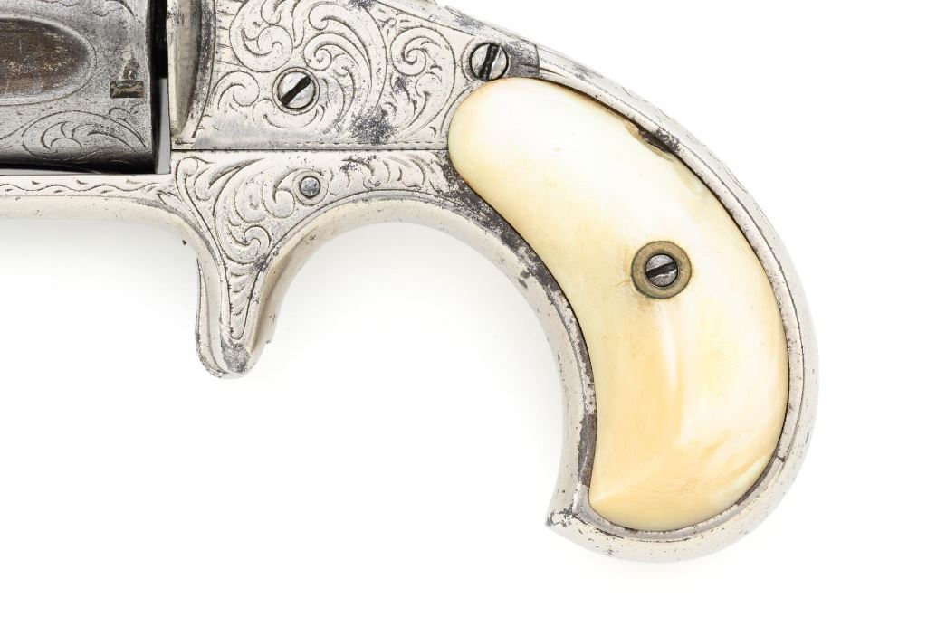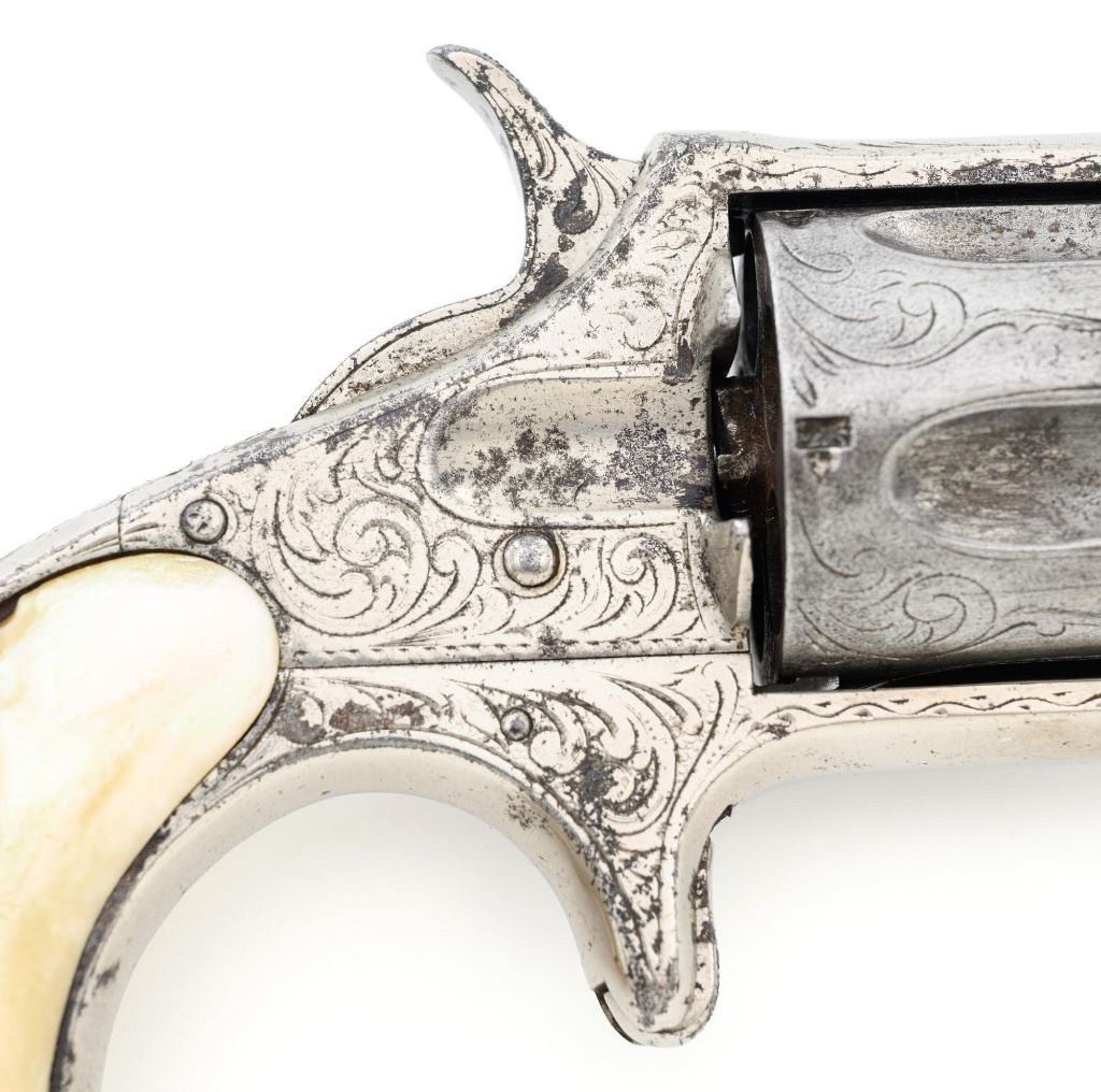 Early Production Engraved Remington-Smoot #3 Birds Head Revolver, #NVSN, .38 RF Short cal., 3.75" octagon barrel without rib, two piece pearl grips, fixed blade front sight, and notched rear sight. Fixed V notch rear sight, fixed blade front sight. Metal surfaces with extensive period applied floral scroll engraving with scalloped borders, punch dot background, and checkered patterns to both sides of the barrel. Top of the barrel is marked with a partially legible address that reads "E. REMINGTON & SONS. ILION, N.Y. PAT. W.S. SM.." Approx. 12,500 were manufactured in this configuration without the barrel rib, few were engraved. Overall condition of this revolver is very good, displaying approx. 65%-70% nickel finish, showing areas of flaking, light oxidation, and pitting. Pearl grips are near good, showing two old chips to the right grip panel and another small sliver missing from the left panel. Barrel address is partially legible and some of the engraving is soft. Action is crisp. Bore is fair with visible rifling and scattered erosion. Est.: $1,000-$1,500. (Antique) (Michael Strietbeck Collection)