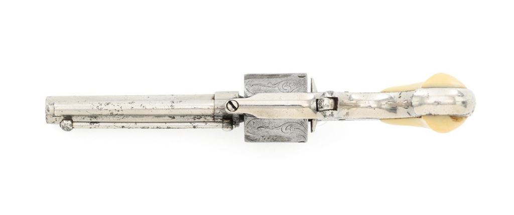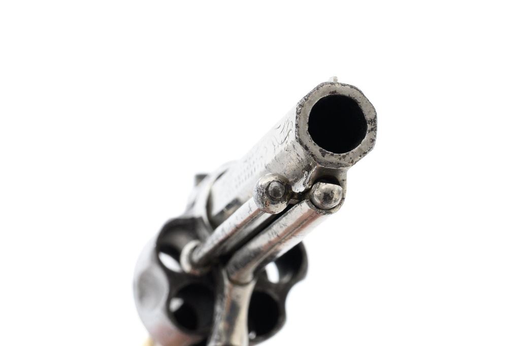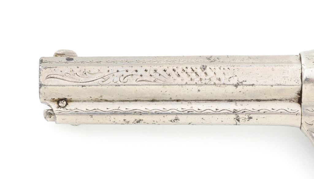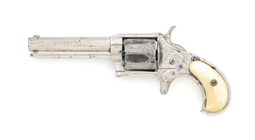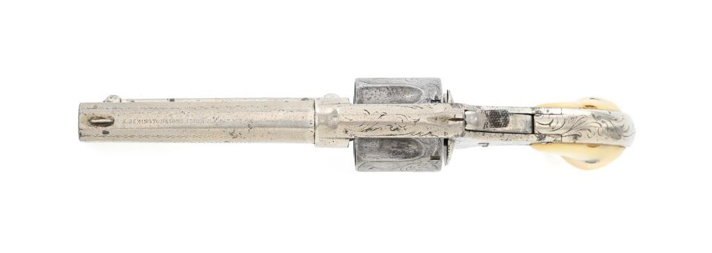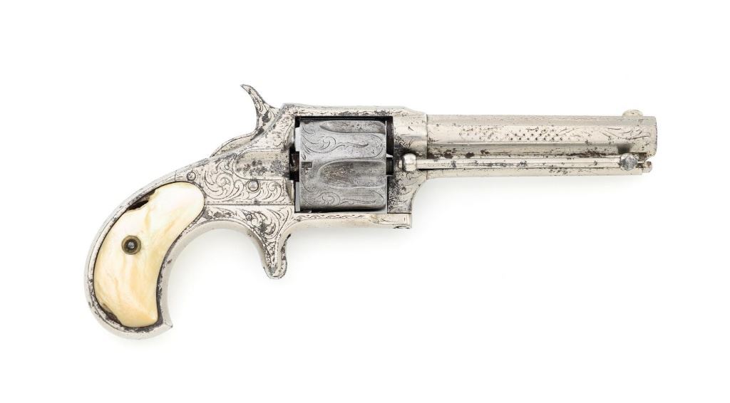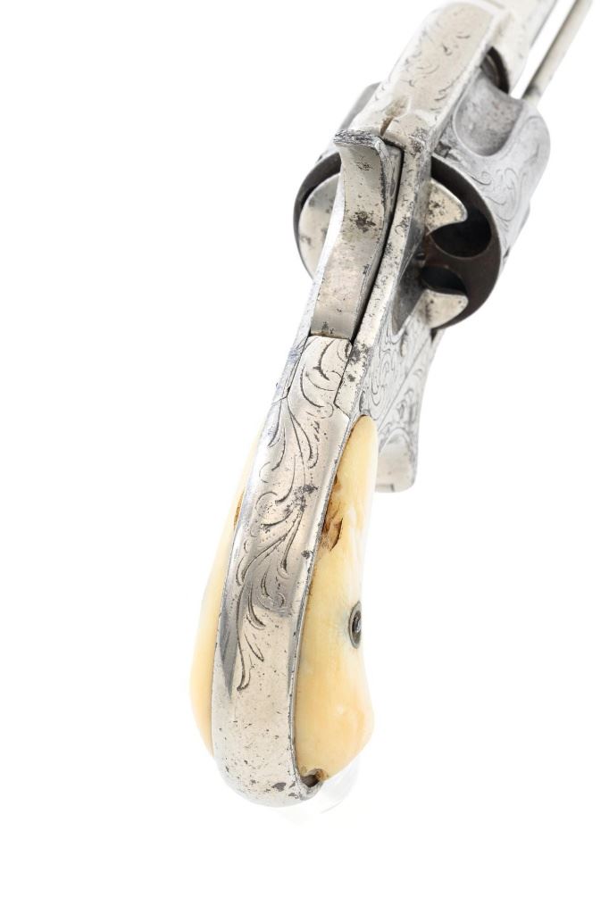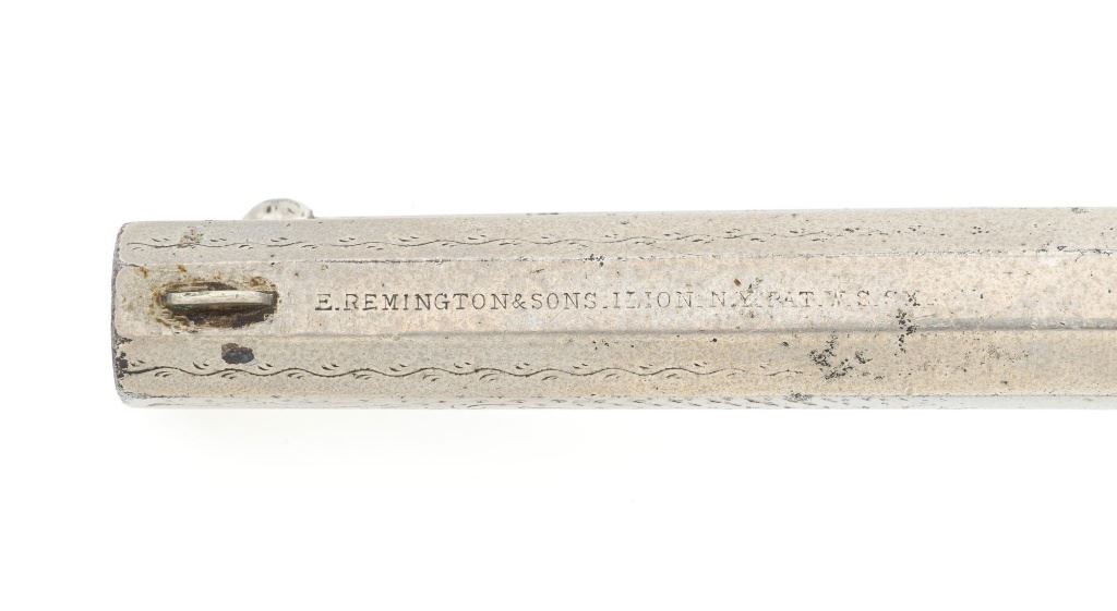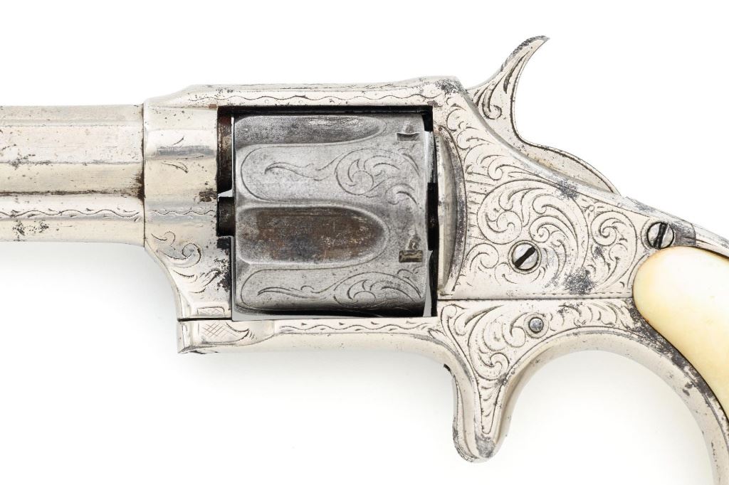Early Production Engraved Remington-Smoot #3 Birds Head Revolver, #NVSN, .38 RF Short cal., 3.75" octagon barrel without rib, two piece pearl grips, fixed blade front sight, and notched rear sight. Fixed V notch rear sight, fixed blade front sight. Metal surfaces with extensive period applied floral scroll engraving with scalloped borders, punch dot background, and checkered patterns to both sides of the barrel. Top of the barrel is marked with a partially legible address that reads "E. REMINGTON & SONS. ILION, N.Y. PAT. W.S. SM.." Approx. 12,500 were manufactured in this configuration without the barrel rib, few were engraved. Overall condition of this revolver is very good, displaying approx. 65%-70% nickel finish, showing areas of flaking, light oxidation, and pitting. Pearl grips are near good, showing two old chips to the right grip panel and another small sliver missing from the left panel. Barrel address is partially legible and some of the engraving is soft. Action is crisp. Bore is fair with visible rifling and scattered erosion. Est.: $1,000-$1,500. (Antique) (Michael Strietbeck Collection)