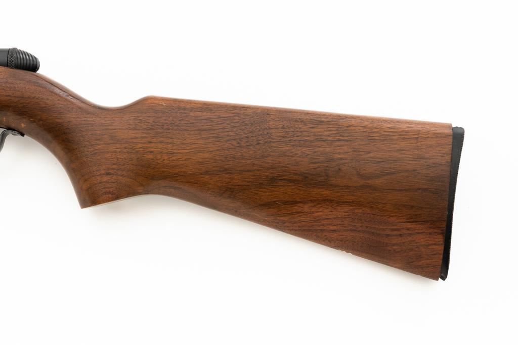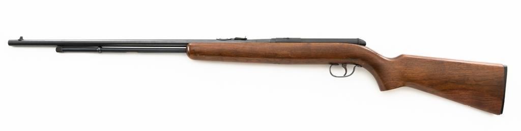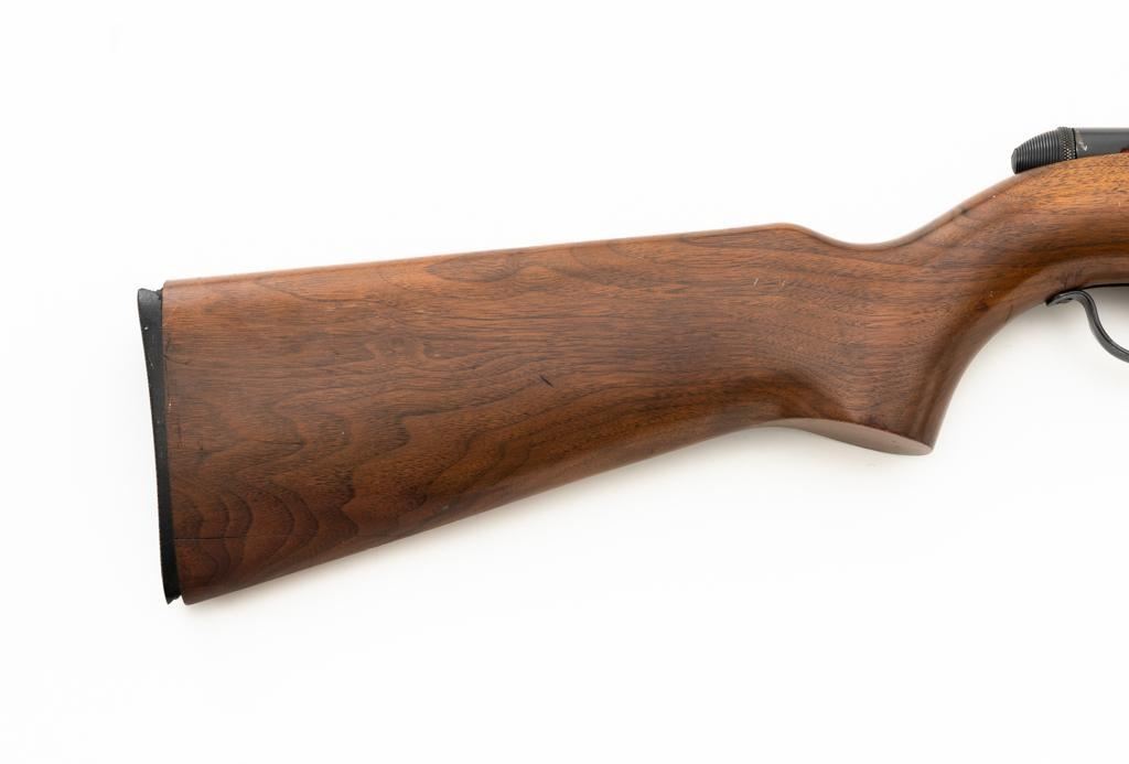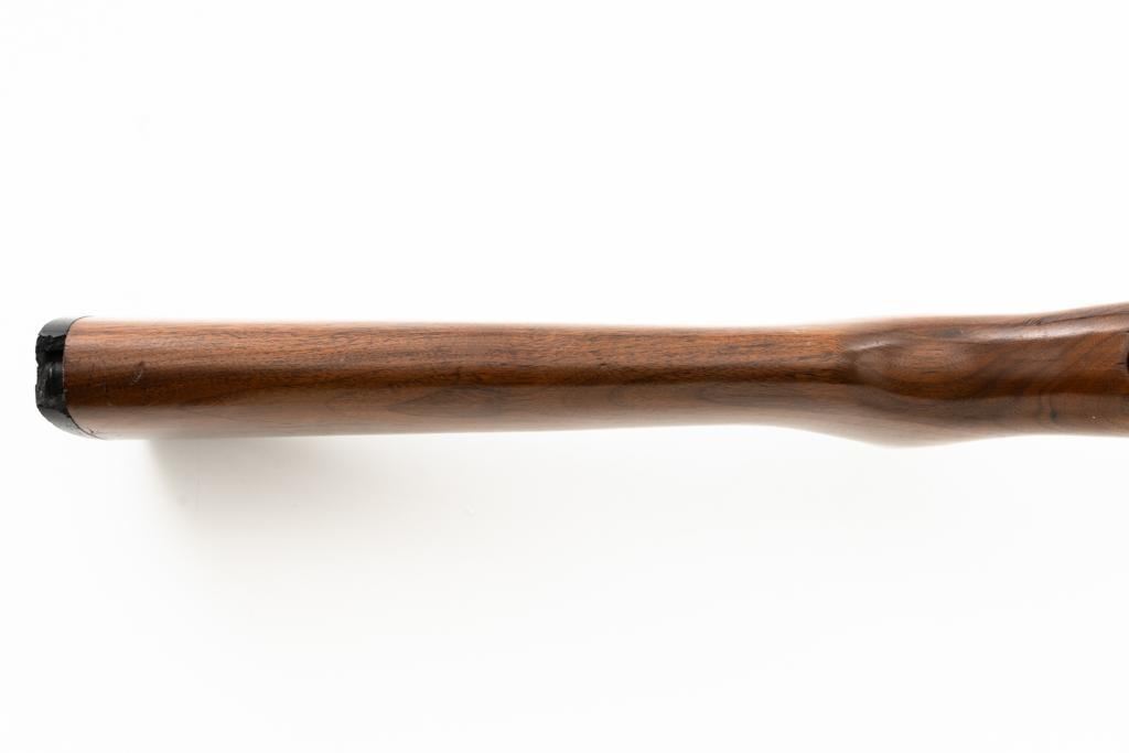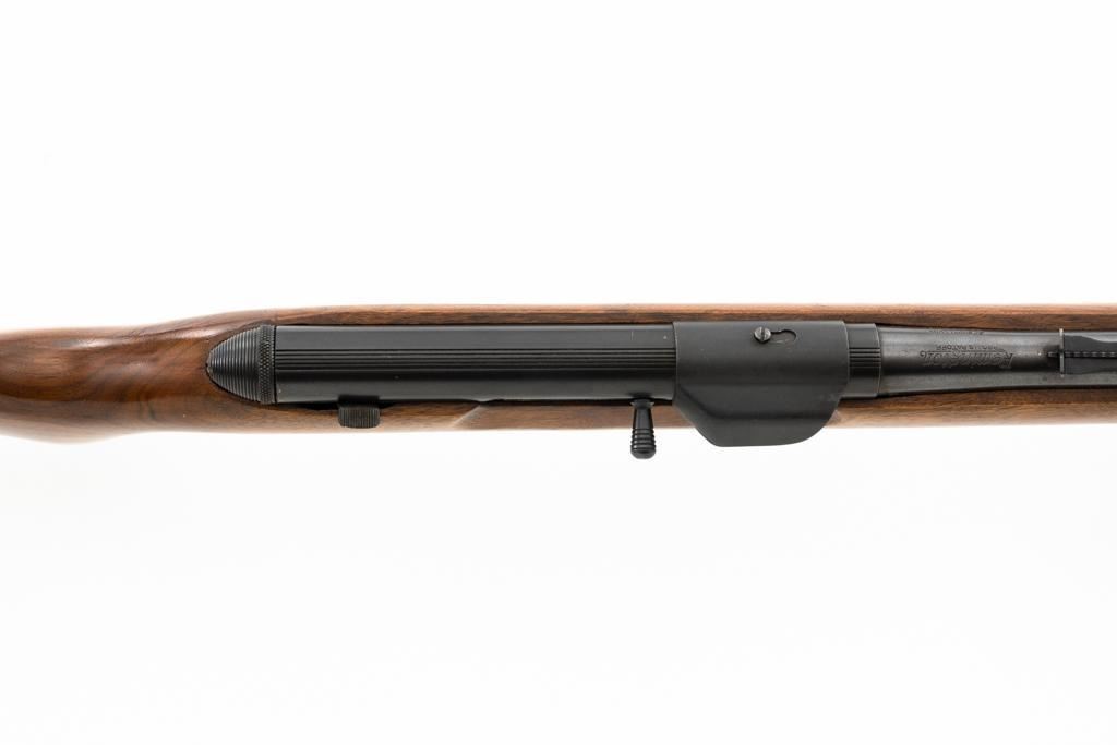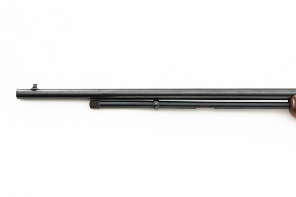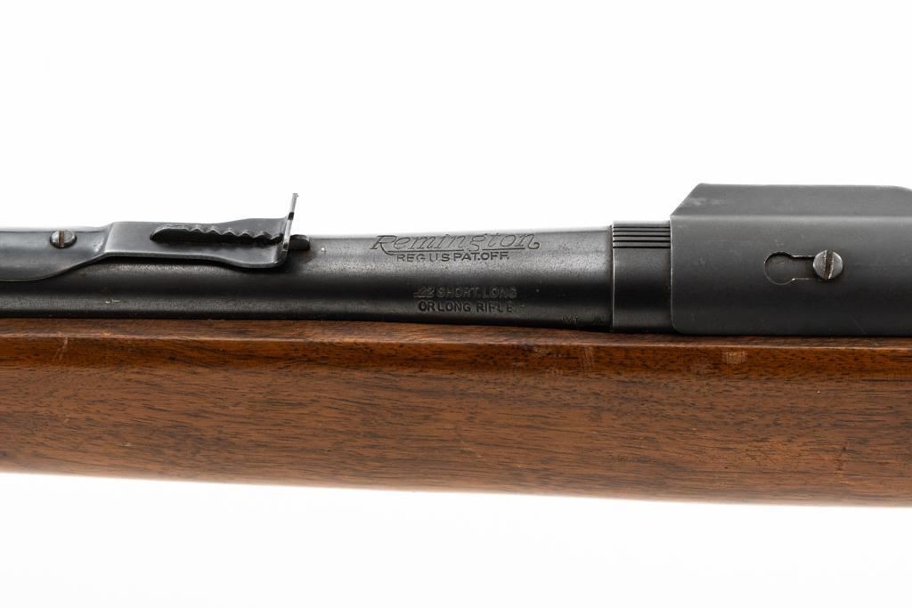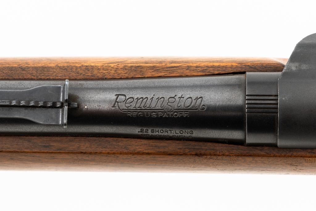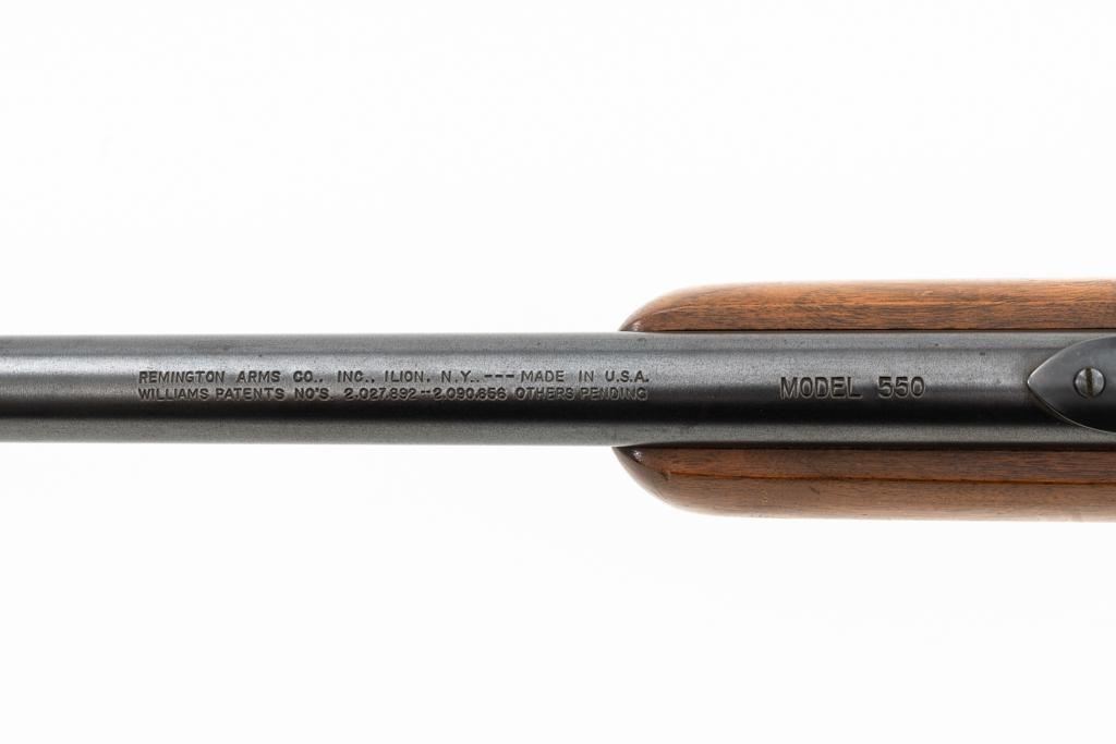 Early Remington Model 550 Semi-Automatic Rifle, #NVSN, .22 S-L-LR cal., 24" barrel, blue finish, smooth walnut one-piece pistol grip stock, dovetailed silver beaded blade front sight, standard elevator "U"-notched rear sight, with shell deflector and dual extractors. Mfg'd August 1942. Rifle is in near fine overall condition, retaining approx. 95%-96% blue finish, with light wear and loss of finish at the muzzle, a small rub mark on right side of the barrel, and small scratches towards the muzzle. Markings are sharp. Trigger is color case hardened and most of the finish remains. Stock is very good with scattered scratches and small indentations. There are several slightly deeper mars around both sides of the trigger guard. Buttstock was broken at the toe and repaired, likely with glue. Remington buttplate is chipped at the heel and toe, providing a 13.75" LOP. Action is crisp, bore is near excellent with strong rifling. Est.: $150-$250. (C&R)
