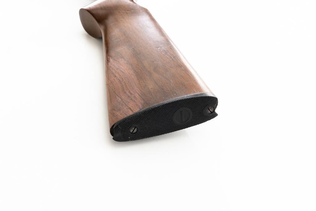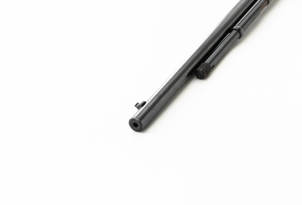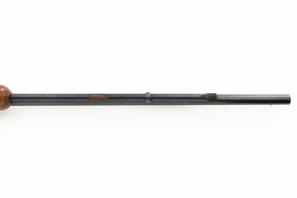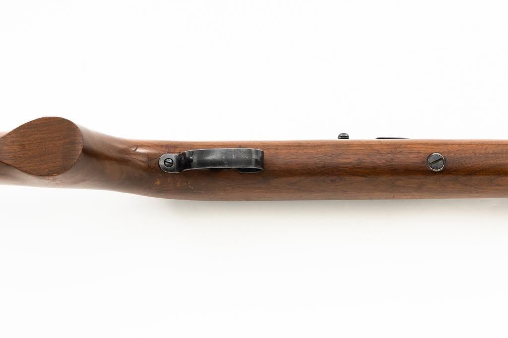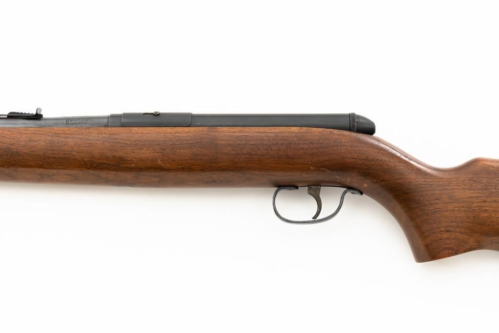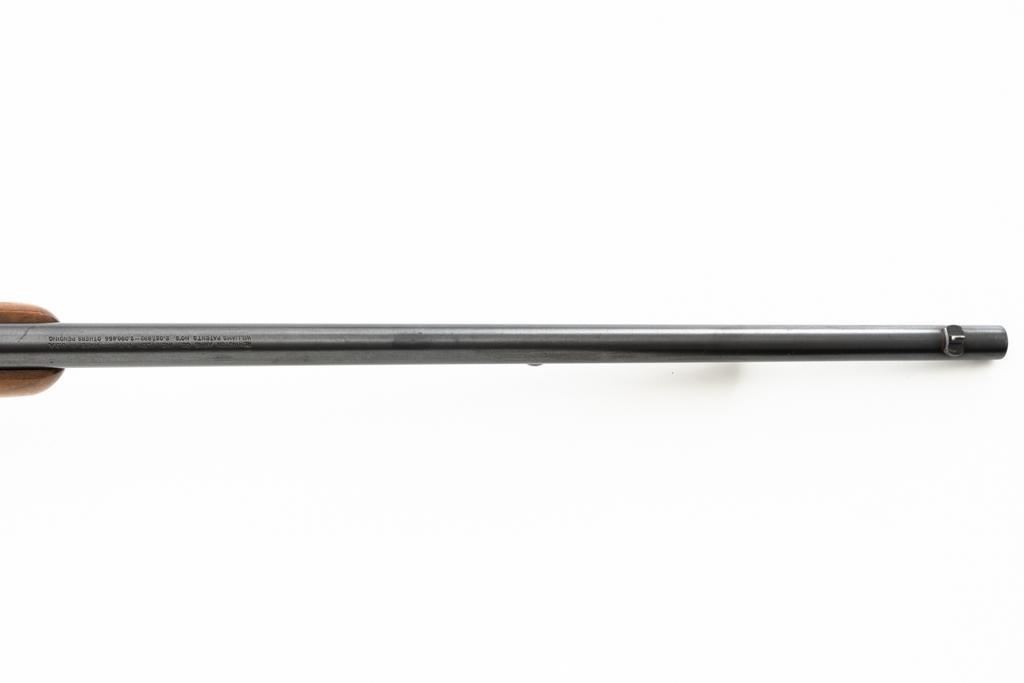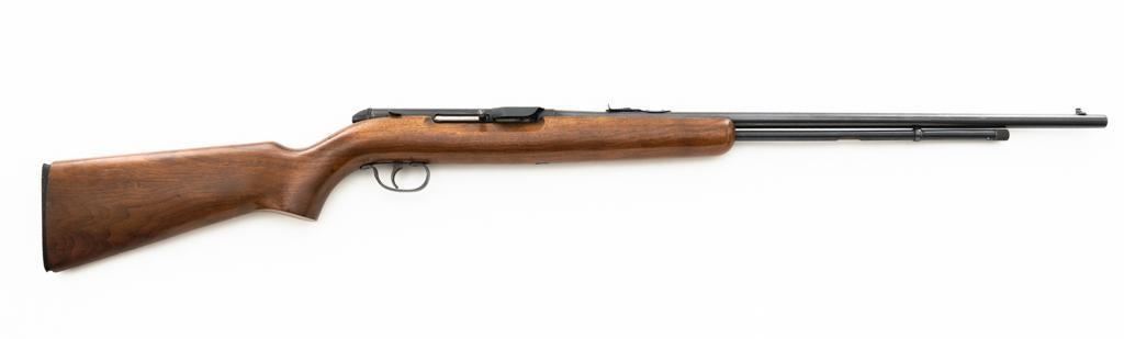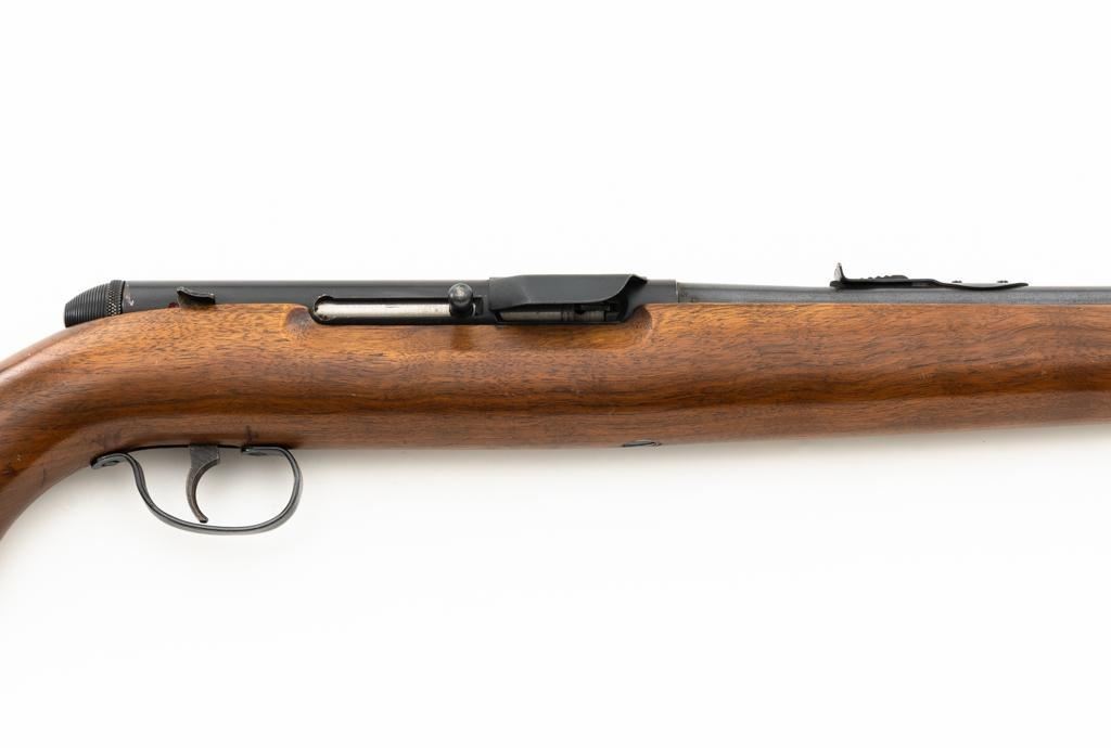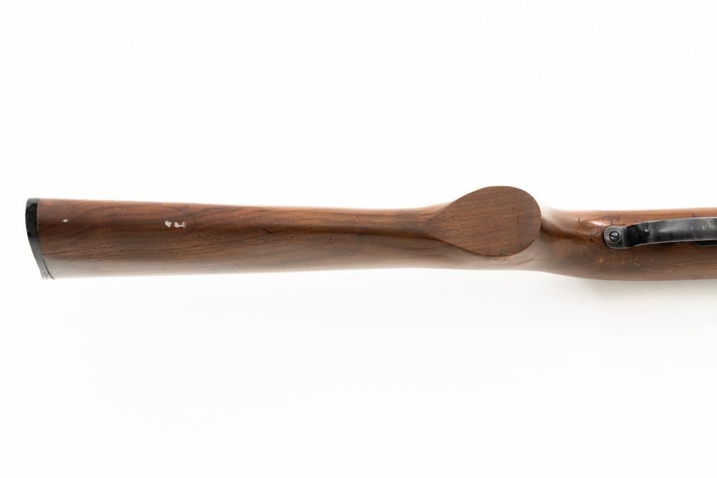 Early Remington Model 550 Semi-Automatic Rifle, #NVSN, .22 S-L-LR cal., 24" barrel, blue finish, smooth walnut one-piece pistol grip stock, dovetailed silver beaded blade front sight, standard elevator "U"-notched rear sight, with shell deflector and dual extractors. Mfg'd August 1942. Rifle is in near fine overall condition, retaining approx. 95%-96% blue finish, with light wear and loss of finish at the muzzle, a small rub mark on right side of the barrel, and small scratches towards the muzzle. Markings are sharp. Trigger is color case hardened and most of the finish remains. Stock is very good with scattered scratches and small indentations. There are several slightly deeper mars around both sides of the trigger guard. Buttstock was broken at the toe and repaired, likely with glue. Remington buttplate is chipped at the heel and toe, providing a 13.75" LOP. Action is crisp, bore is near excellent with strong rifling. Est.: $150-$250. (C&R)