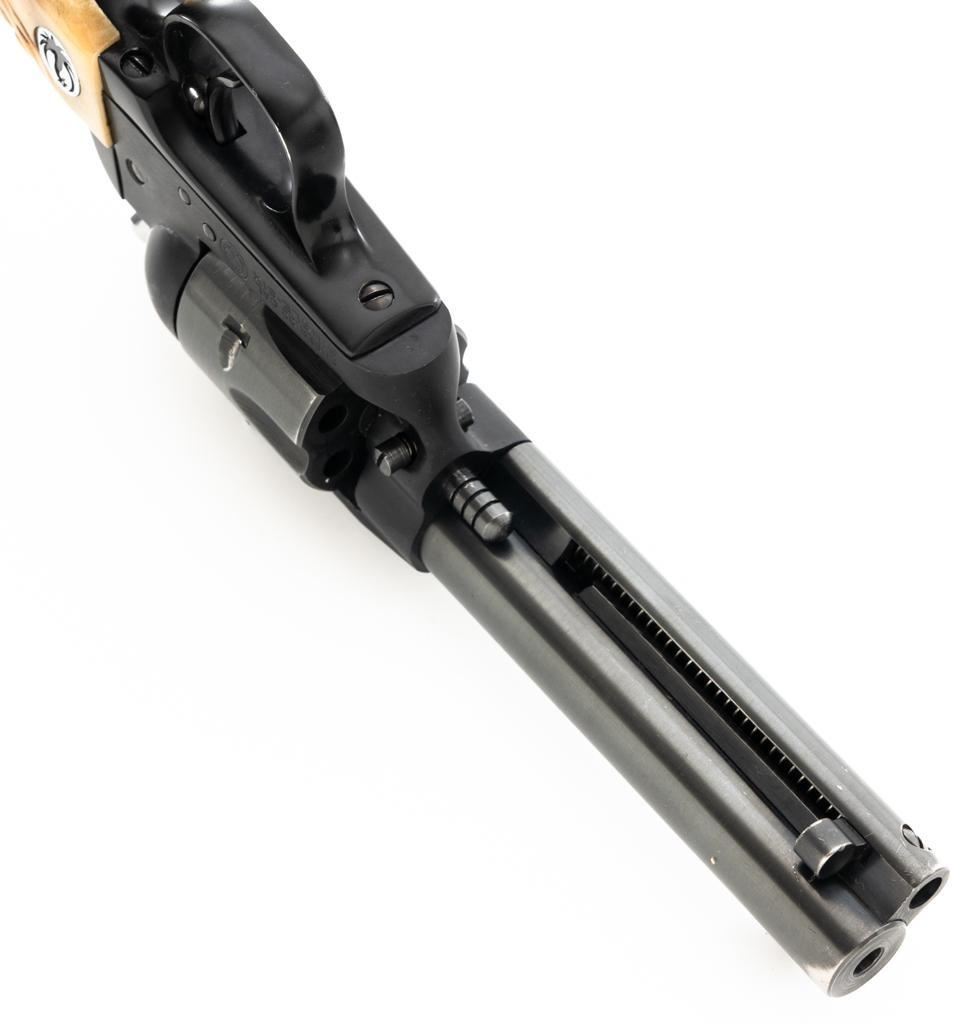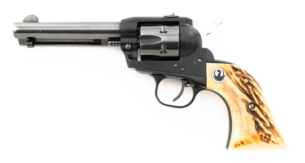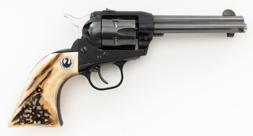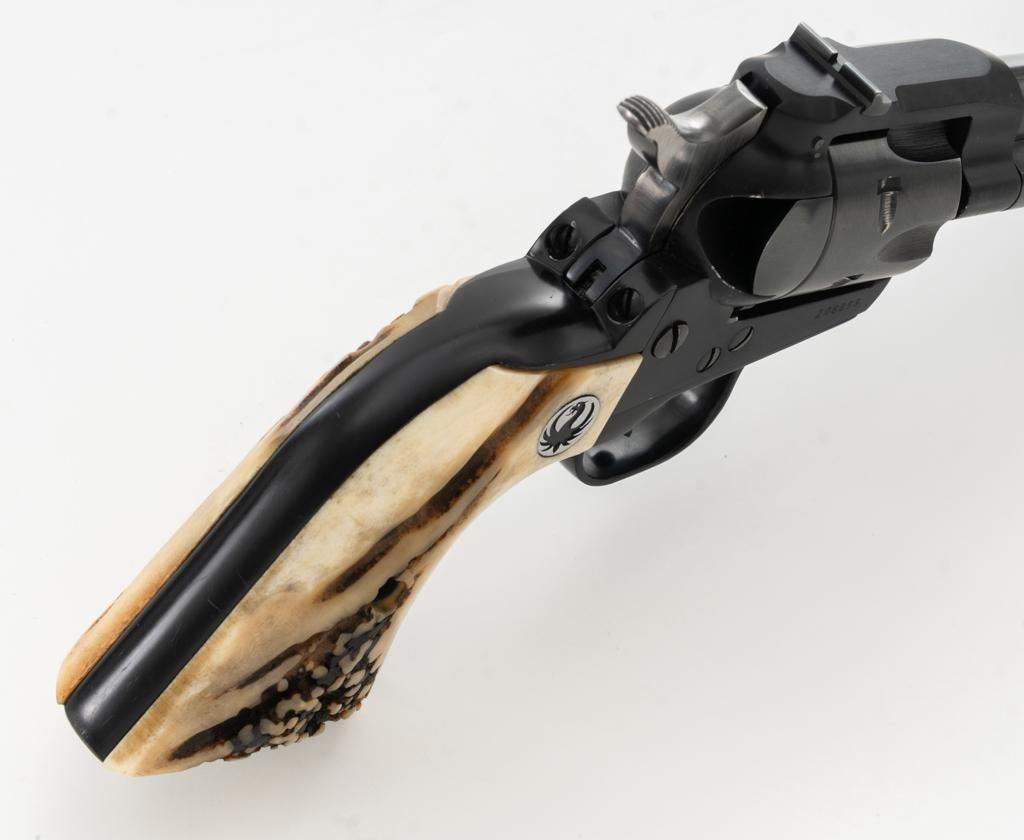 Early Ruger Single-Six Single Action Revolver, #206859, .22 LR cal., 4.6" barrel, blue finish, stag two-piece grips with Ruger medallions, blade front and drift adjustable square-notch rear sights, pre-hammer block safety. Mfgd 1962. Revolver is in fine overall condition, retaining approx. 95%-96% toning factory finish, with holster wear at the muzzle, along the ejector rod housing and at the high points. Cylinder shows light leading edge wear. Butt of the revolver has two threaded vacant holes. Grips are outstanding with attractive figure and have taken on a pleasing patina with shiny Ruger medallions. Action functions smoothly with very good timing. Bore is very good with some mild frosting and well-defined rifling. The 4.6" barrel was only offered from 1959-1962. Stag grips were also an early factory option. Est.: $400-$600. (C&R/PPT)