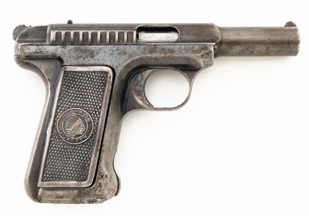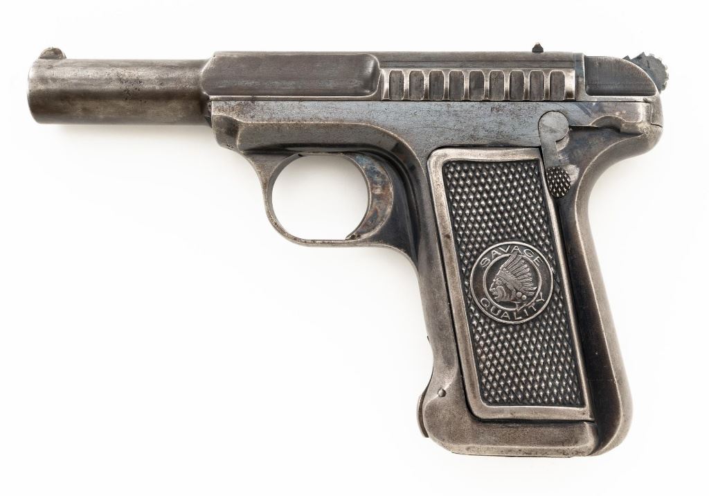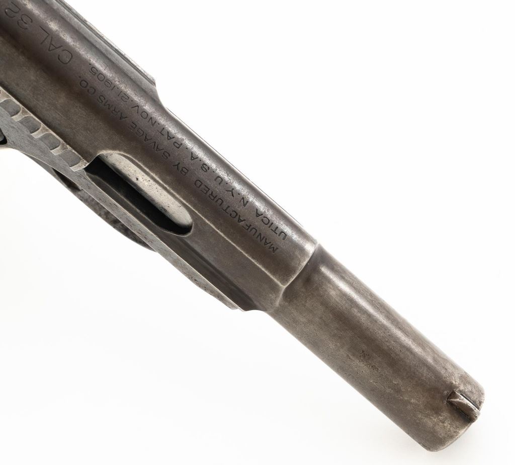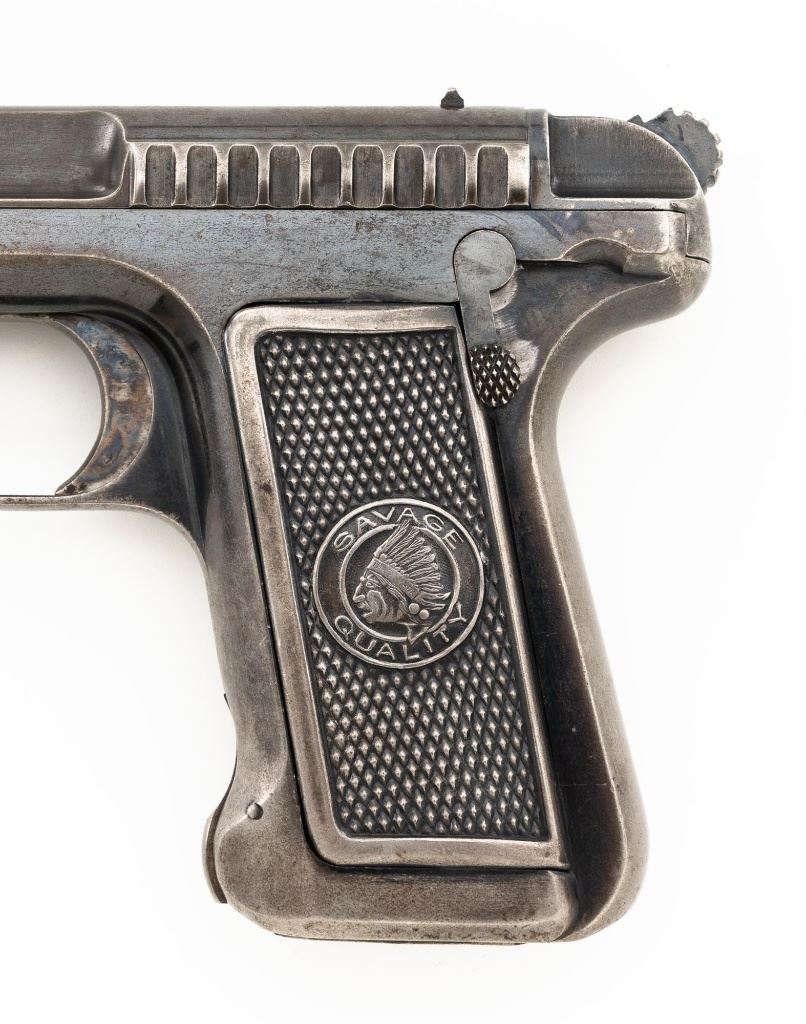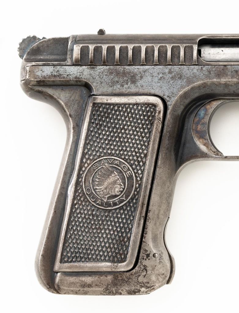 Early Savage Model 1907 Semi-Automatic Pistol, #10555, .32 ACP cal., 3.75" barrel, blue finish, checkered steel Savage grips, color case hardened trigger, round blade front sight, fixed "U"-notch rear sight, with one 10-round magazine. Mfgd 1909. Pistol is in good overall condition, retaining approx. 50%-55% thinning factory finish, drifting to gray patina, showing general areas of thinning and finish loss. Additionally, there are scattered spots of erosion and fine pin prick pitting on the right side of the frame. Trigger displays muted color case hardening. Grips are in very good condition, with a strong "SAVAGE QUALITY" Chief emblem. Action functions well. Bore is good, with areas of visible light erosion, and defined rifling. Est.: $200-$300. (C&R/PPT)