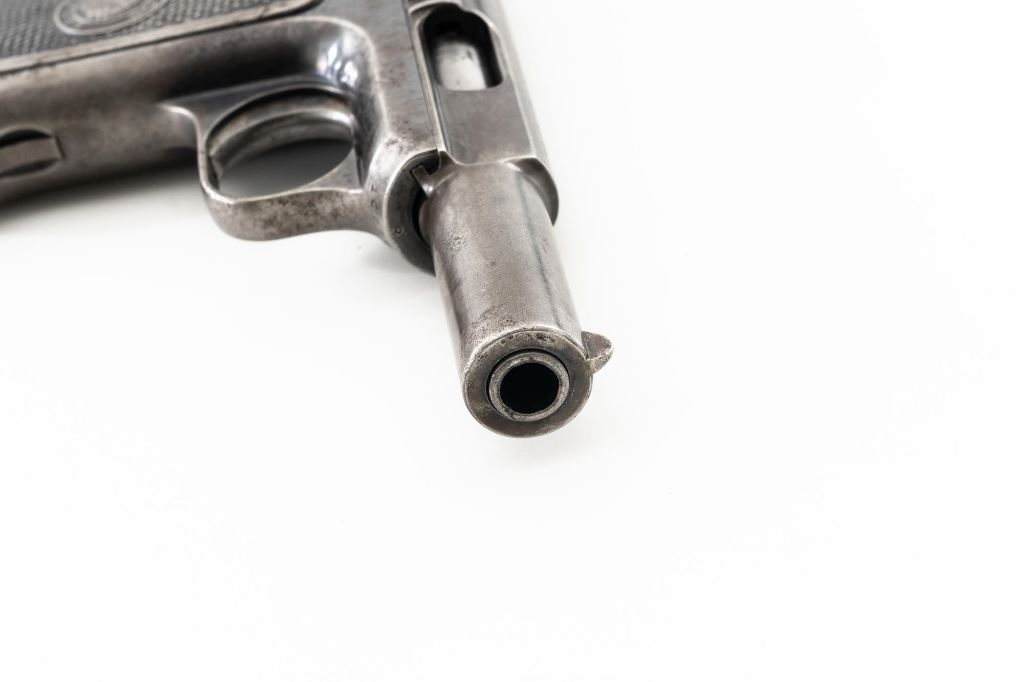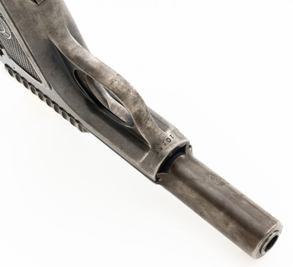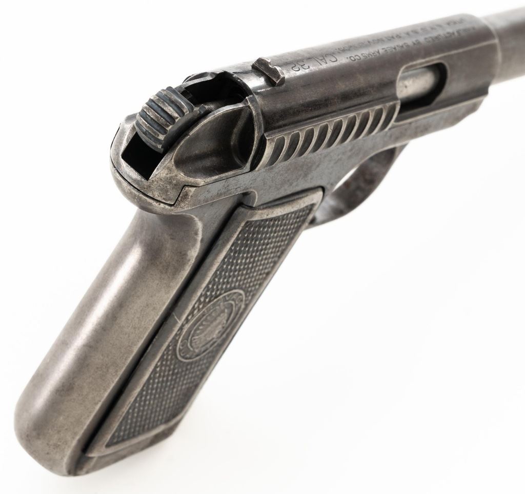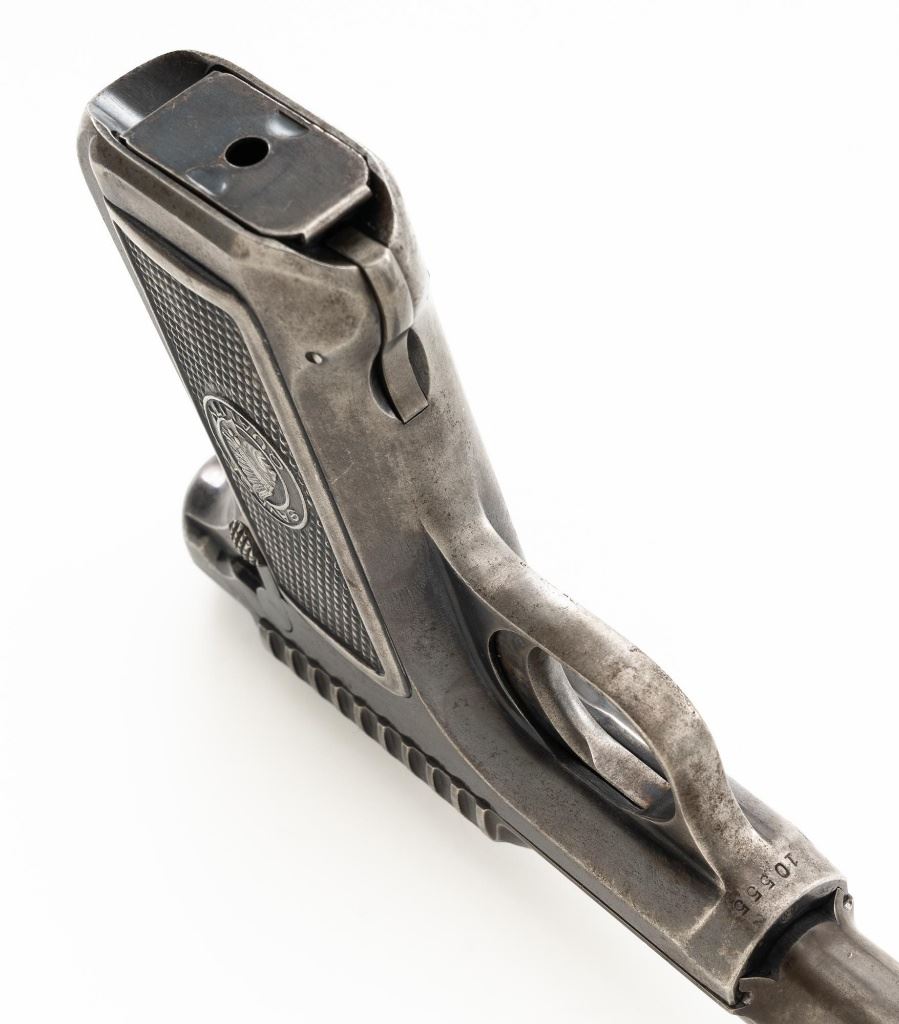 Early Savage Model 1907 Semi-Automatic Pistol, #10555, .32 ACP cal., 3.75" barrel, blue finish, checkered steel Savage grips, color case hardened trigger, round blade front sight, fixed "U"-notch rear sight, with one 10-round magazine. Mfgd 1909. Pistol is in good overall condition, retaining approx. 50%-55% thinning factory finish, drifting to gray patina, showing general areas of thinning and finish loss. Additionally, there are scattered spots of erosion and fine pin prick pitting on the right side of the frame. Trigger displays muted color case hardening. Grips are in very good condition, with a strong "SAVAGE QUALITY" Chief emblem. Action functions well. Bore is good, with areas of visible light erosion, and defined rifling. Est.: $200-$300. (C&R/PPT)