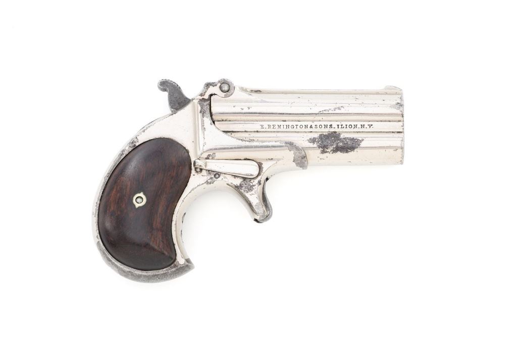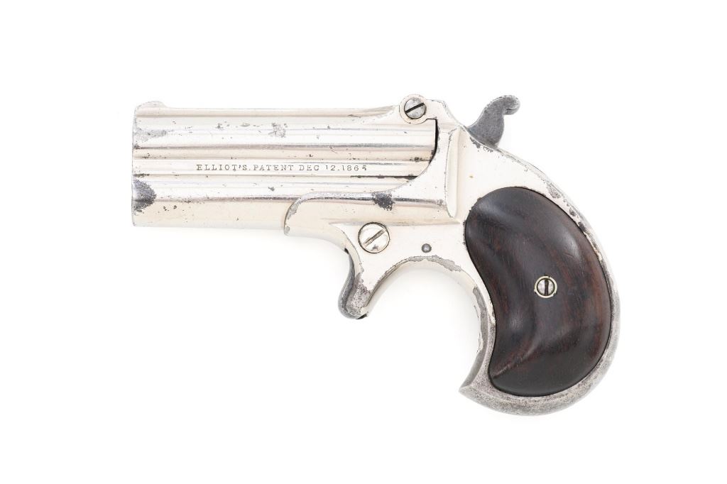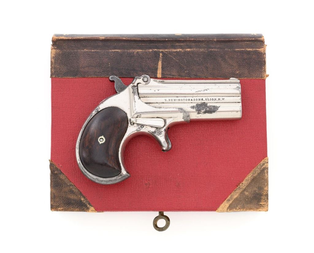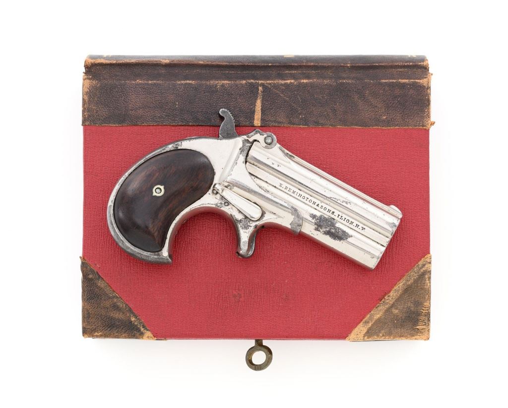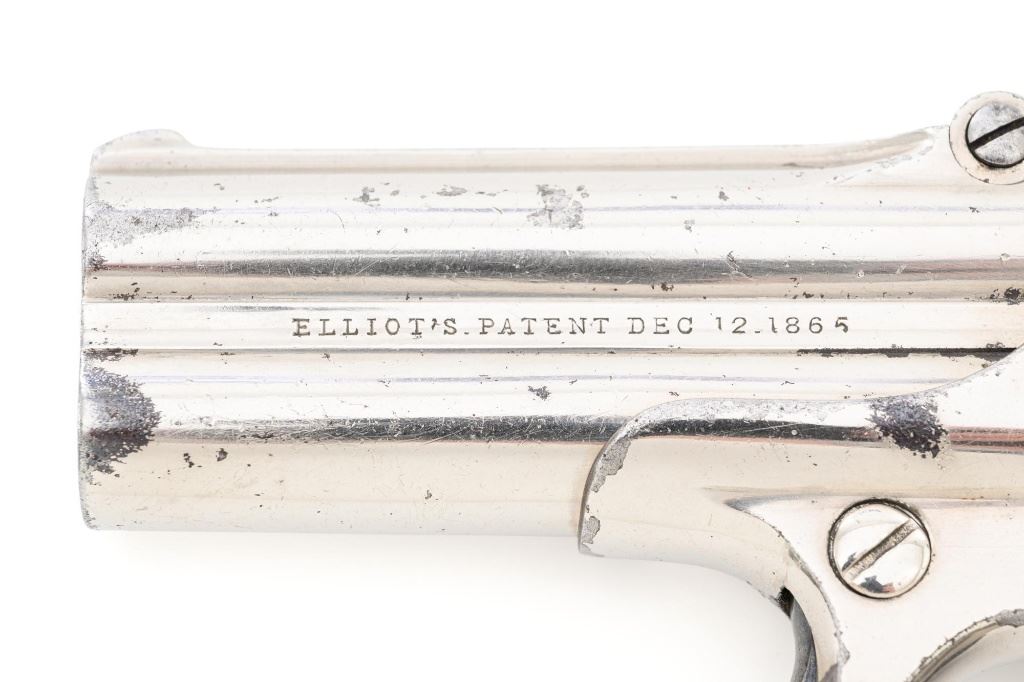 Early production Type I Remington-Elliot Double Derringer, #1622, .41 RF short cal., 3" barrels, nickel finish, blued hammer and trigger, no extractor, two-piece rosewood grips, integral blade front sight, and fixed notched rear sight. Left side of the barrel is marked "ELLIOTS. PATENT DEC 12, 1865". Right side "E. REMINGTON & SONS. ILION, N.Y.". Matching number on left side of the grip frame and underside of the barrel. Mfgd circa 1866, with less than 2,000 Type I produced without the extractor. Overall condition is near fine, retaining approx. 70%-75% factory nickel finish, with losses primarily to the grip frame and right side of the barrel. Factory lettering is clear. Hinge is not damaged. Grips are near excellent, with only a few light handling marks, and a majority of their rich oil finish present. Action is crisp. Bore is dark with general moderate erosion and clearly defined rifling. Contained in lockable concealment book case, with blue interior, and 6-cartridge storage capacity. Marked on the spine "TWIN BARREL JUSTICE --- REMINGTON". In fine overall condition, showing scuffs and wear to the leather binding and corners. Est.: $1,600-$2,200. (Antique).(Michael Strietbeck Collection)