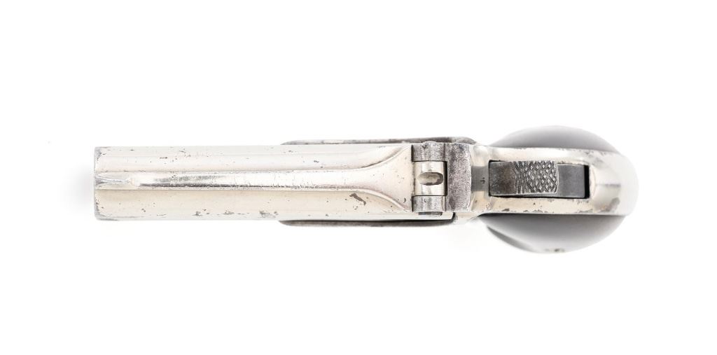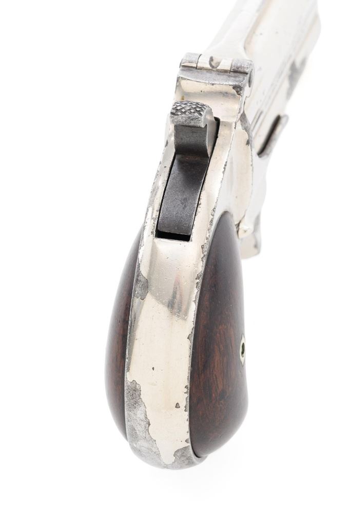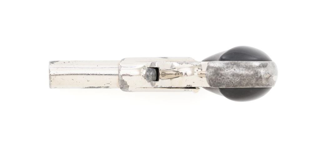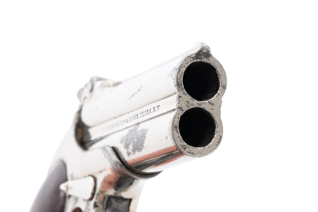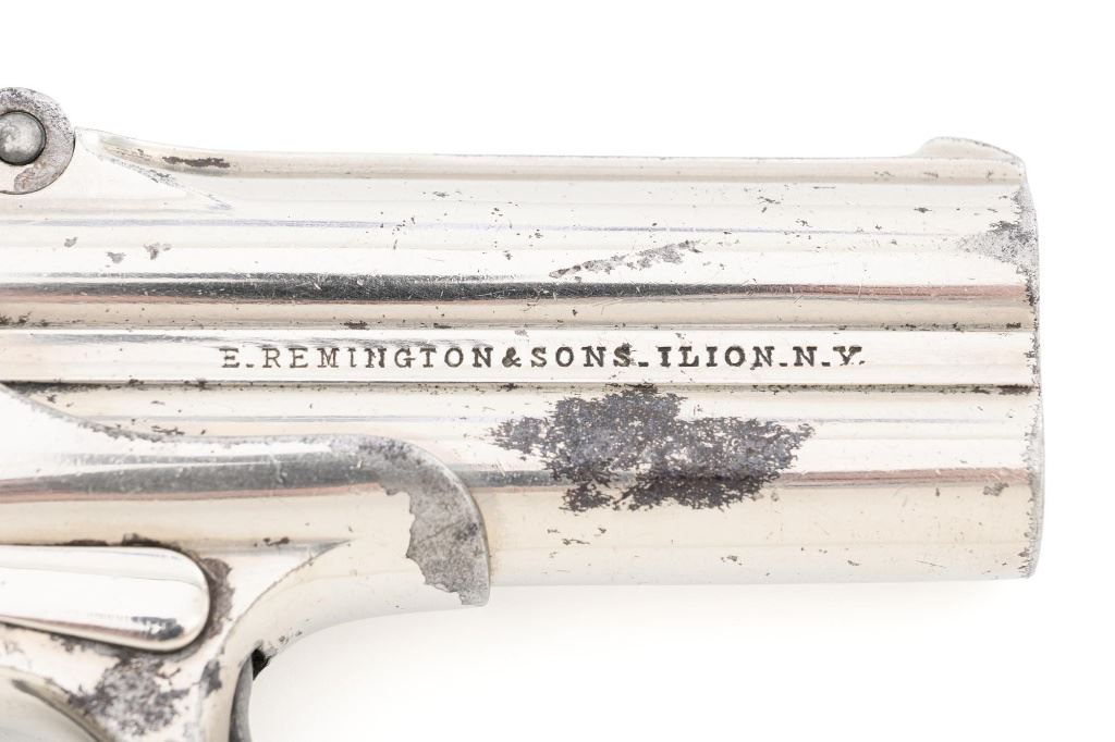 Early production Type I Remington-Elliot Double Derringer, #1622, .41 RF short cal., 3" barrels, nickel finish, blued hammer and trigger, no extractor, two-piece rosewood grips, integral blade front sight, and fixed notched rear sight. Left side of the barrel is marked "ELLIOTS. PATENT DEC 12, 1865". Right side "E. REMINGTON & SONS. ILION, N.Y.". Matching number on left side of the grip frame and underside of the barrel. Mfgd circa 1866, with less than 2,000 Type I produced without the extractor. Overall condition is near fine, retaining approx. 70%-75% factory nickel finish, with losses primarily to the grip frame and right side of the barrel. Factory lettering is clear. Hinge is not damaged. Grips are near excellent, with only a few light handling marks, and a majority of their rich oil finish present. Action is crisp. Bore is dark with general moderate erosion and clearly defined rifling. Contained in lockable concealment book case, with blue interior, and 6-cartridge storage capacity. Marked on the spine "TWIN BARREL JUSTICE --- REMINGTON". In fine overall condition, showing scuffs and wear to the leather binding and corners. Est.: $1,600-$2,200. (Antique).(Michael Strietbeck Collection)