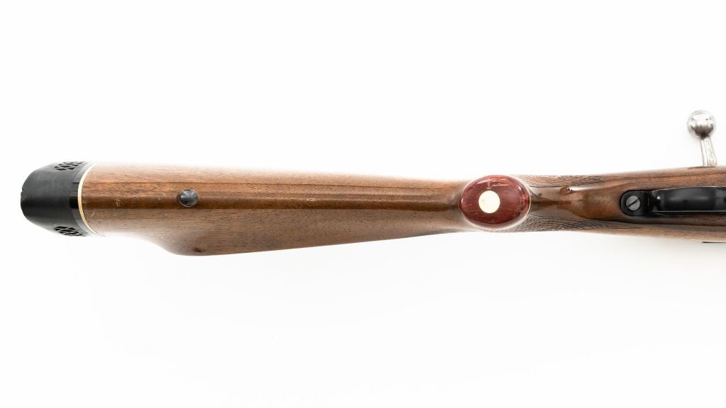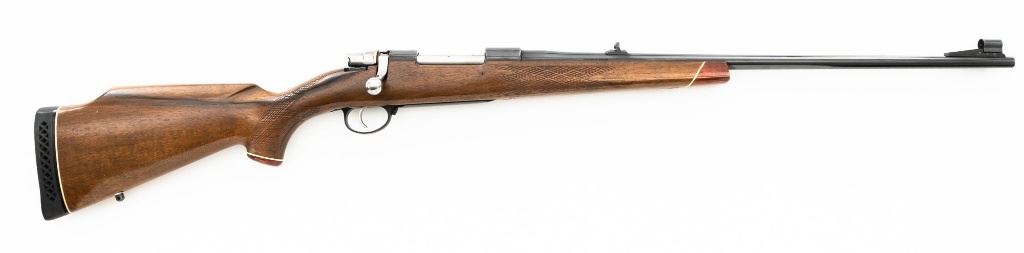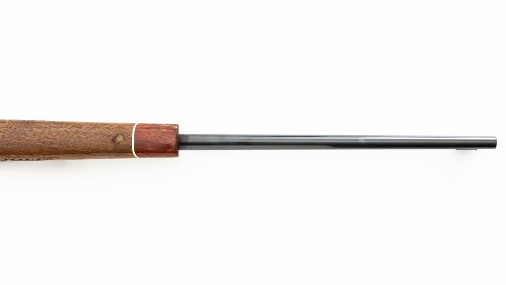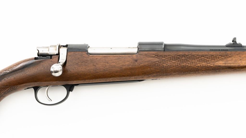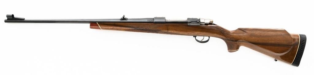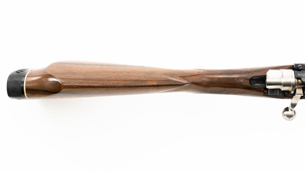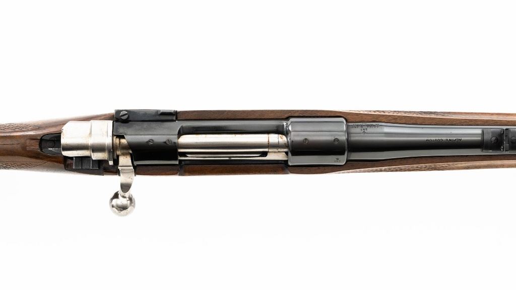 English Proofed Alpine Custom FN Mauser Bolt Action Sporting Rifle, #P-59211, .30-06 cal., 24" barrel, with blue finish. Checkered walnut one-piece Monte Carlo stock with rosewood forend tip and grip cap, buttstock ends with a ventilated rubber recoil pad, providing a 14.6" LOP. Rifle also features a hooded ramped blade front sight, adjustable "U"-notch rear sight, drilled and tapped receiver, chrome bolt modified for scope mounting and etched with matching serial number, and trigger bow release internal box magazine. Marked "ALPINE CUSTOM" on the barrel at the breech, English nitro proofed on the barrel and front ring. Right side of the barrel is makers marked "FIREARMS CO. ENGLAND" and the left side is import marked "CALLAN WESTERN SALES LOS ALAMITOS CALIFORNIA." Rifle is in near excellent overall condition, retaining approx. 97%-98% toning finish, with handling marks and scratches around the front sight. Receiver shows minor storage marks and some areas of dried oil, with some light scratching to the floorplate/trigger guard. Stock is in near excellent condition with scattered minor scratches and scuffs. Front sling swivel stud has been removed and plugged. Action functions smoothly. Bore is near excellent with well-defined rifling. Est.: $500-$700. (Modern)