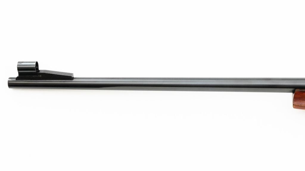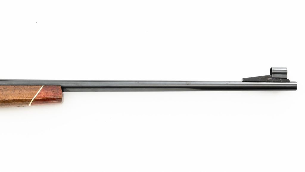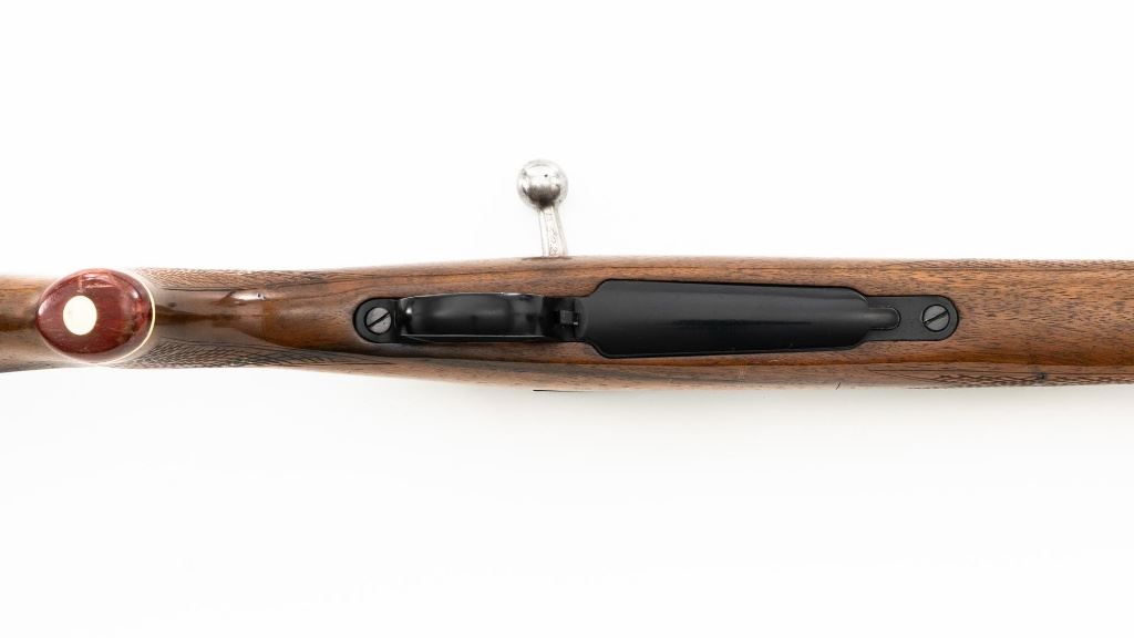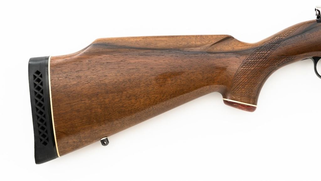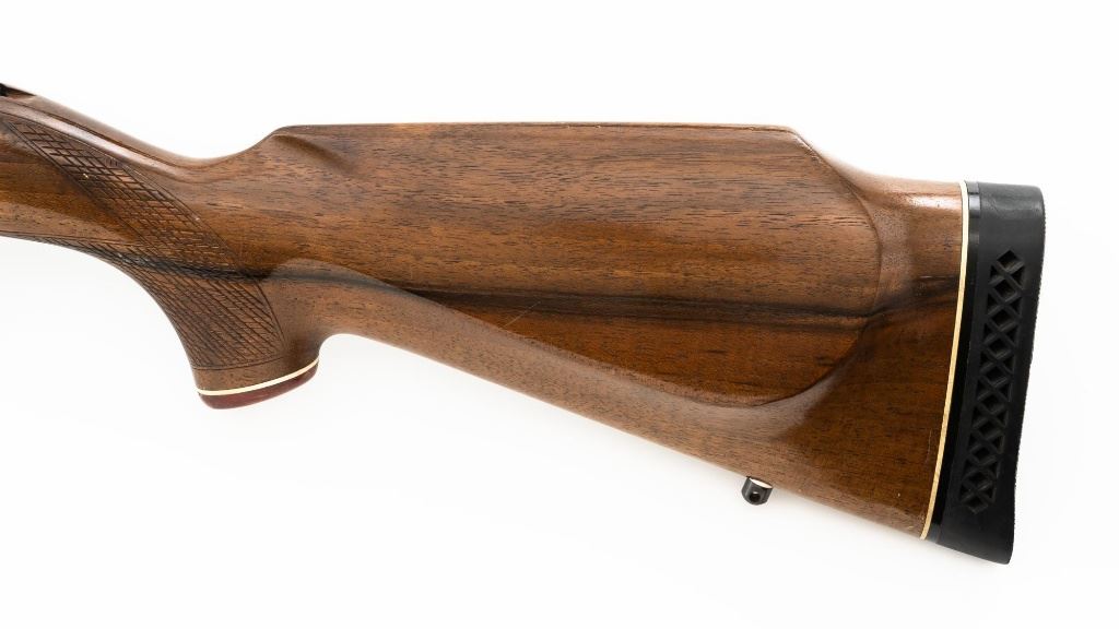 English Proofed Alpine Custom FN Mauser Bolt Action Sporting Rifle, #P-59211, .30-06 cal., 24" barrel, with blue finish. Checkered walnut one-piece Monte Carlo stock with rosewood forend tip and grip cap, buttstock ends with a ventilated rubber recoil pad, providing a 14.6" LOP. Rifle also features a hooded ramped blade front sight, adjustable "U"-notch rear sight, drilled and tapped receiver, chrome bolt modified for scope mounting and etched with matching serial number, and trigger bow release internal box magazine. Marked "ALPINE CUSTOM" on the barrel at the breech, English nitro proofed on the barrel and front ring. Right side of the barrel is makers marked "FIREARMS CO. ENGLAND" and the left side is import marked "CALLAN WESTERN SALES LOS ALAMITOS CALIFORNIA." Rifle is in near excellent overall condition, retaining approx. 97%-98% toning finish, with handling marks and scratches around the front sight. Receiver shows minor storage marks and some areas of dried oil, with some light scratching to the floorplate/trigger guard. Stock is in near excellent condition with scattered minor scratches and scuffs. Front sling swivel stud has been removed and plugged. Action functions smoothly. Bore is near excellent with well-defined rifling. Est.: $500-$700. (Modern)