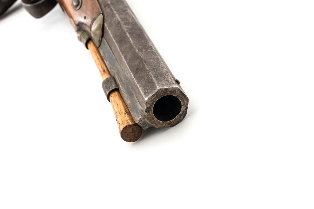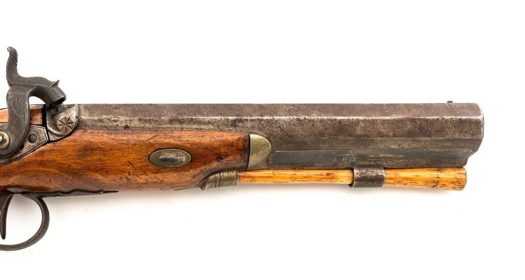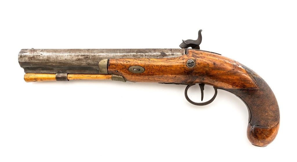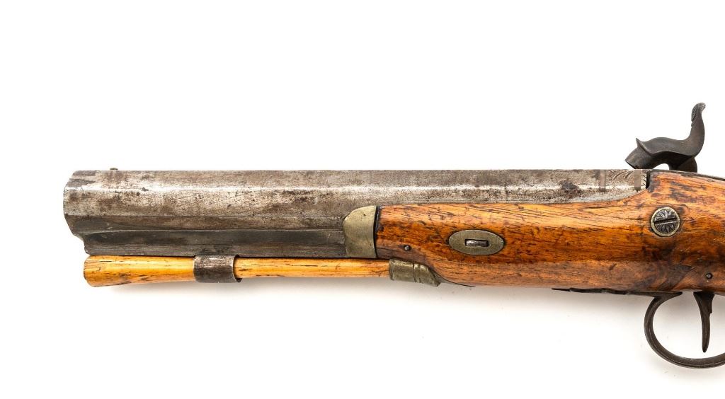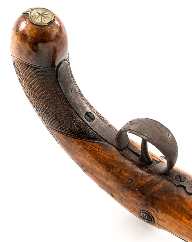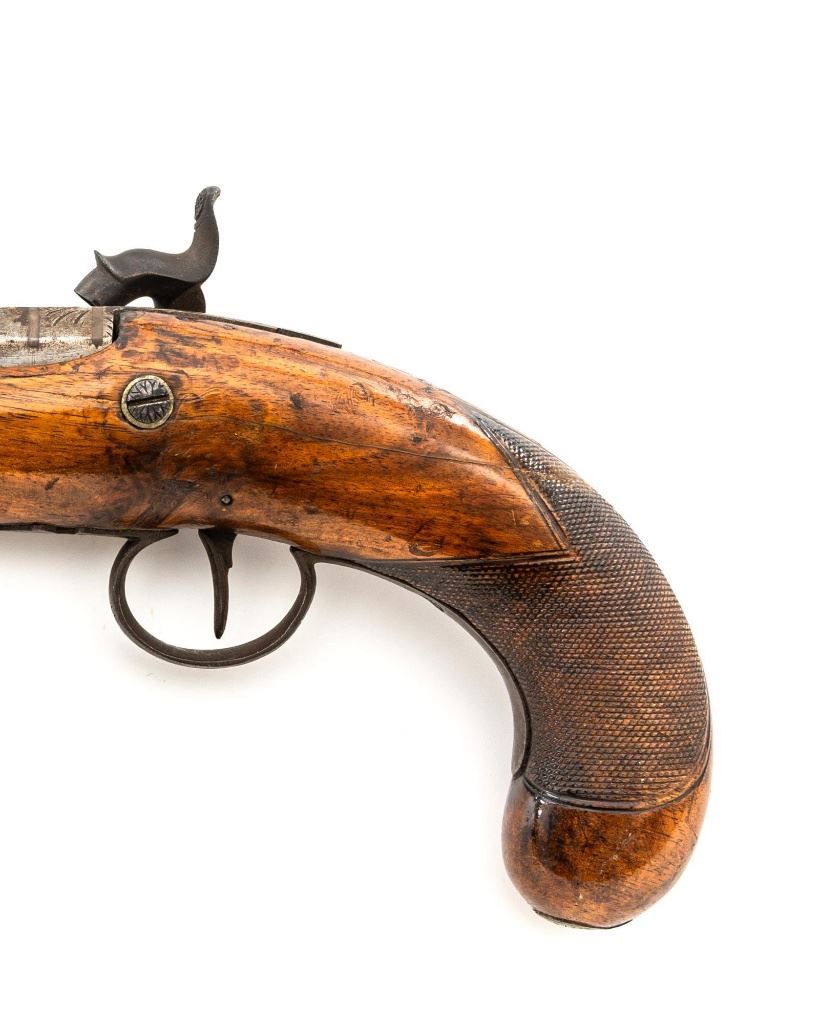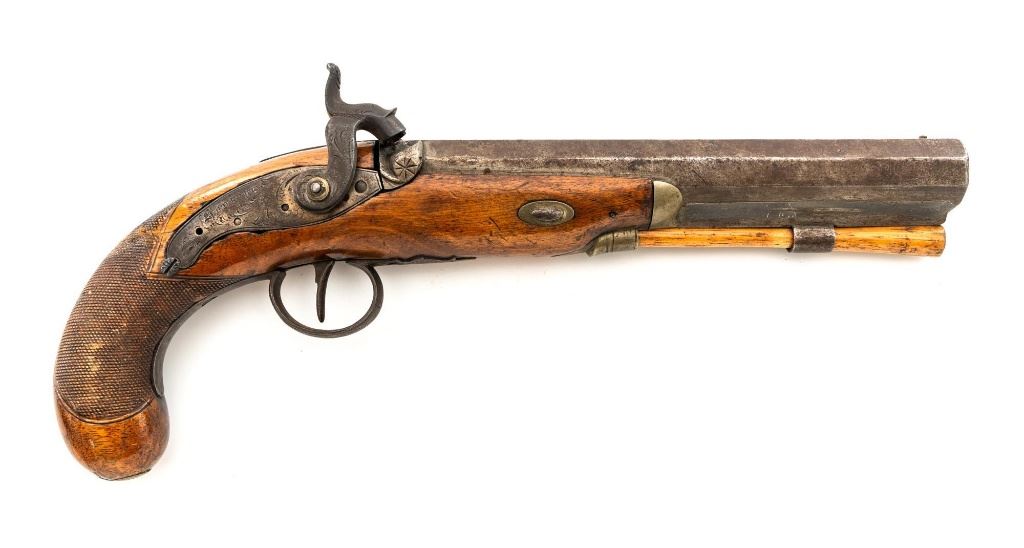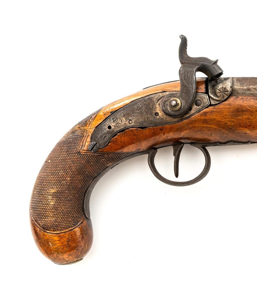 Engraved English Hopkins Single Shot Back Action Percussion Pistol, #NVSN, .58 cal., 7.75" octagon barrel, gray/brown patina to the metal parts, brass receiving thimble for the wood ramrod, and brass disc at the top of the wrist. Checkered hardwood stock. Marked "Hopkins" on the lockplate, "London" inscribed on the top barrel flat, light floral scroll engraving on the actions. Mfgd circa mid-1800s. Overall condition of this pistol is antique good. Wood with a hairline crack running approx. 6" across the wrist area. Markings are good. Action is not working, bore shows moderate erosion. Est.: $300-$500. (Antique)