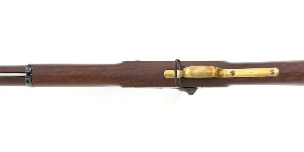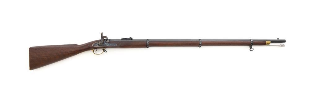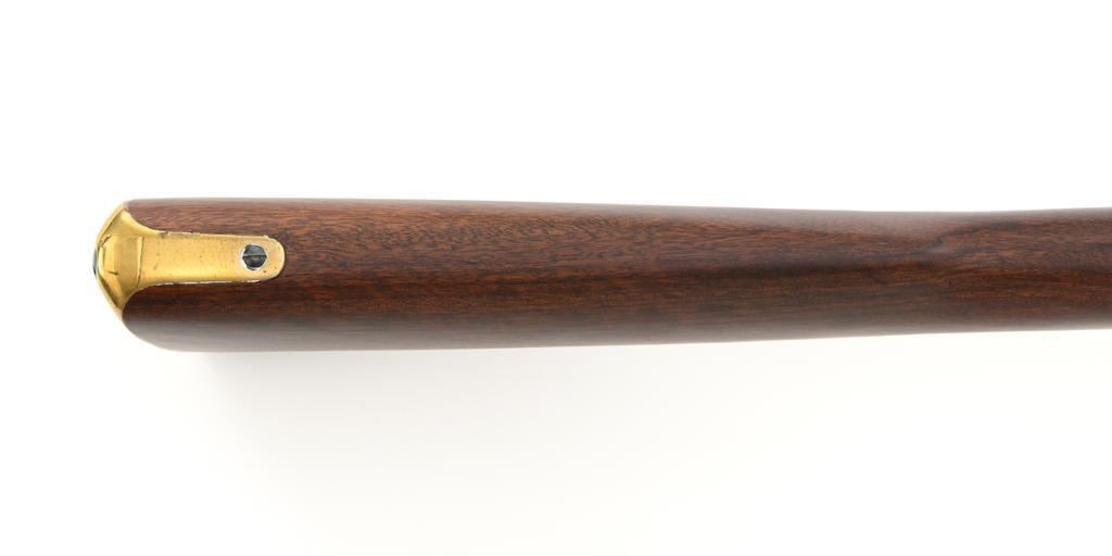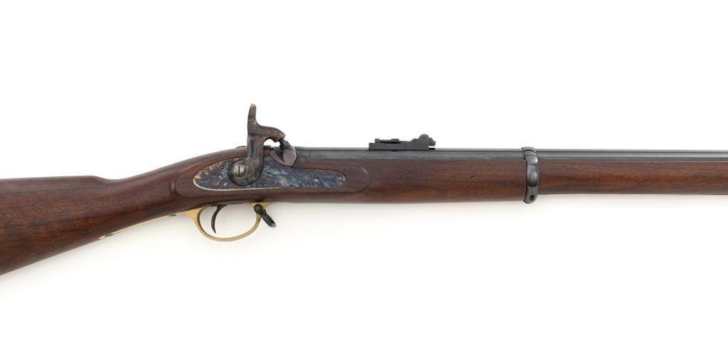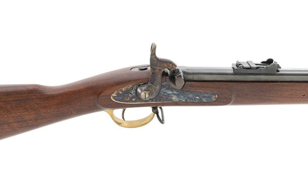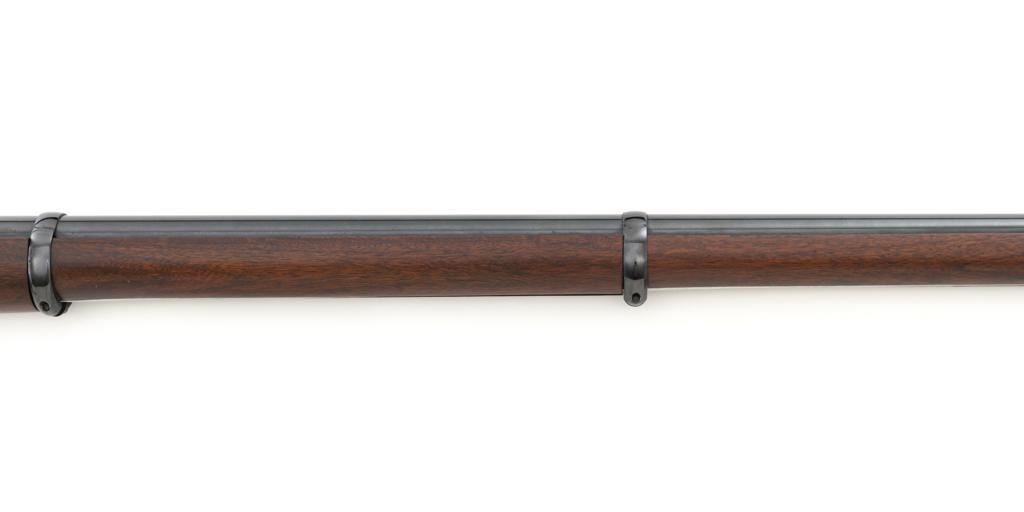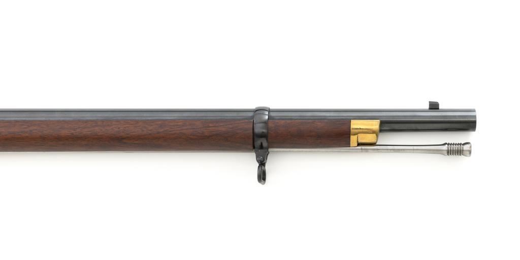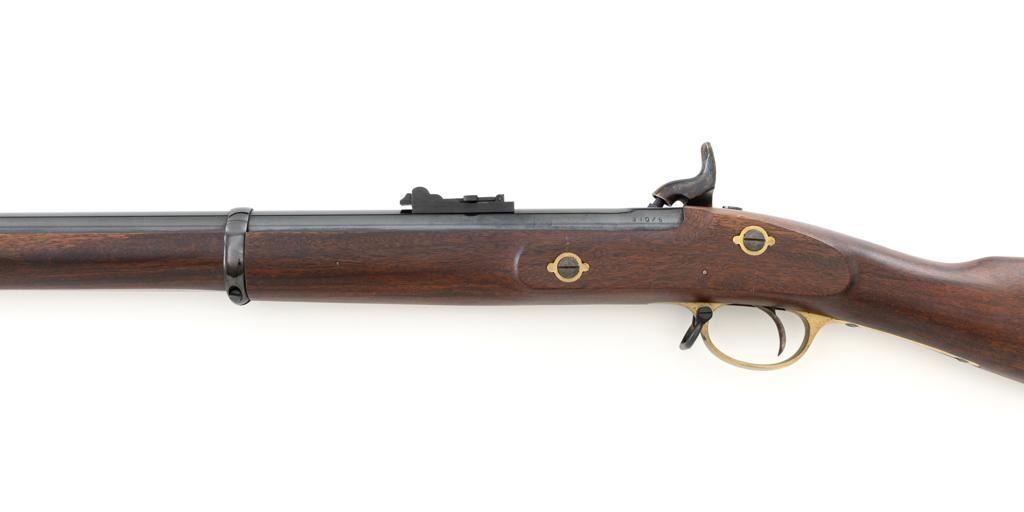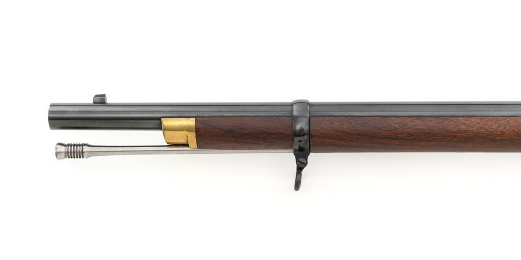 Euroarms America Pattern 1853 Enfield Rifled Musket, #31076, .577 cal., 39" round barrel with rifled bore, blued finish, hardwood stock with brass forend cap, trigger guard, and buttplate. Blade front sight and adjustable leaf rear sight with "V"-notched groove, graduated to 900 yards. An excellent condition steel rammer is mounted under the barrel. There are sling swivels mounted to the trigger guard and forend. Case hardened lock plate is marked "LONDON ARMORY Co." and there is a "(Crown)" stamped on the tail. Barrel in front of the rear sight is marked "EUROARMS OF AMERICA". Trigger guard rear tang is stamped "MADE IN ITALY". Condition overall is excellent, retaining approx. 98% factory blue, with a few spots of wear to the underside of the barrel at the muzzle. Lockplate retains vivid case colors and shows tiny surface scratches. Stock is excellent with light rub marks to the forend. Hammer operates smoothly and holds on half and full cock. Nipple appears to be in new condition. Bore is bright with excellent, well-defined rifling. Est.: $900-$1,200. (No FFL Required)