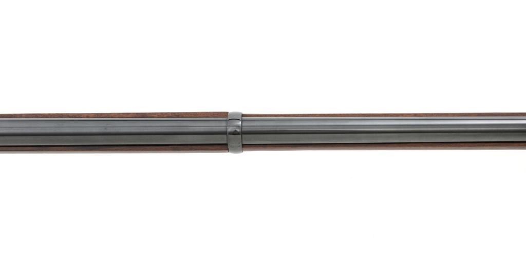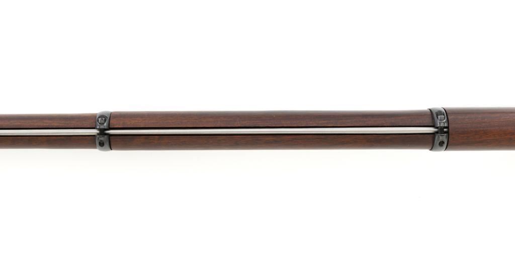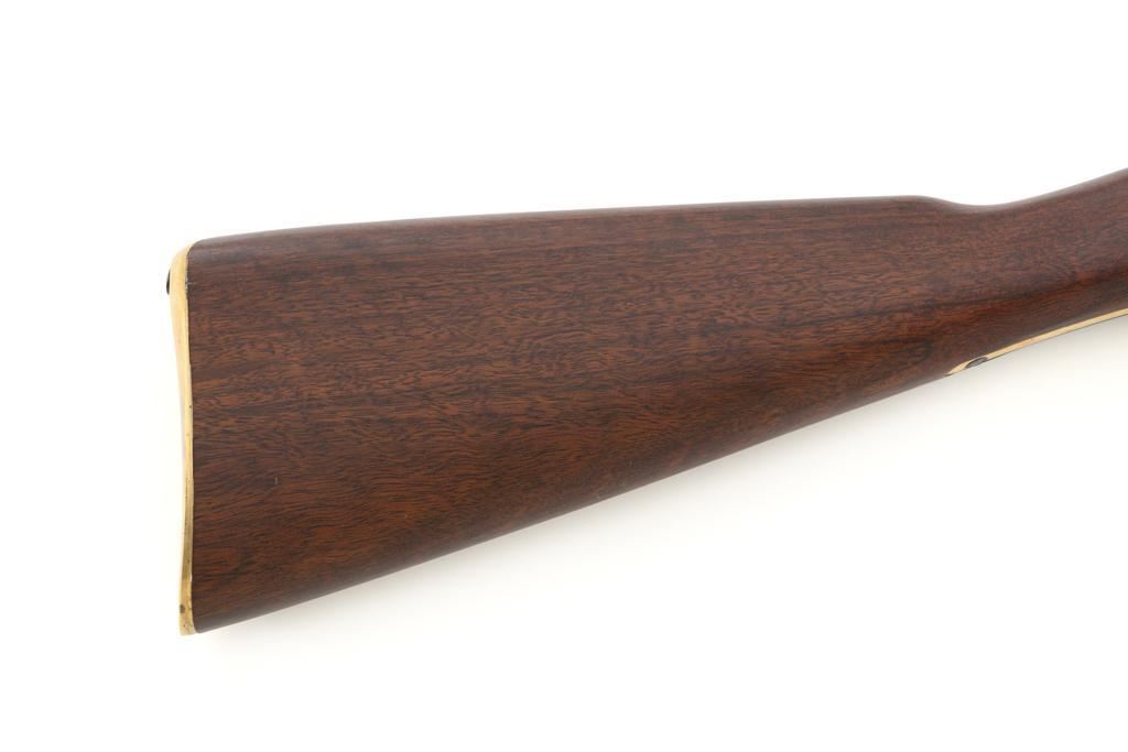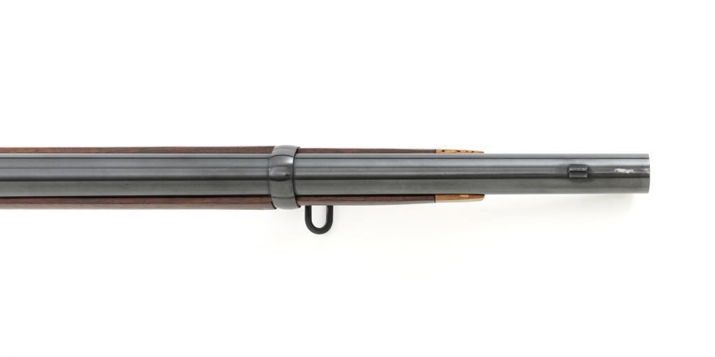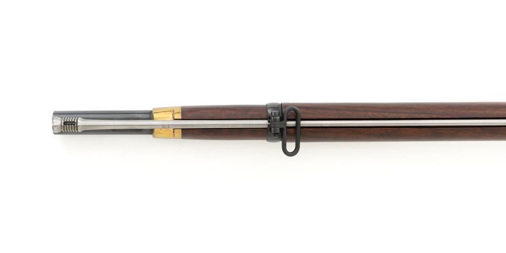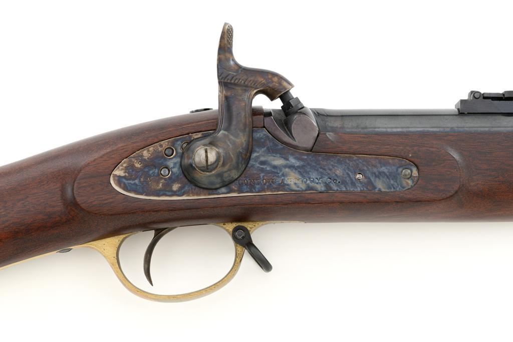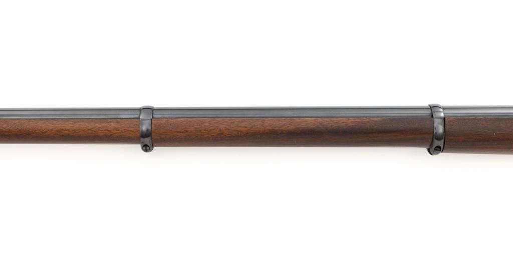 Euroarms America Pattern 1853 Enfield Rifled Musket, #31076, .577 cal., 39" round barrel with rifled bore, blued finish, hardwood stock with brass forend cap, trigger guard, and buttplate. Blade front sight and adjustable leaf rear sight with "V"-notched groove, graduated to 900 yards. An excellent condition steel rammer is mounted under the barrel. There are sling swivels mounted to the trigger guard and forend. Case hardened lock plate is marked "LONDON ARMORY Co." and there is a "(Crown)" stamped on the tail. Barrel in front of the rear sight is marked "EUROARMS OF AMERICA". Trigger guard rear tang is stamped "MADE IN ITALY". Condition overall is excellent, retaining approx. 98% factory blue, with a few spots of wear to the underside of the barrel at the muzzle. Lockplate retains vivid case colors and shows tiny surface scratches. Stock is excellent with light rub marks to the forend. Hammer operates smoothly and holds on half and full cock. Nipple appears to be in new condition. Bore is bright with excellent, well-defined rifling. Est.: $900-$1,200. (No FFL Required)