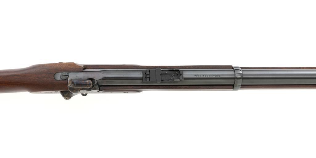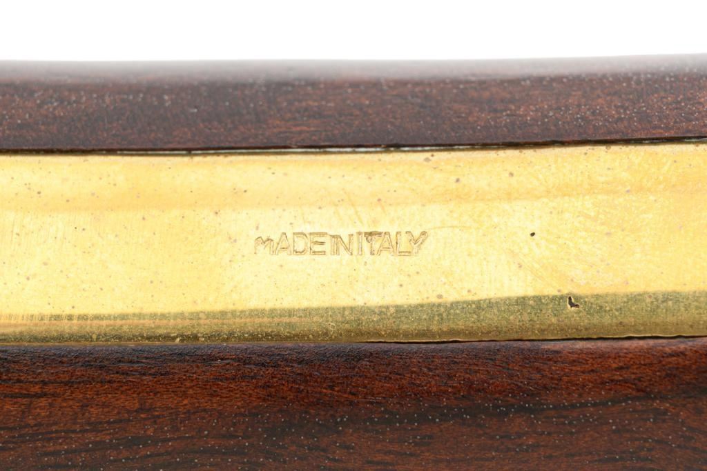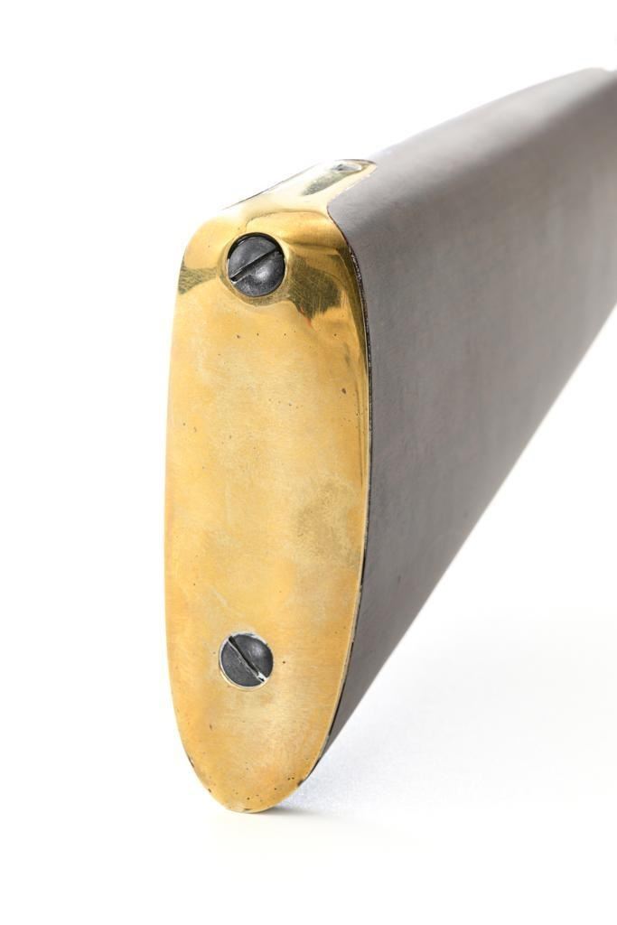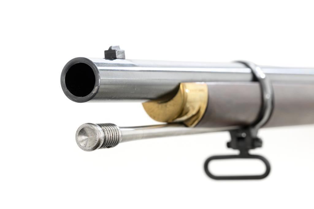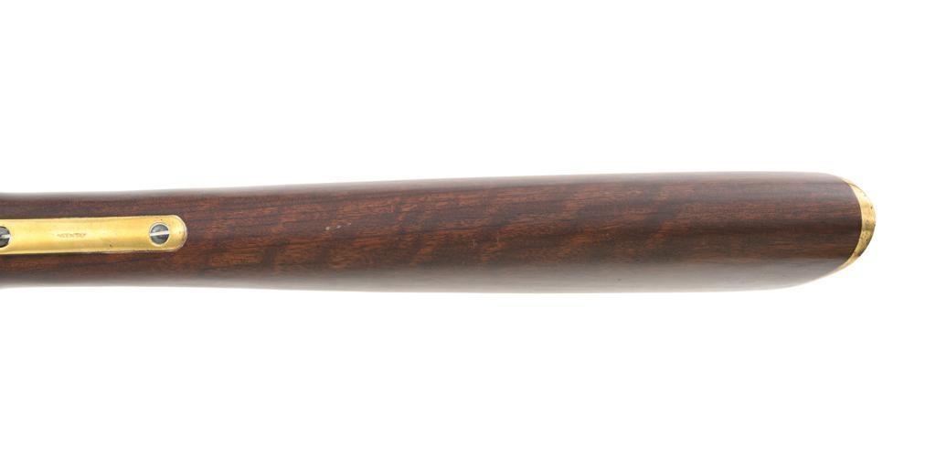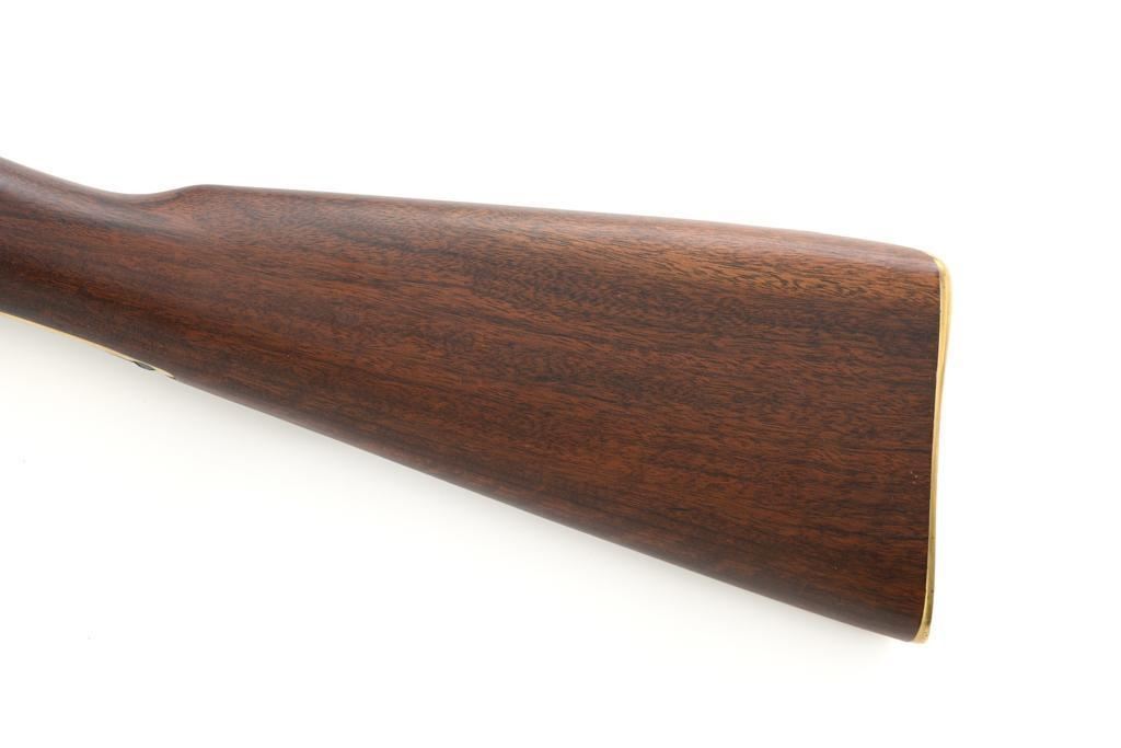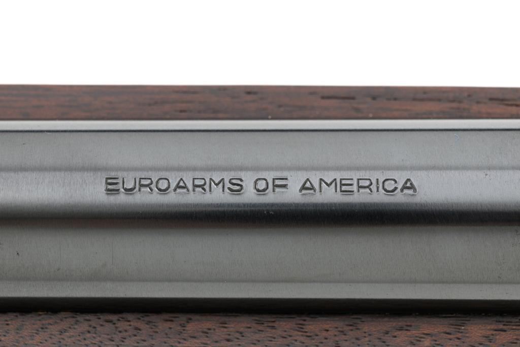 Euroarms America Pattern 1853 Enfield Rifled Musket, #31076, .577 cal., 39" round barrel with rifled bore, blued finish, hardwood stock with brass forend cap, trigger guard, and buttplate. Blade front sight and adjustable leaf rear sight with "V"-notched groove, graduated to 900 yards. An excellent condition steel rammer is mounted under the barrel. There are sling swivels mounted to the trigger guard and forend. Case hardened lock plate is marked "LONDON ARMORY Co." and there is a "(Crown)" stamped on the tail. Barrel in front of the rear sight is marked "EUROARMS OF AMERICA". Trigger guard rear tang is stamped "MADE IN ITALY". Condition overall is excellent, retaining approx. 98% factory blue, with a few spots of wear to the underside of the barrel at the muzzle. Lockplate retains vivid case colors and shows tiny surface scratches. Stock is excellent with light rub marks to the forend. Hammer operates smoothly and holds on half and full cock. Nipple appears to be in new condition. Bore is bright with excellent, well-defined rifling. Est.: $900-$1,200. (No FFL Required)