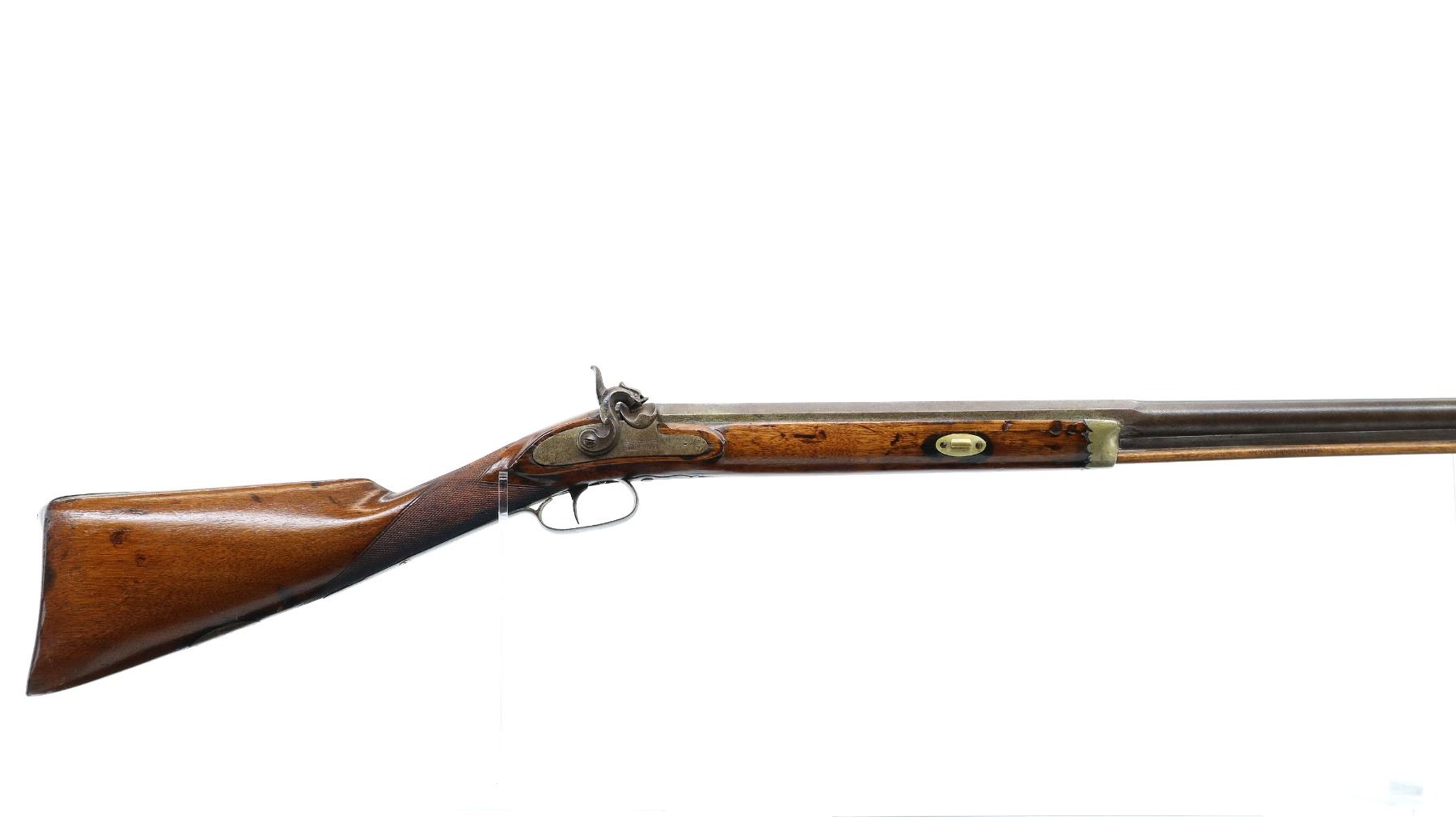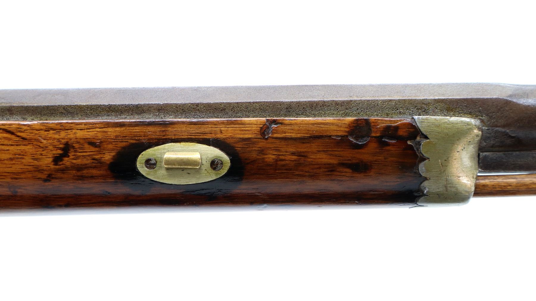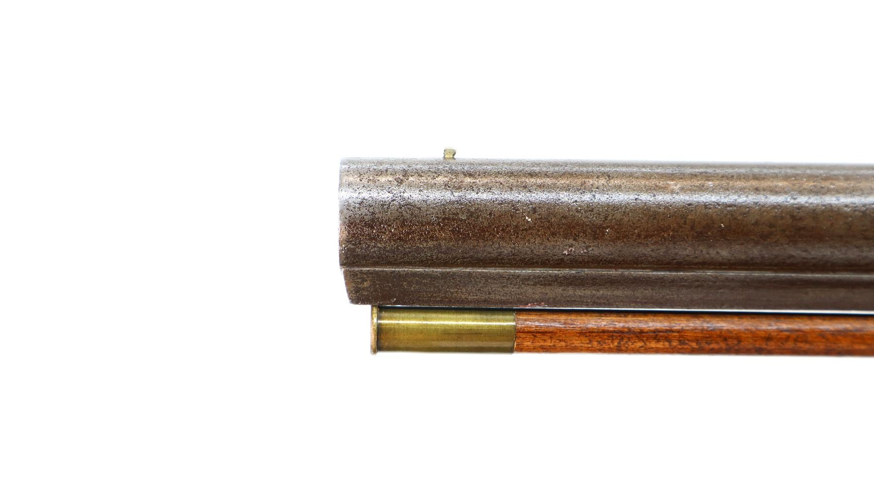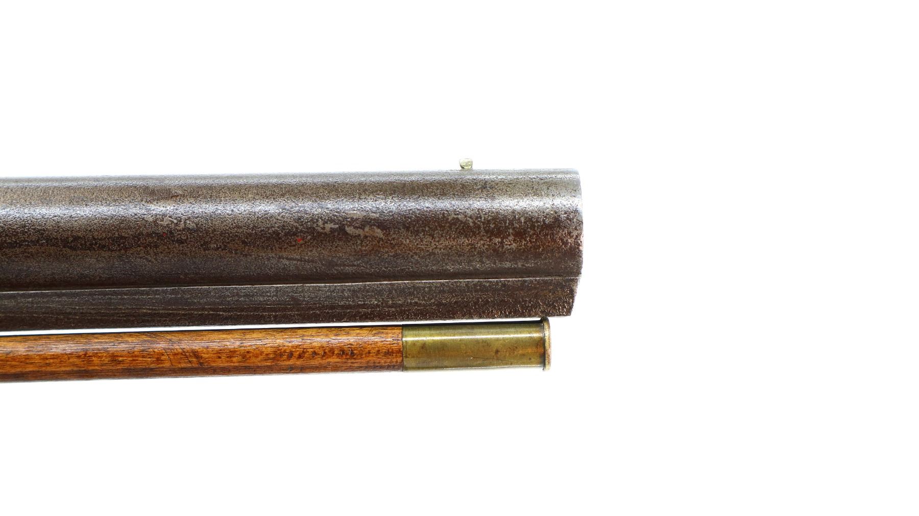Main Description: Brass bead, 1/3rd octagon, 2/3rd round heavy barrel, smooth lock with checkered spur hammer that functions but are slightly loose, single trigger. One piece half length wood stock, single forearm wedge, forend is chipped, cracked and repaired, checkered straight grip cracked and repaired through wrist, smooth steel butt plate, percussion cap box on bottom of stock, alloy nose cap, wood ramrod with brass tip.