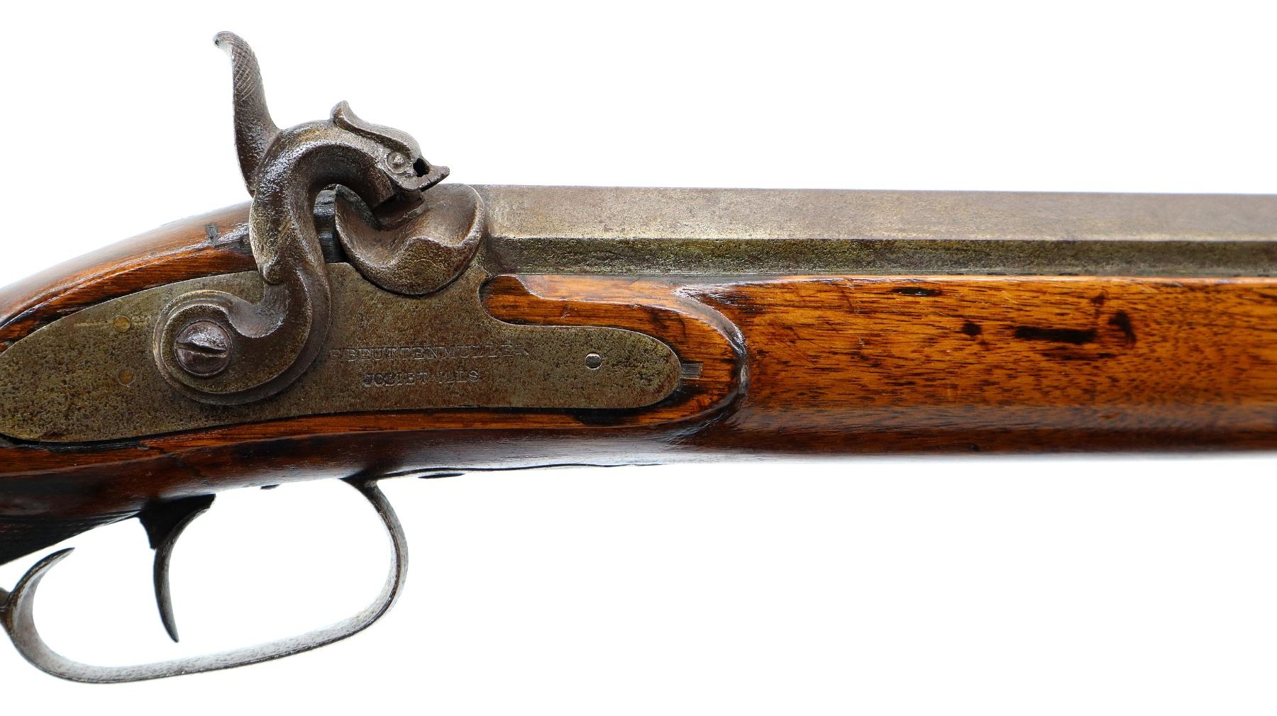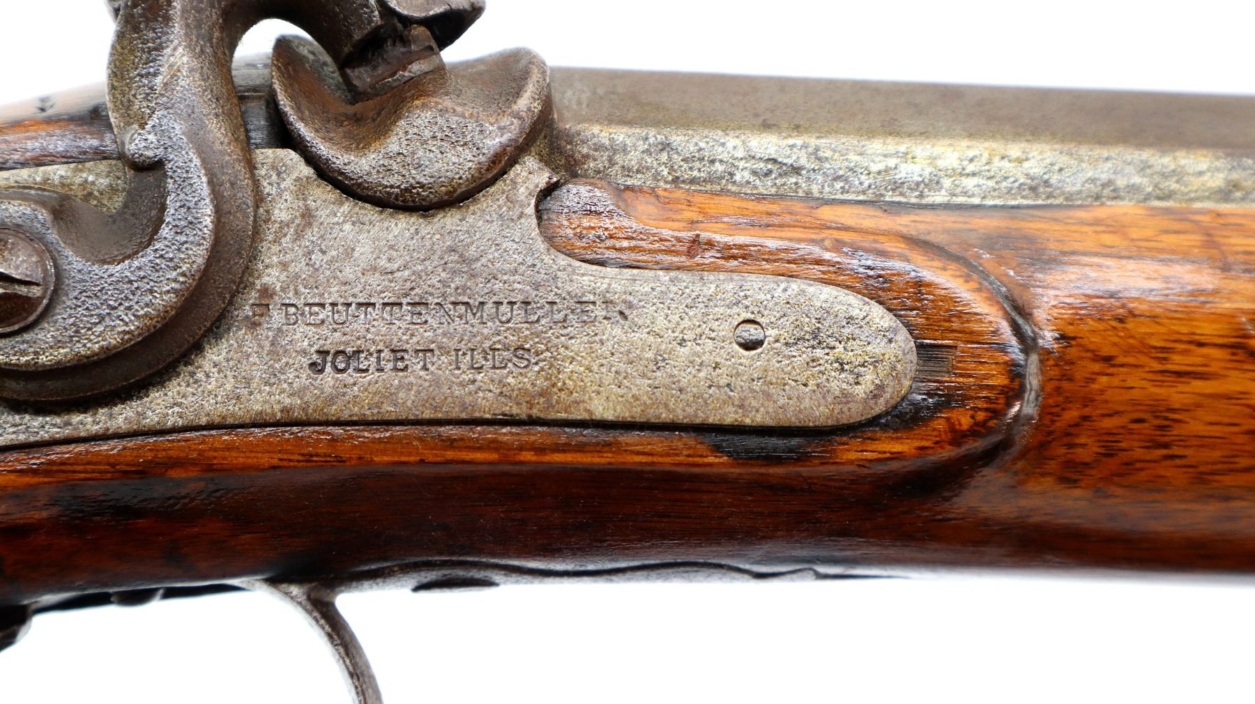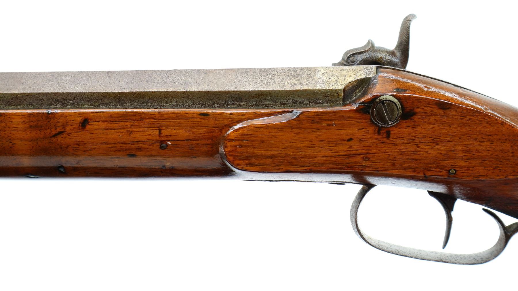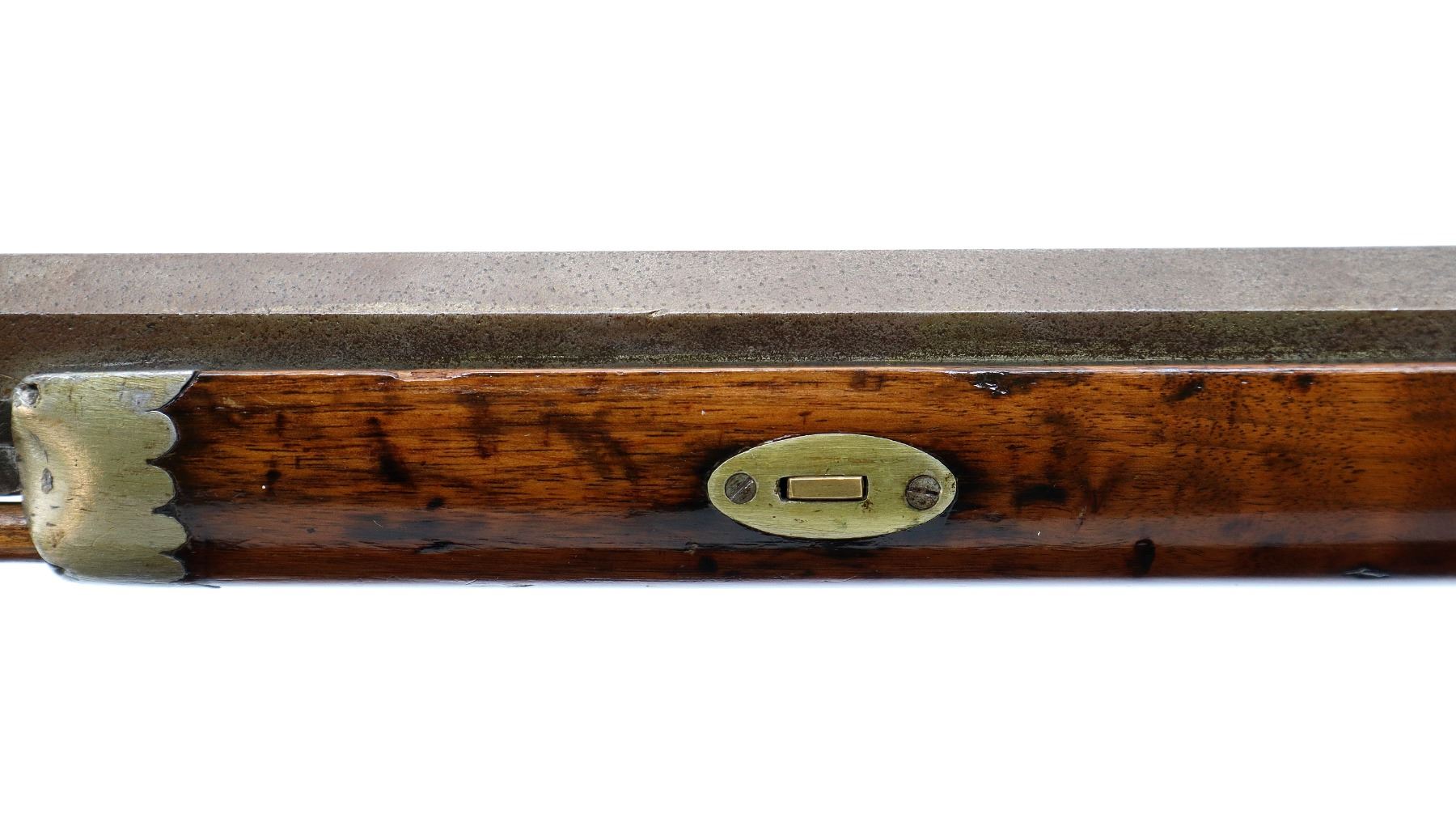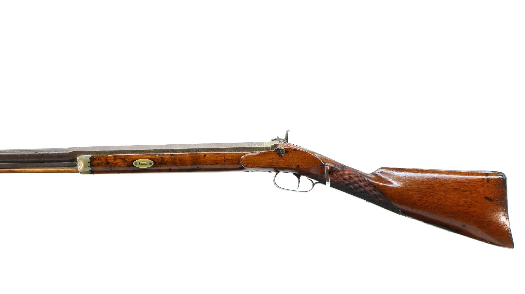 Main Description: Brass bead, 1/3rd octagon, 2/3rd round heavy barrel, smooth lock with checkered spur hammer that functions but are slightly loose, single trigger. One piece half length wood stock, single forearm wedge, forend is chipped, cracked and repaired, checkered straight grip cracked and repaired through wrist, smooth steel butt plate, percussion cap box on bottom of stock, alloy nose cap, wood ramrod with brass tip.