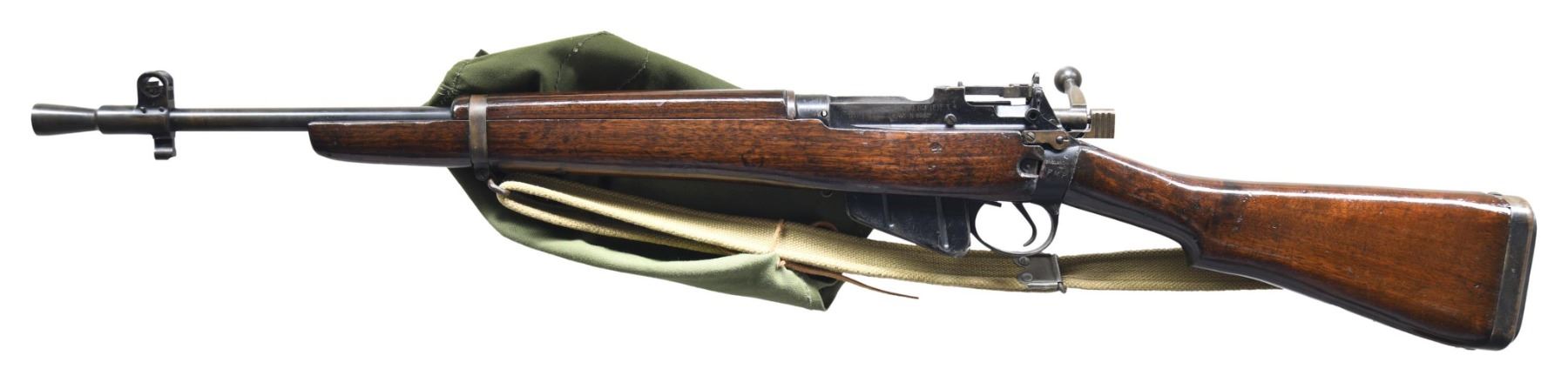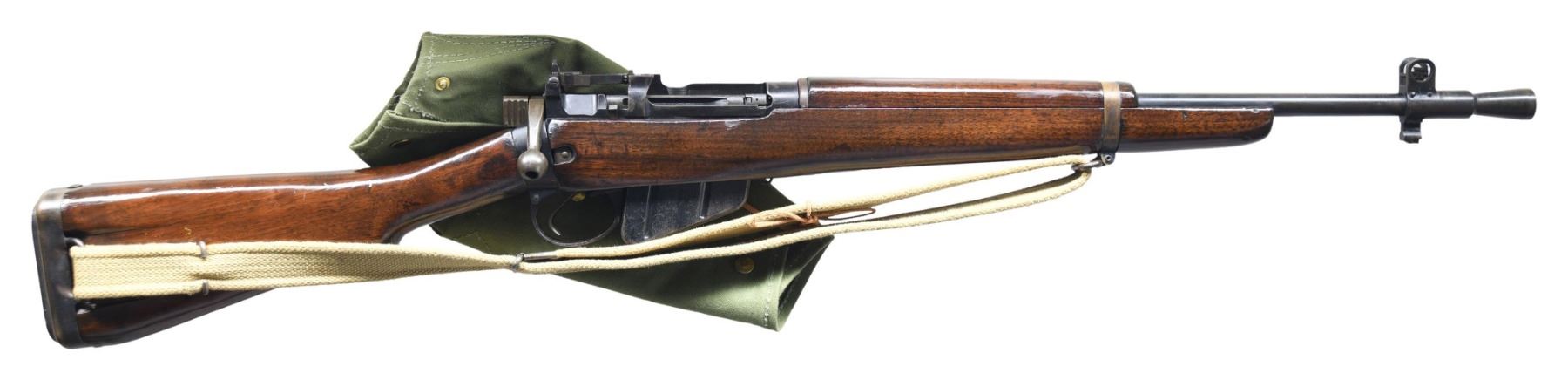 Cal. 303 Brit. S# N6932.Bbl. 20 1/2" including flash hider. Bbl. has British sale proofs. Blade front sight with protective ears. Ladder rear sight properly graduated to 800yds. Matching numbers on receiver, forend & bolt. Reciever ring has crown "BNP" proof. Left side of receiver has proper No. 5 MkI & ROF markings with an "FTR" rebuild marking, serial & 6/45 date. Left side of socket has "FMP" Malay Police & "ENGLAND" import markings. Carbine has proper lightning cuts. Suncorite marking. Hardwood stock set with bottom mounted sling swivels & 1944 dated canvas sling. MAGS: 1-10 rd. detachable & mismatched. UNATTACHED ACCESSORIES: 1951 dated C.D. & Co green canvas. CONDITION: refinished stock set has thickly added varnish with a few moderate gouges, scattered dings & handling marks. Metal retains 50% arsenal rework Suncorite finish with some touch up blue, scattered fading to gray, some oxidation, flaking & a few spots of light pitting. Action functions properly when hand cycled. Fair bore with scattered frosting & light pitting. (25-2152/MJC). CURIO. $500-700.