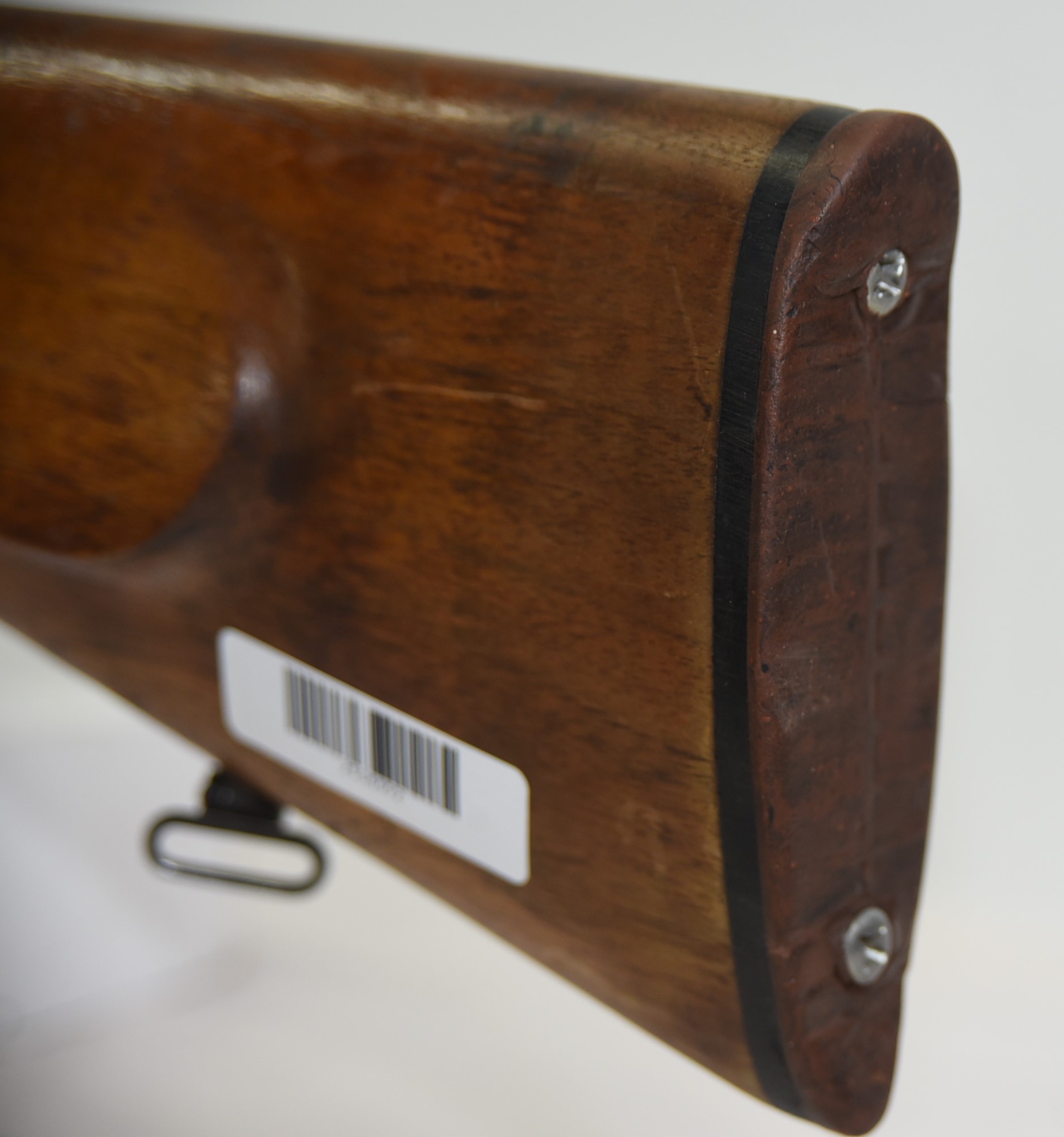 Wood stock shows some light scratches, butt plate has been cut thinner, dents, scuffs, fine hairline cracks in the grip area, light finish wear areas; condition is good.