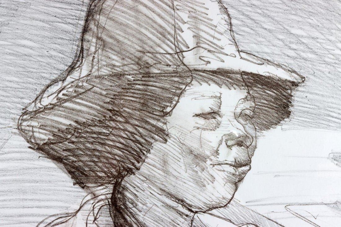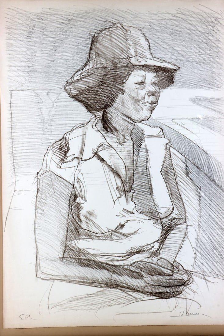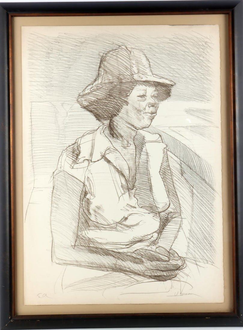 Pencil on paper portrait of female in pith hat, illegibly signed. Well executed piece measuring 21x30 inches, framed 26x35 inches. Can be removed from frame upon winning bidder's request to reduce shipping costs.