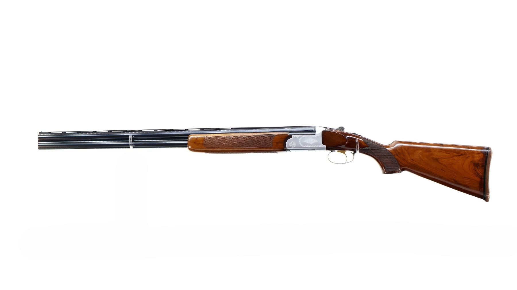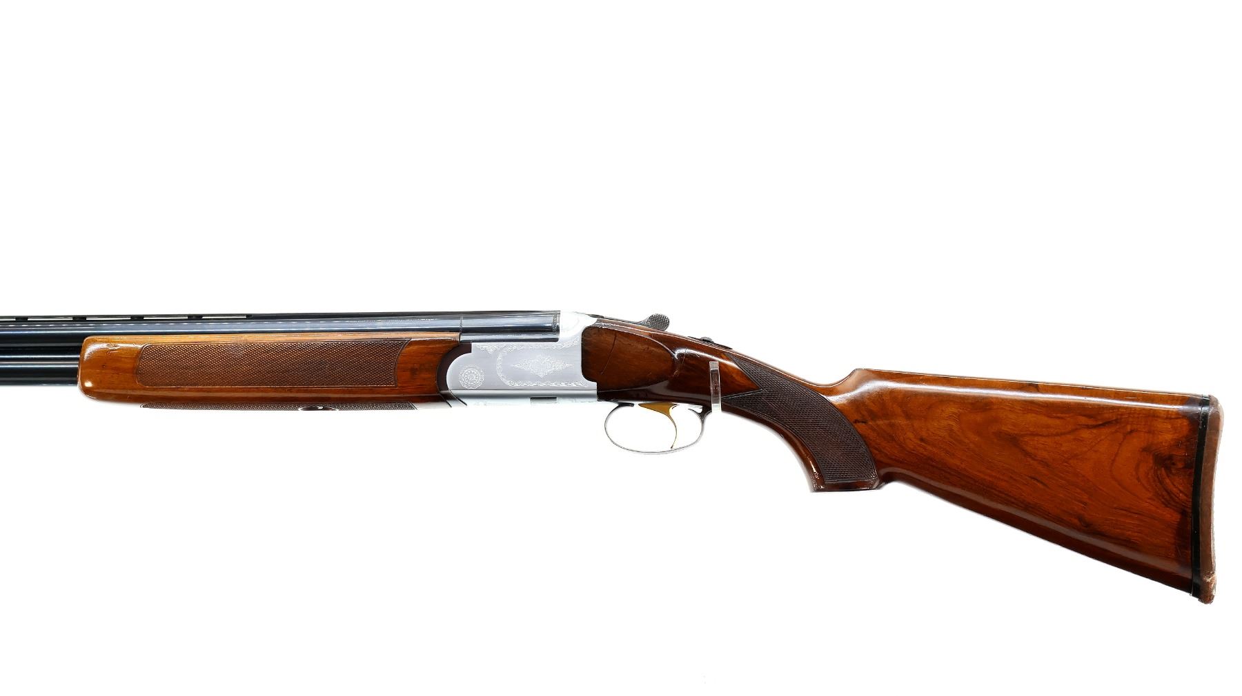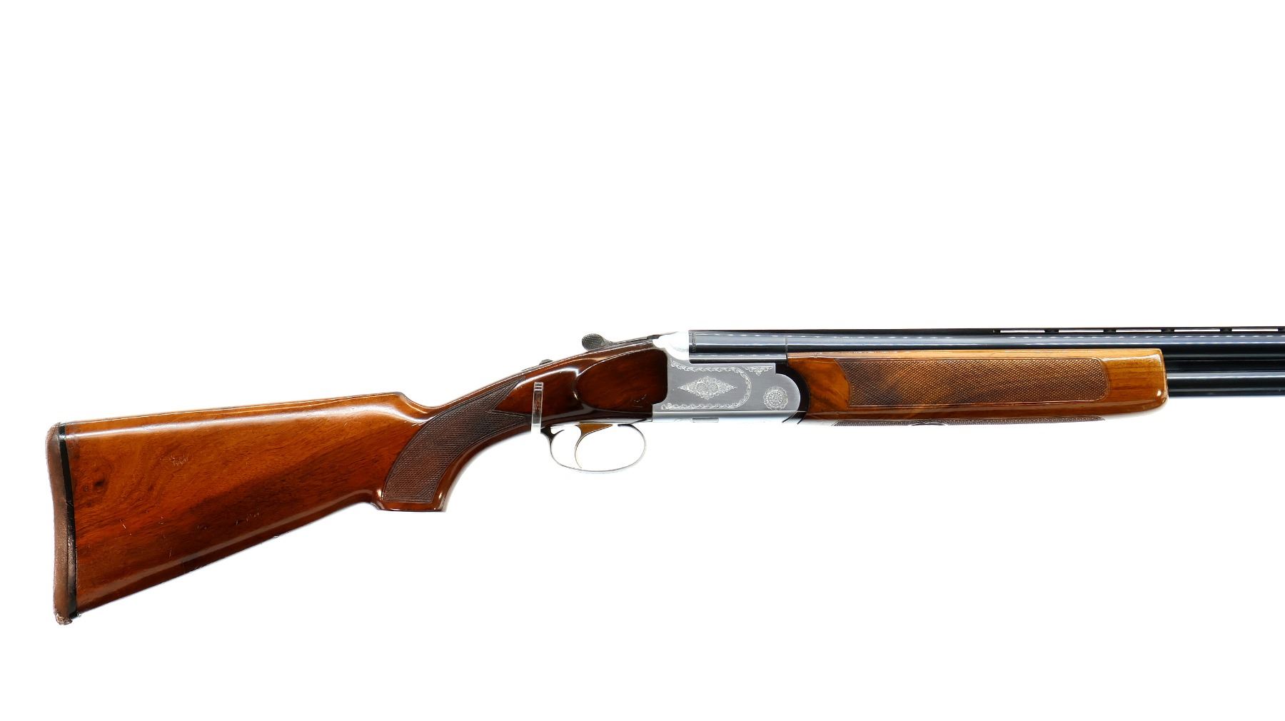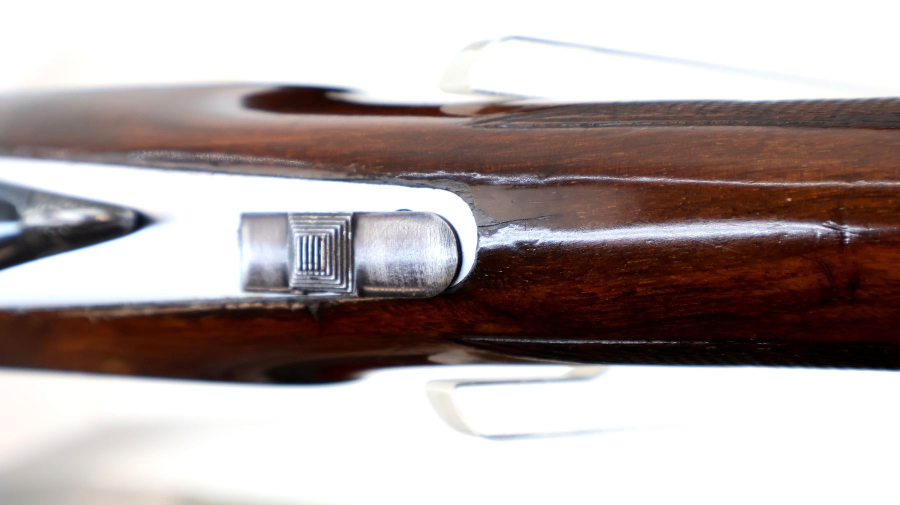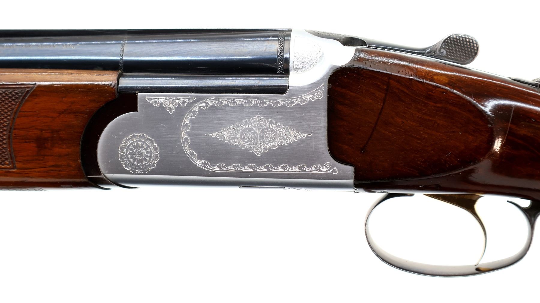 Main Description: Brass bead, blued vent rib barrels, silver engraved receiver, automatic selective safety, action does not function, requires adjustment parts or repair. Extractor single trigger. Two piece wood stocks, checkered forearm and pistol grip cracked behind receiver and tang, brown rubber recoil pad.