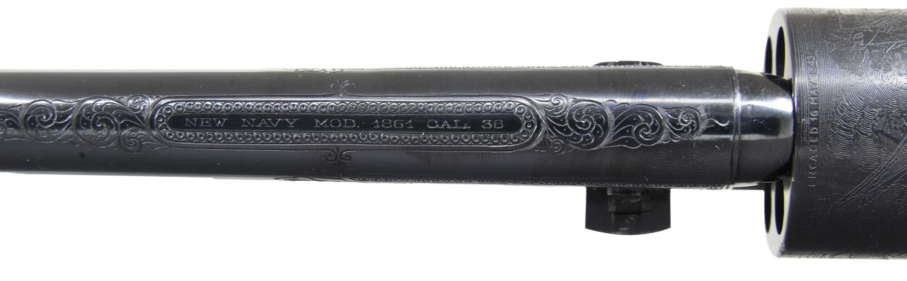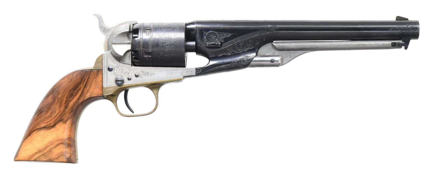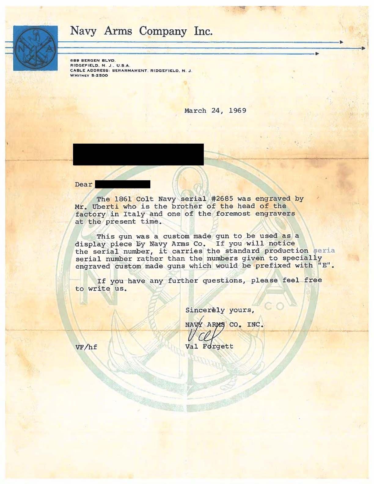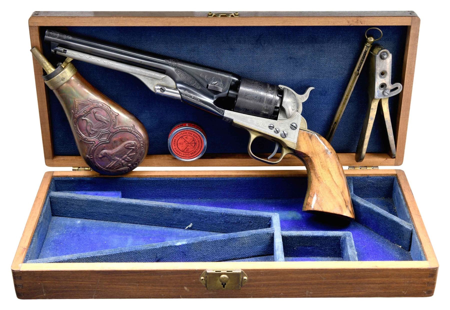 MODEL 1861 NAVY PERCUSSION REVOLVER. Cal. 36. S# 2685. Standard configuration, 7.5" round barrel. Revolver has blued barrel & cylinder, case colored loading assembly, frame, and hammer. Brass grip strap with high polish varnished burl grips. Cased and compartmented box with Navy arms mold and caps, and brass figural powder flask. UNATTACHED ACCESSORIES: 1969 letter from Navy Arms president Val Forgett stating this revolver was display gun engraved by Mr. Uberti, "one of the foremost engravers in Italy". CONDITION: fine-excellent overall, appears unfired with crisp action and minty bore. (01-26728/JS). ANTIQUE. $1,000-1,500.