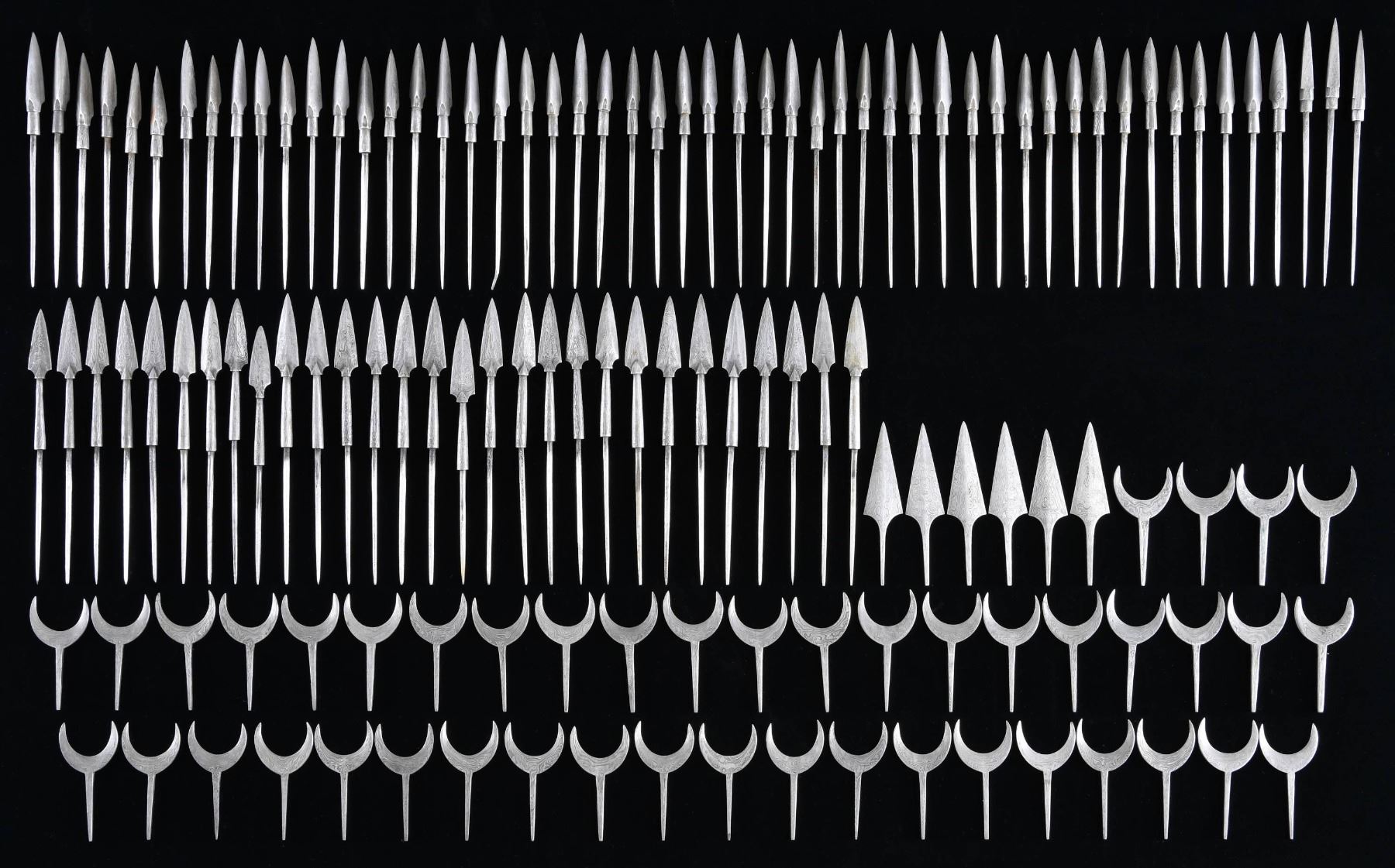 This lot contains approx. 137 exceptional arrowheads that are part of a group that were sold for years by Lewis Drake and Associates of Kentucky. They are high grade Damascus steel and were individually crafted by local artisans in India. Characteristics of these arrowheads may vary so we encourage you to examine the photographs for manufacturing details. CONDITION: all arrowheads are as manufactured and have never been attached to a shaft. PROVENANCE: from the renowned collection of quality sporting arms from Lewis Drake together with inventory of Lewis Drake Associates. (02-23565-37/BF). $500-800.