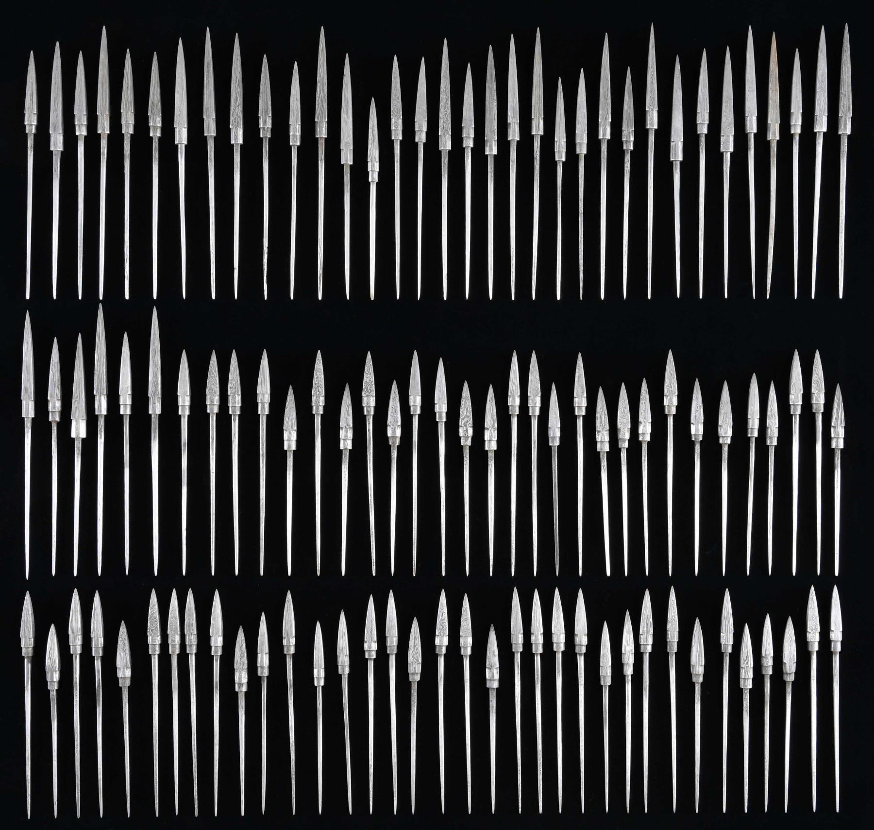 This lot contains approx. 106 exceptional arrowheads that are part of a group that were sold for years by Lewis Drake and Associates of Kentucky. They are high grade Damascus steel and were individually crafted by local artisans in India. Characteristics of these arrowheads may vary so we encourage you to examine the photographs for manufacturing details. CONDITION: all arrowheads are as manufactured and have never been attached to a shaft. PROVENANCE: from the renowned collection of quality sporting arms from Lewis Drake together with inventory of Lewis Drake Associates. (02-23565-32/BF). $400-700.