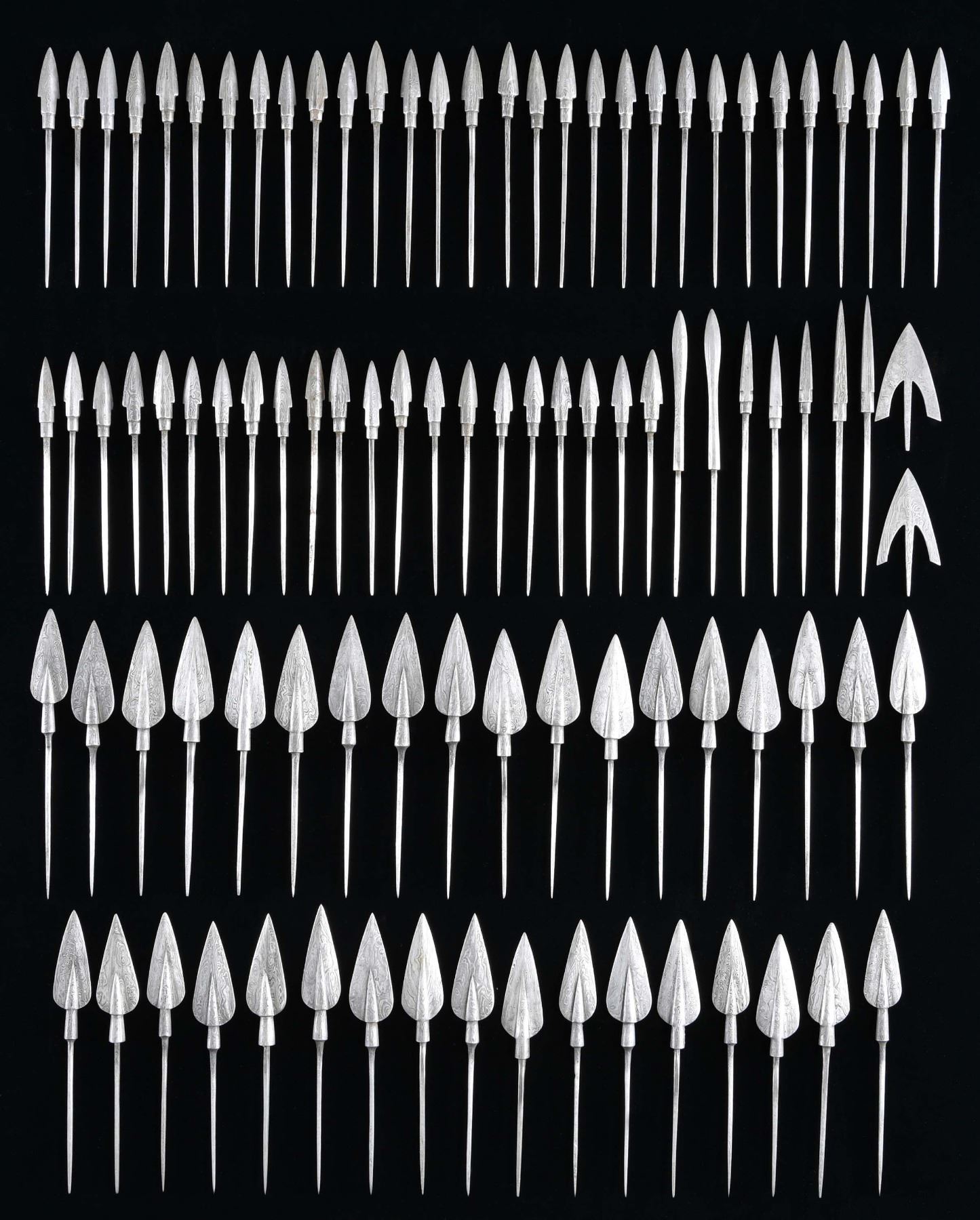 This lot contains approx. 97 exceptional arrowheads that are part of a group that were sold for years by Lewis Drake and Associates of Kentucky. They are high grade Damascus steel and were individually crafted by local artisans in India. Characteristics of these arrowheads may vary so we encourage you to examine the photographs for manufacturing details. CONDITION: all arrowheads are as manufactured and have never been attached to a shaft. PROVENANCE: from the renowned collection of quality sporting arms from Lewis Drake together with inventory of Lewis Drake Associates. (02-23565-36/BF). $400-700.