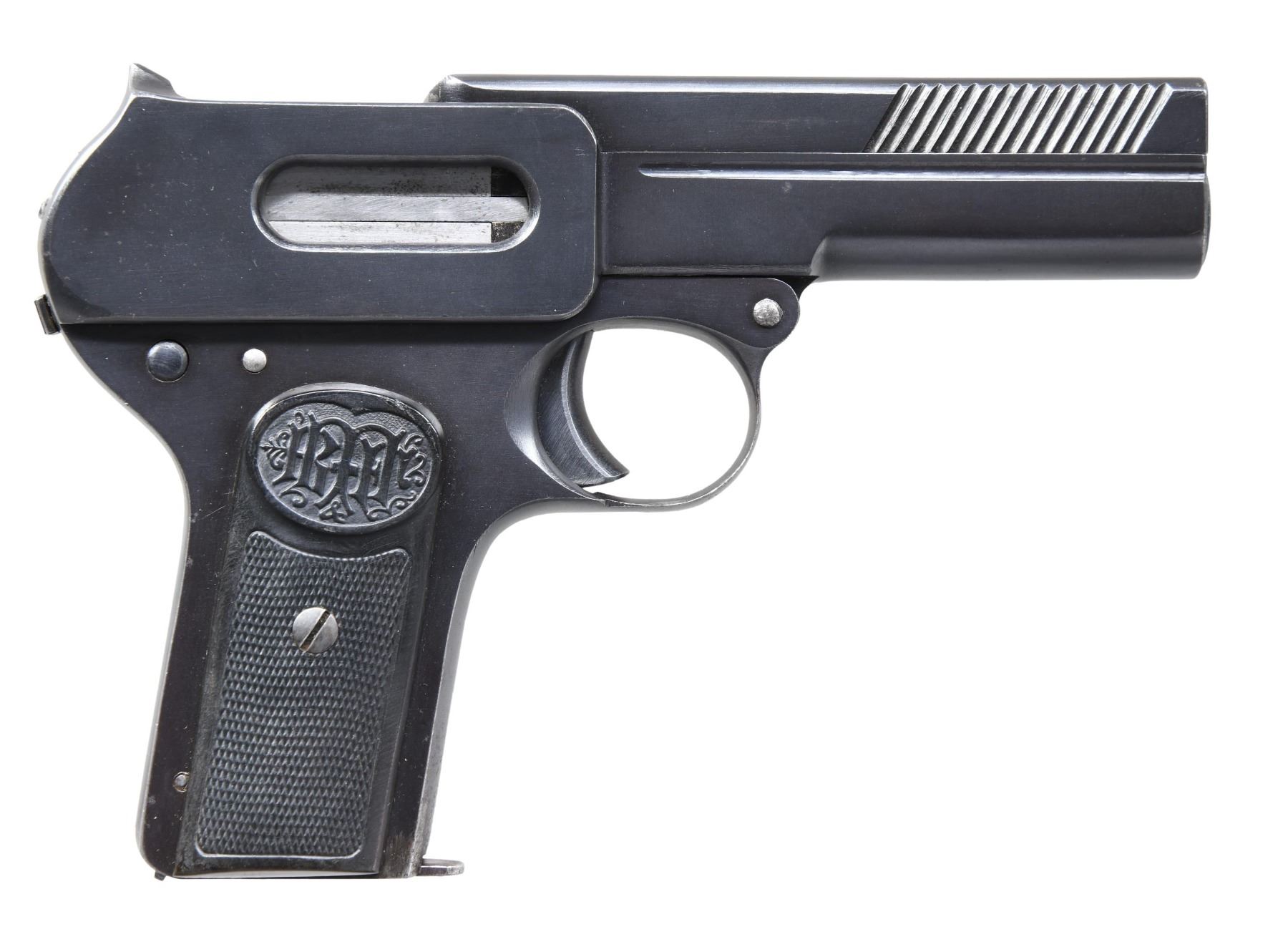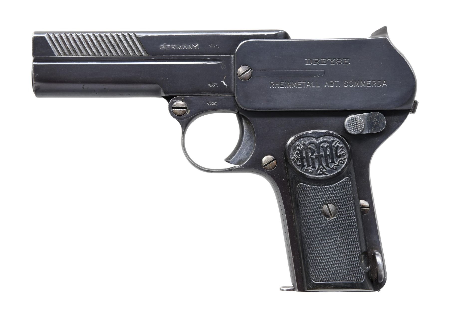 Cal. 7.65mm. S# 234095. bbl. 3 5/8". Model 1907 semi-automatic pistol mfg. by Dreyse. Left side of the frame is marked "DREYSE/ RHEINMETALL ABT SOMMERDA", with "GERMANY" marked on the left side of the bbl. Left side of the cocking piece, bbl., and frame exhibit a German Crown/N commercial nitro proof. Metal components exhibit a blue finish overall, save for on the bolt, which is polished in-the-white, as well as on the mag. release lever, which is nitre blued. Frame is mounted with 2-piece "RMF" monogram checkered black hard rubber grips. Cocking piece features a concave sight groove and a fixed blade front sight, with a fixed V-notch rear sight present on the frame. All serialized parts are matching, and include the frame, mag. release lever, bbl., and bolt. MAGS: 1 7-rd. CONDITION: fine, with metal components retaining bountiful amounts of their original factory rust blue finish, exhibiting a few spots of light edge wear, with some scattered spots of pinprick to light surface oxidation present overall. Front grip strap exhibits a small area of wear on the bottom right corner, with some spots of light surface oxidation present on both grip straps. Very bright bore, exhibiting consistent light pitting, while retaining strong rifling throughout. Grips show some superficial marks from handling and storage, but otherwise remain very good to excellent overall. An especially fine and attractive example of a Dreyse Model 1907 semi-automatic pistol. (25-2393/MLW). CURIO. $300-500.