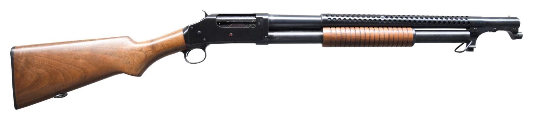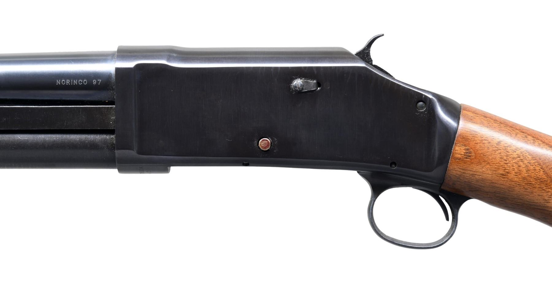 Cal. 12 GA, 2 3/4". S# 0206410. Bbl. 20". Model 97 pump action shotgun in a U.S. trench gun configuration, mfg. in China by Norinco and imported by "IAC". Left side of the bbl. is marked "NORINCO 97", with the cal. designation marked on the top, and IAC's importer information marked on the right. Right side of the receiver is marked "US" above a US style flaming ordnance bomb proof. Underside of receiver is marked "MADE IN CHINA/ MIL 6410". Metal components exhibit a blue finish overall. Plain wood pistol grip buttstock and grooved wood pump, with checkered black synthetic buttplate. Bbl. is fitted with a steel ventilated handguard, which features a bayonet lug and brass bead front sight. Matching numbers are present on the receiver and bbl. CONDITION: excellent, with metal components retaining bountiful amounts of their original factory blue finish, exhibiting some light wear and thinning on the mag. tube from cycling of the action. Mirror bore. Wood furniture shows a few marks from handling and storage, but otherwise remains sturdy and serviceable. (25-2144/MLW). MODERN. $600-1,200.