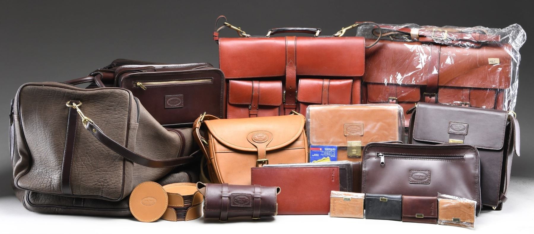 ASSOCIATES. This exceptional lot includes pieces that were once part of the inventory from the world famous hunting and safari outfitting firm of Lewis Drake and Associates. This particular lot includes 2 large travel bags that measure approx. 24" x 10" x 12" in height. They are made of buffalo hide and feature stout zippers on the top and sides. There are two handles for carrying along with a sturdy shoulder strap. All hardware appears to be brass and there is a debossed oval label on the side that reads "HANDCRAFTED Lewis Drake AND ASSOCIATES BUFFALO HIDE". / 2 toiletry bags measuring 11 1/2" x 4" x 7" high with a zipper on either side and the top. A sewn leather debossed tag reads "HANDCRAFTED Lewis Drake AND ASSOCIATES BUFFALO HIDE". / 2 leather holders containing 6 coasters each. All of the coasters are debossed "HANDCRAFTED Lewis Drake AND ASSOCIATES BUFFALO HIDE". / 2 over-the-shoulder document bags or briefcases measuring 17" x 11" x 3 1/2" in depth with a handle on top as well as a long shoulder strap. The interior is divided in two sections and the exterior has two pockets on the front. The inner top of the bag has a debossed leather label that reads "HANDCRAFTED Lewis Drake AND ASSOCIATES BUFFALO HIDE". / 2 over-the-shoulder square satchels measuring 10" x 10" x 3 1/2" deep. The exterior flap has a debossed leather label that reads "HANDCRAFTED Lewis Drake AND ASSOCIATES BUFFALO HIDE". / 3 leather secretaries for holding cards, papers, and possibly cash with markings on the interior or exterior that read "Lewis Drake". / 4 folding key holders that each hold 6 keys. The outside is debossed "Lewis Drake". / 1 roll-up tool pouch containing 4 chisels or gouges. The exterior has a debossed leather tag that reads "HANDCRAFTED ROOSEVELT AND DRAKE BUFFALO HIDE". / 1 over-the-shoulder pouch for small game or shotgun shells. The pouch features a latchable top flap and interchangeable cotton or leather shoulder straps. The exterior has an oval debossed label that reads "HANDCRAFTED ROOSEVELT AND DRAKE BUFFALO HIDE". CONDITION: all items are unused and as manufactured. Some items show light storage wear. PROVENANCE: from the renowned collection of quality sporting arms from Lewis Drake together with inventory of Lewis Drake Associates. (02-23565-42/BF). $700 – 1,100.