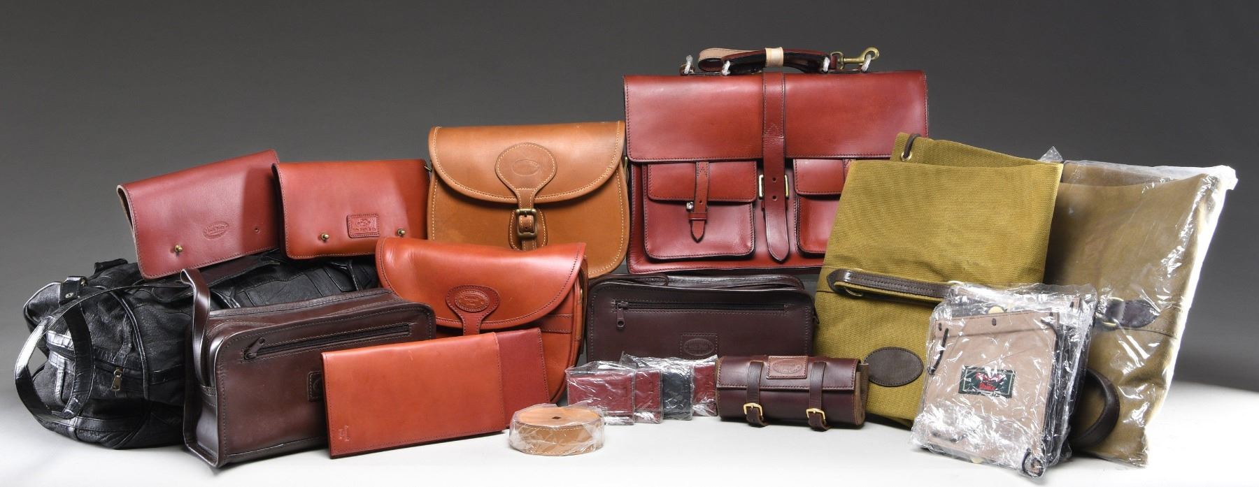ASSOCIATES. FINE QUALITY LEATHER GOODS FROM LEWIS DRAKE & ASSOCIATES. This exceptional lot includes pieces that were once part of the inventory from the world famous hunting and safari outfitting firm of Lewis Drake and Associates. This particular lot includes 1 travel or duffle bag that measures approx. 19 1/2" x 12" x 10" in height. It is made of elephant hide and features a zipper on the top and on each end with two handles on top for carrying along with a shoulder strap. / 2 toiletry bags measuring 11 1/2" x 4" x 7" high with a zipper on either side and the top. A sewn leather debossed tag reads "HANDCRAFTED Lewis Drake AND ASSOCIATES BUFFALO HIDE". / 1 leather holder containing 6 coasters. All of the coasters are debossed "HANDCRAFTED Lewis Drake AND ASSOCIATES BUFFALO HIDE". / 1 over-the-shoulder document bag or briefcase measuring 17" x 11" x 3 1/2" in depth with a handle on top as well as a long shoulder strap. The interior is divided in two sections and the exterior has two pockets on the front. The inner top of the bag has a debossed leather label that reads "HANDCRAFTED Lewis Drake AND ASSOCIATES BUFFALO HIDE". / 2 canvas duffle bags with a carrying handle and over-the-shoulder strap. All fittings are brass and on one bag the canvas has an oval debossed label that reads "HANDCRAFTED Lewis Drake AND ASSOCIATES BUFFALO HIDE". / 2 leather secretaries for holding cards, papers, and possibly cash with markings on the interior or exterior that read "Lewis Drake". / 4 folding key holders that each hold 6 keys. The outside is debossed "Lewis Drake". / 1 roll-up tool pouch containing 4 chisels or gouges. The exterior has a debossed leather tag that reads "HANDCRAFTED ROOSEVELT AND DRAKE BUFFALO HIDE". / 2 over-the-shoulder pouches for small game or shotgun shells. The pouches feature a latchable top flap and a leather shoulder strap. The exterior has an oval debossed label that reads "HANDCRAFTED ROOSEVELT AND DRAKE BUFFALO HIDE". / 2 cartridge pouches for the belt that hold 10 large caliber rifle rounds each. One has a label on the front flap that reads "HANDCRAFTED Lewis Drake AND ASSOCIATES BUFFALO HIDE". This pouch is missing one of the closing finials. The other pouch has both finials and the label is debossed "John Rigby & Co.". / 5 forearm guards, likely for use with a bow and arrow. CONDITION: all items are unused and as manufactured unless otherwise noted. Some items show light storage wear. PROVENANCE: from the renowned collection of quality sporting arms from Lewis Drake together with inventory of Lewis Drake Associates. (02-23565-43/BF). $500-900.
